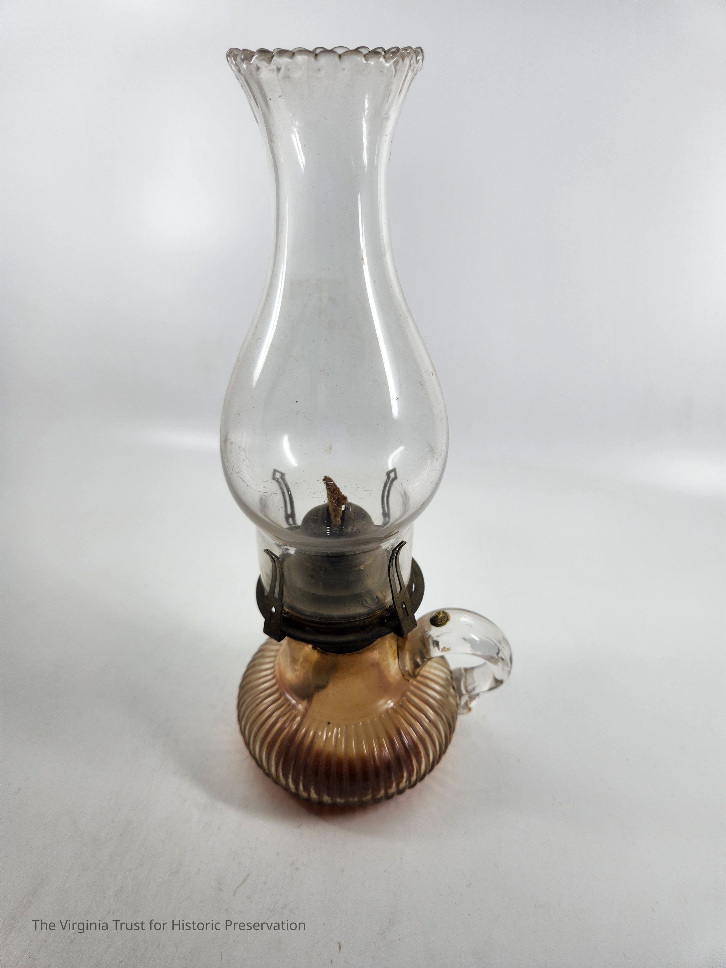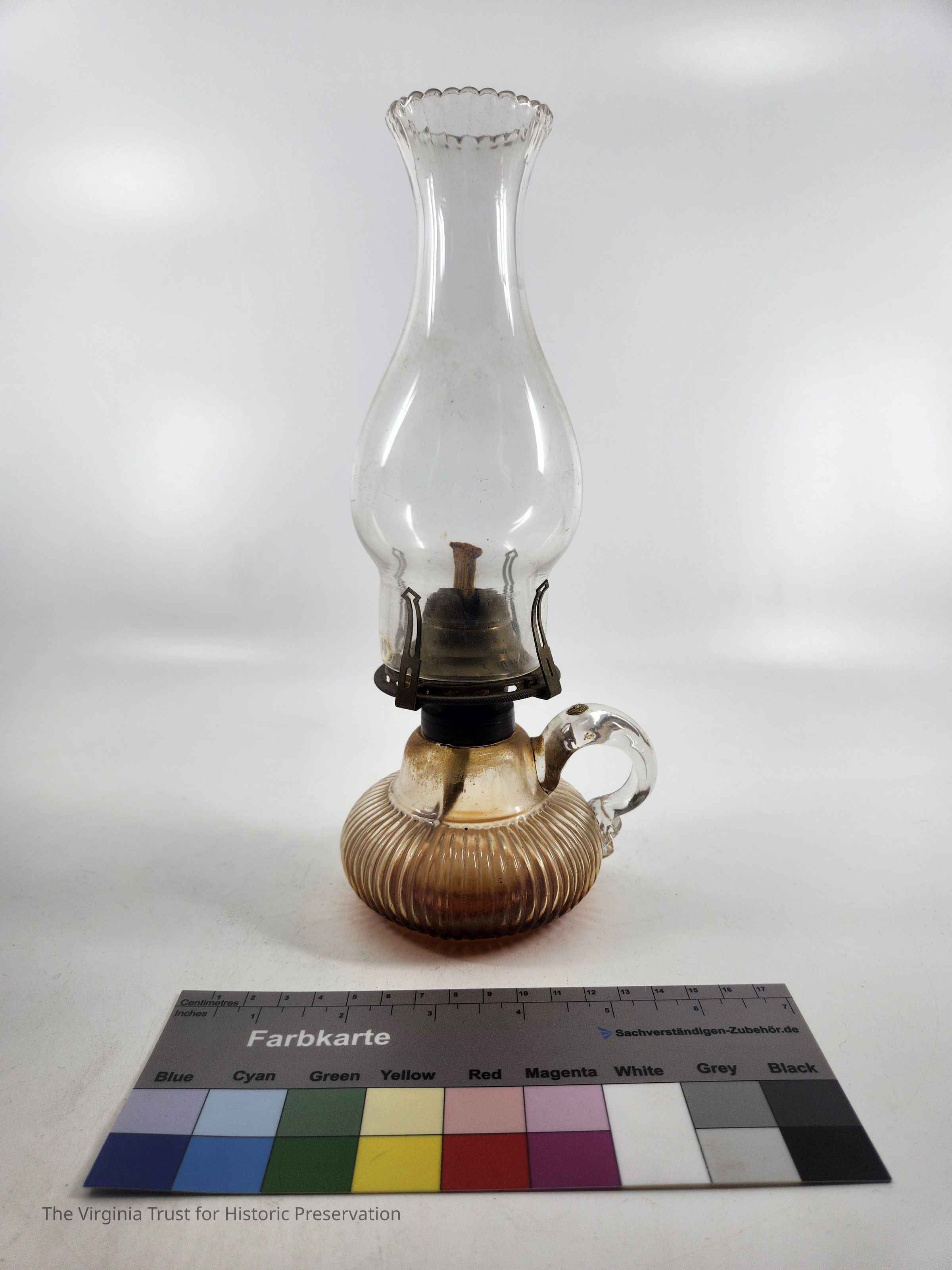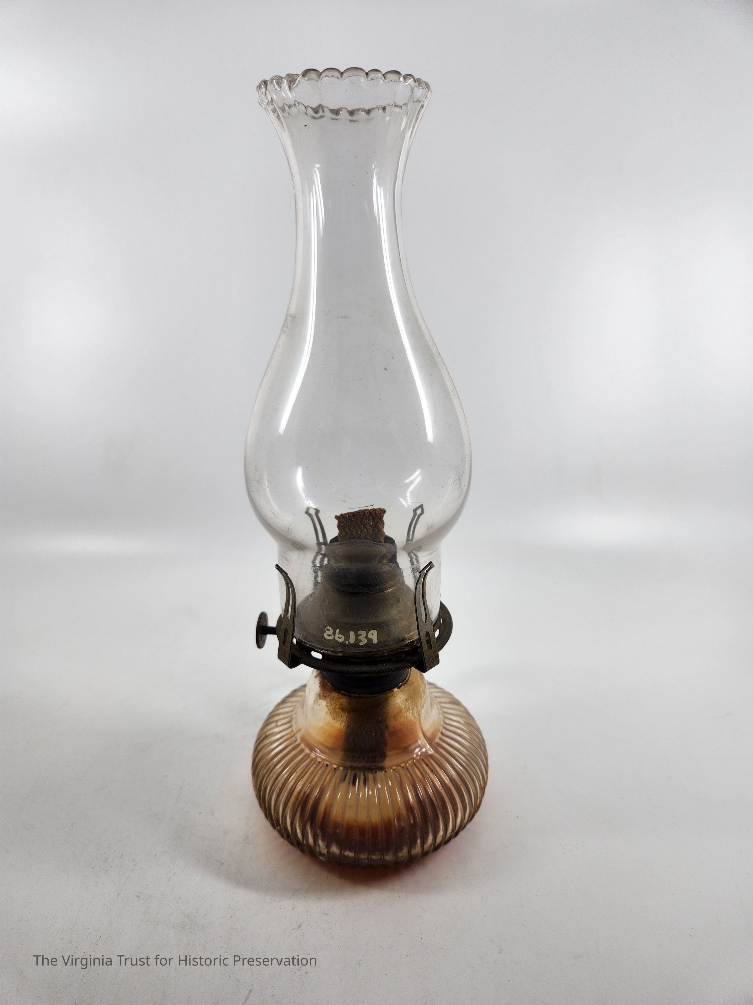 Oil lamp with chimney. Three mold form. Fluted. Chimney has scalloped edging, pressed design. Wick still in place. Chamber type with handles.Dimensions