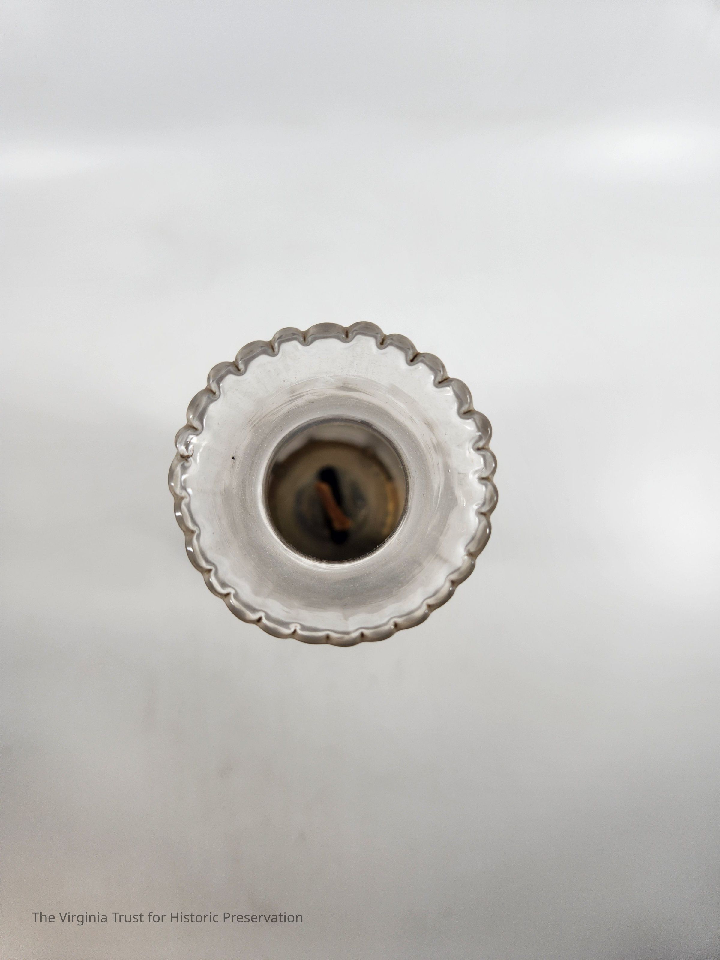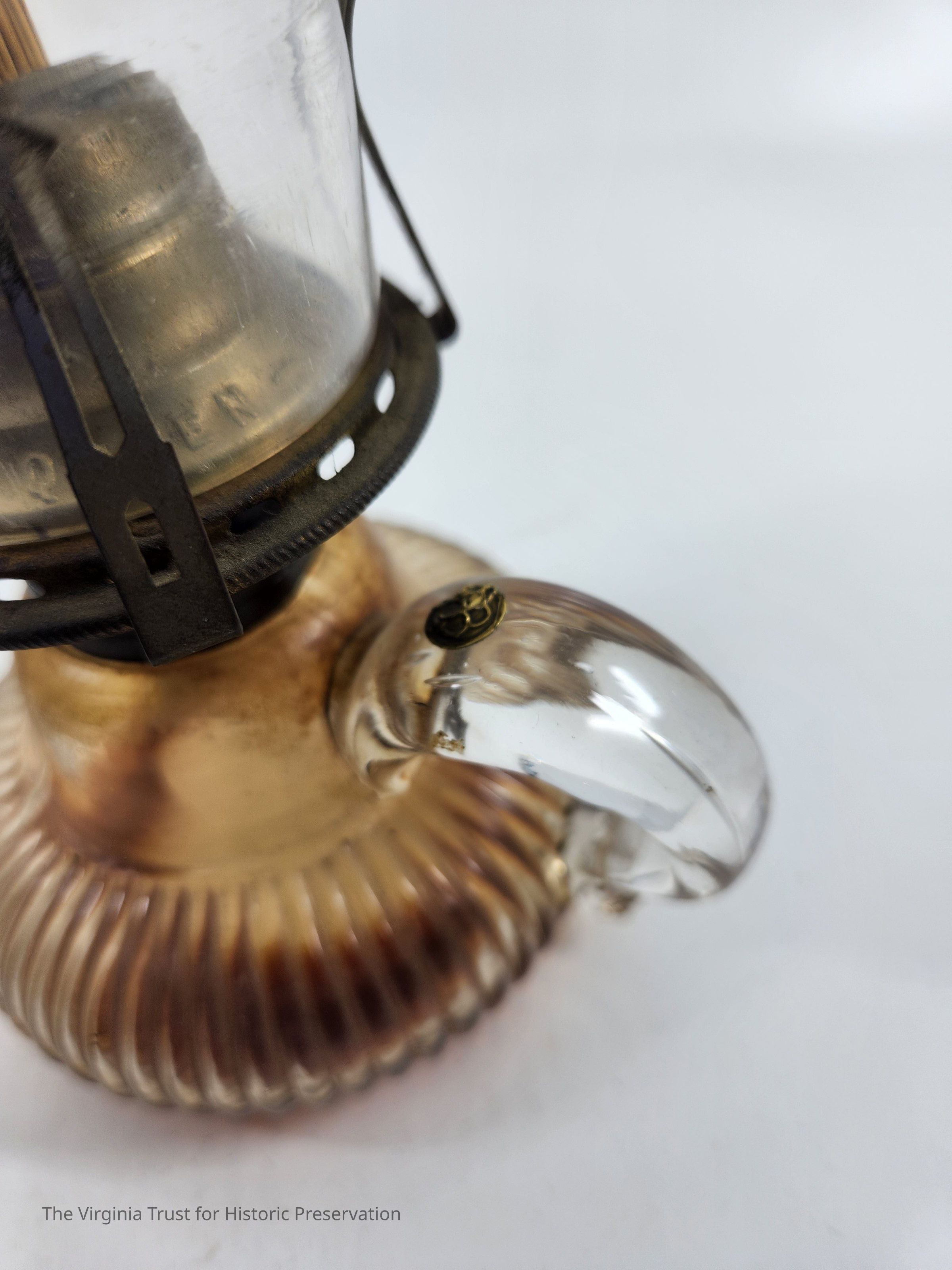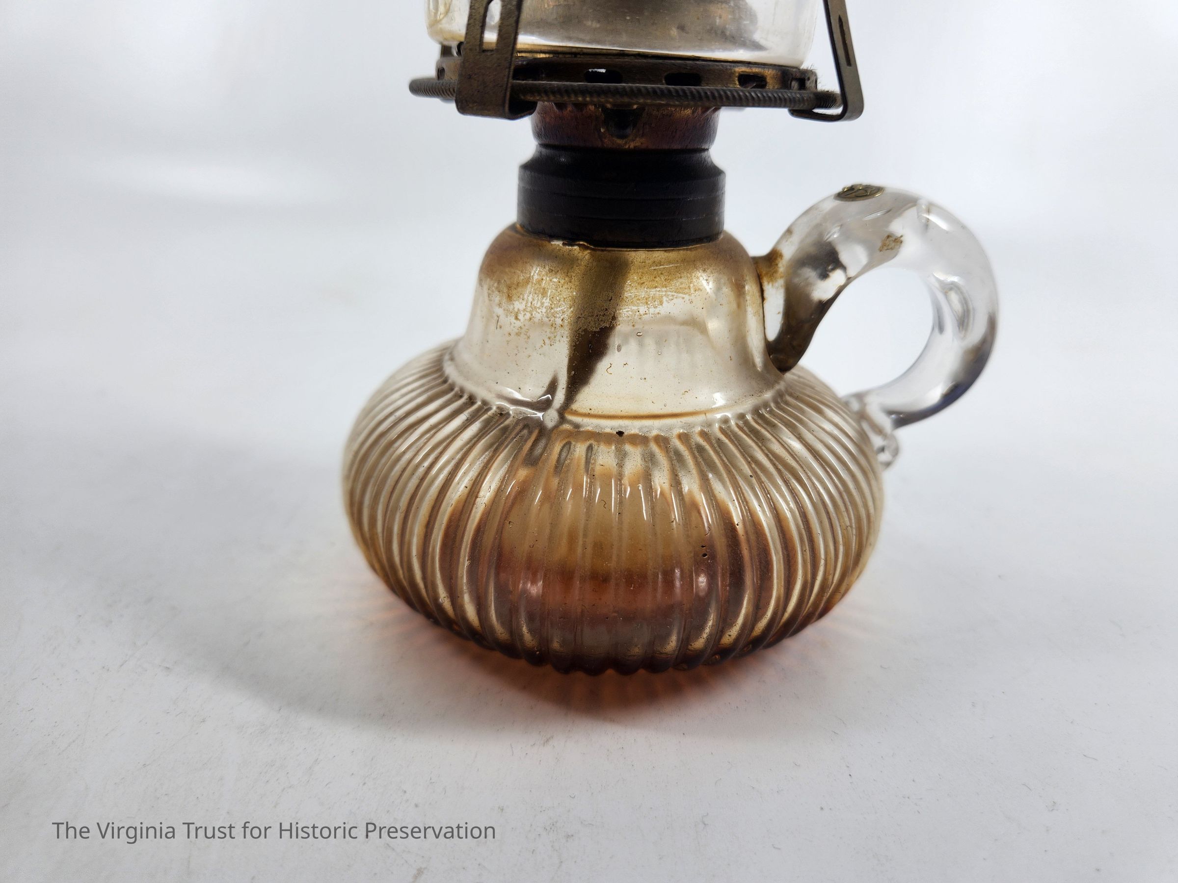 Oil lamp with chimney. Three mold form. Fluted. Chimney has scalloped edging, pressed design. Wick still in place. Chamber type with handles.Dimensions