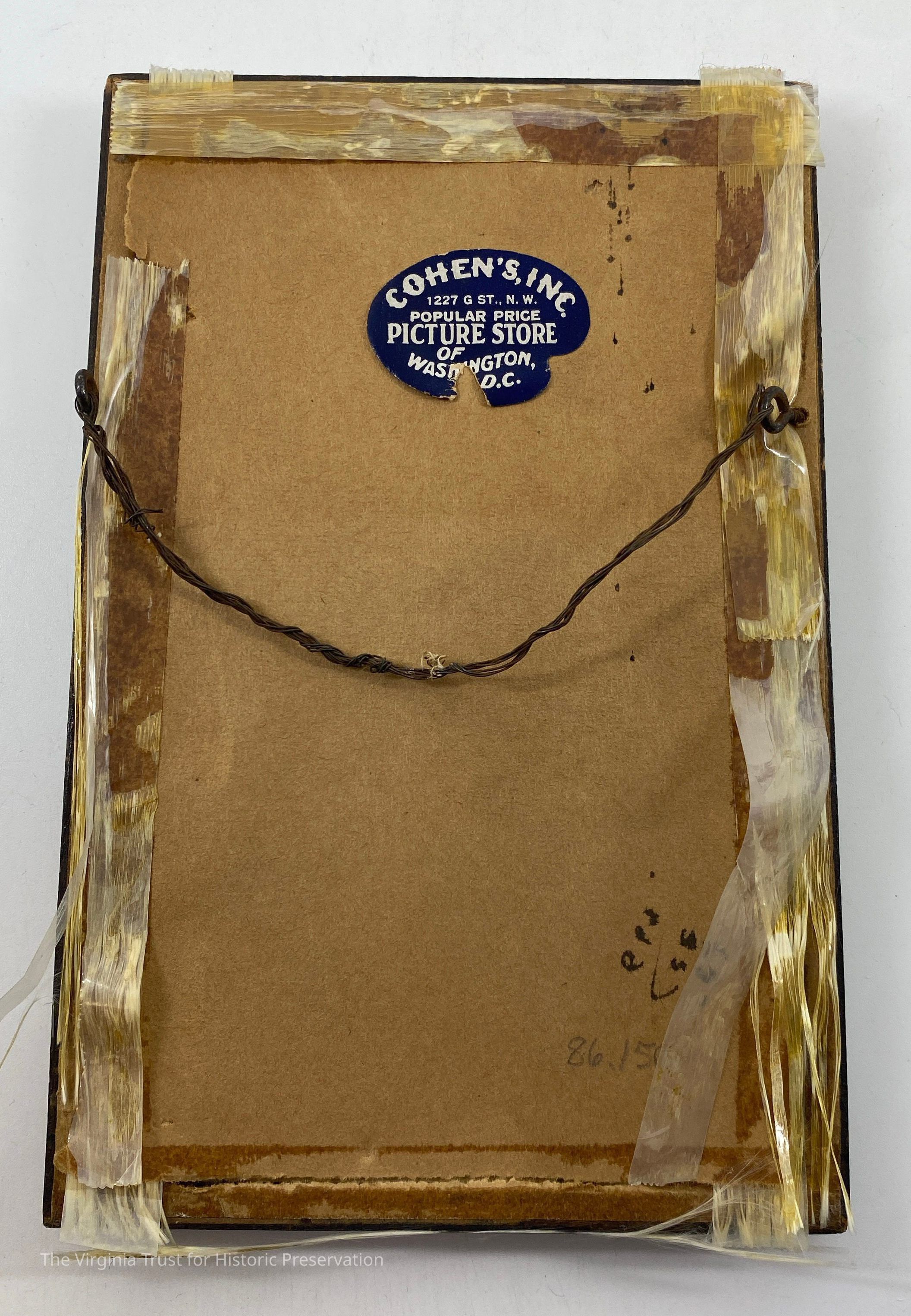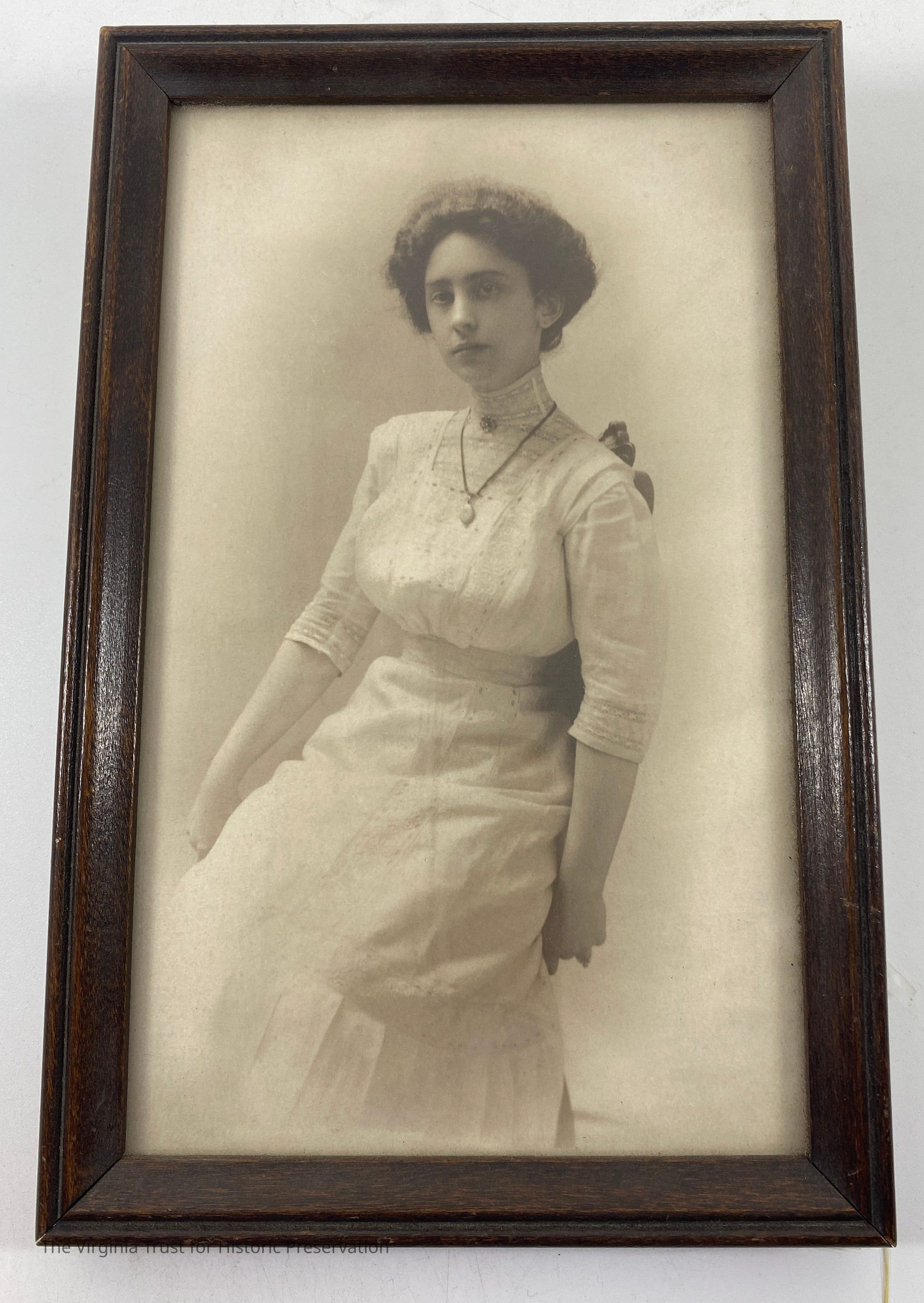 Framed photograph of a young woman in Victorian dress, brown paper has been taped to the back of the frame and carries a sticker from Cohen's INC., 1227 G Street, NW.Dimensions