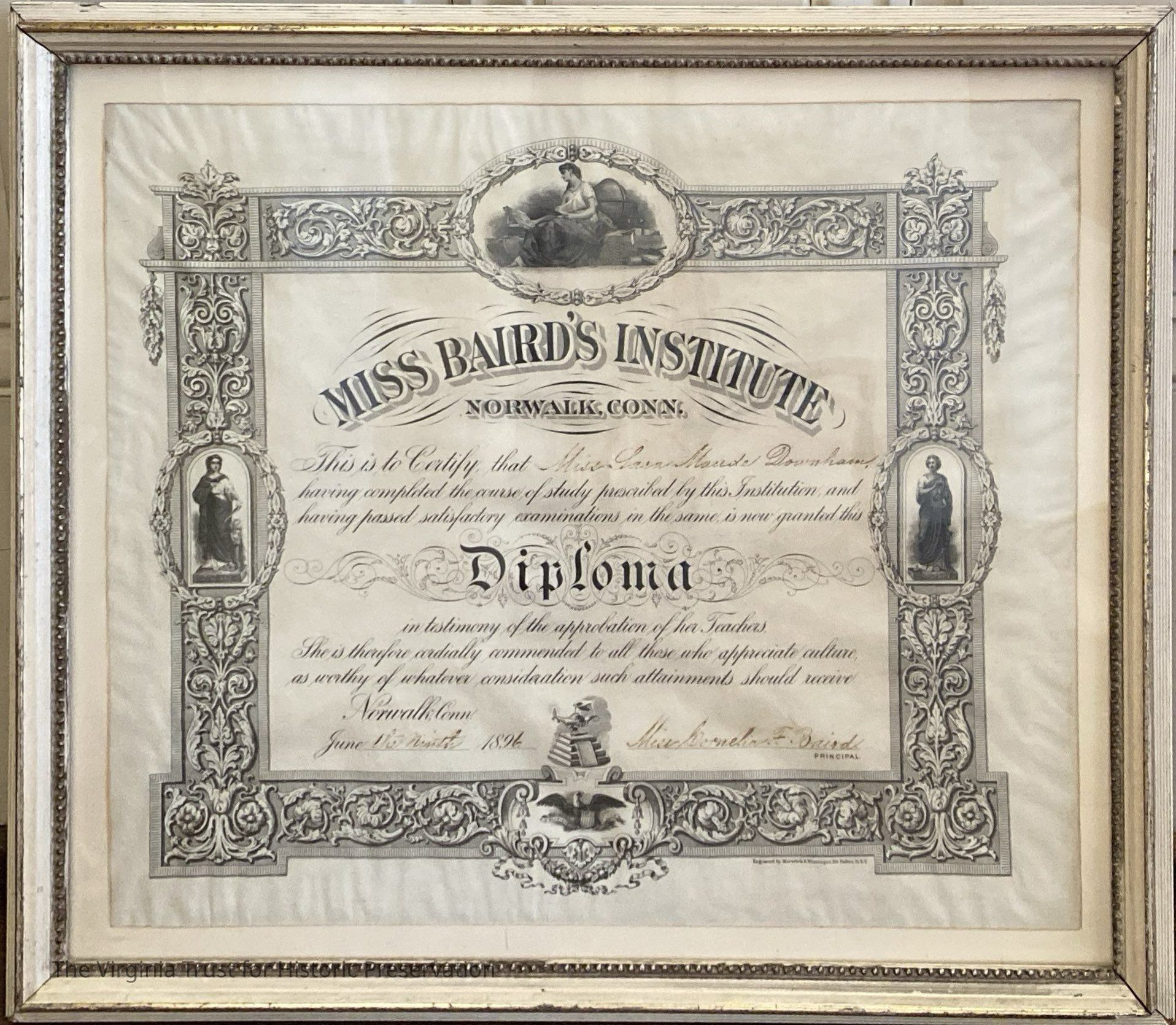 Graduation certificate from Miss Baird's Institute on June 9, 1894 for Sara Maude Downham. Painted frame.Dimensions