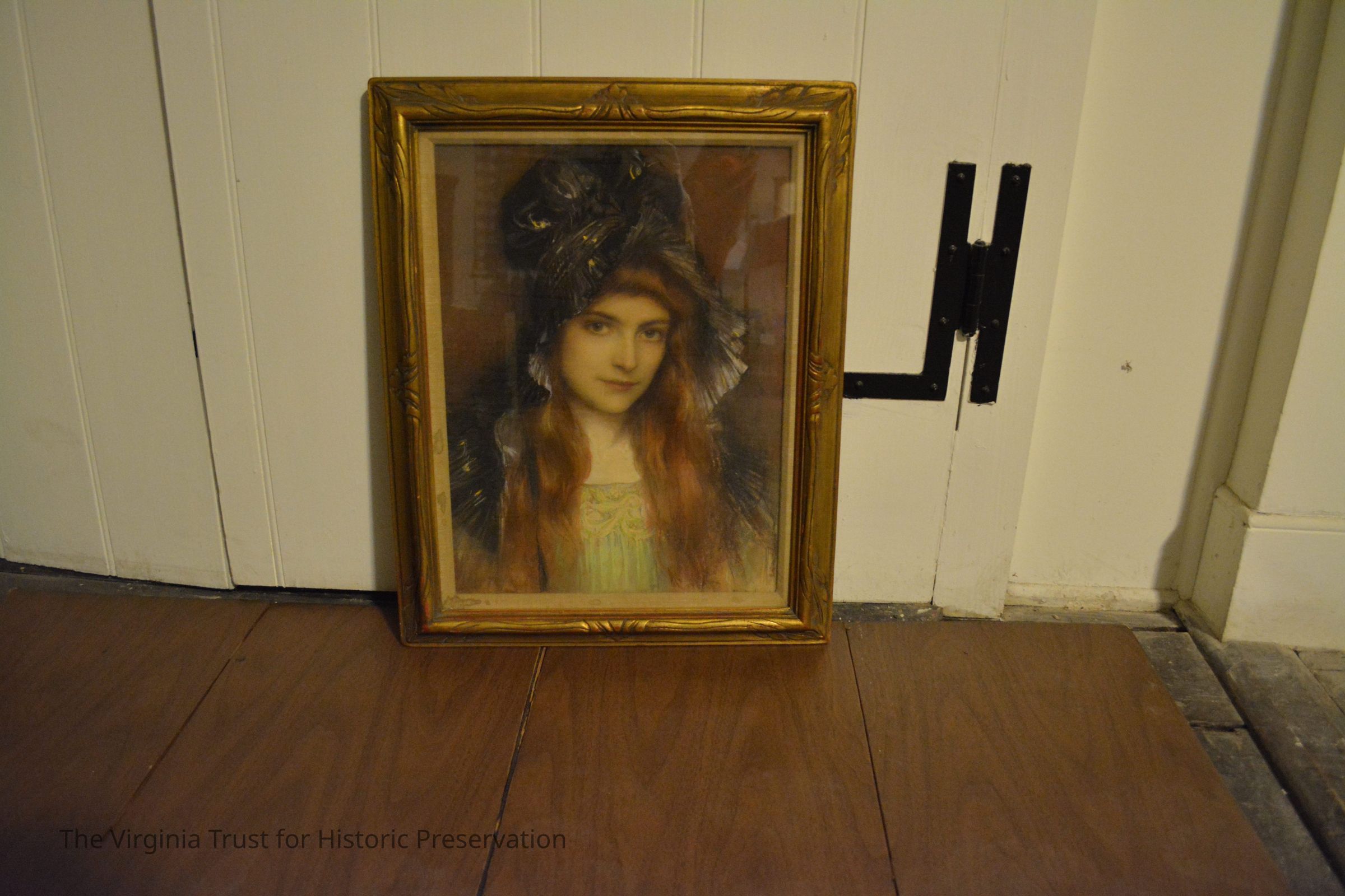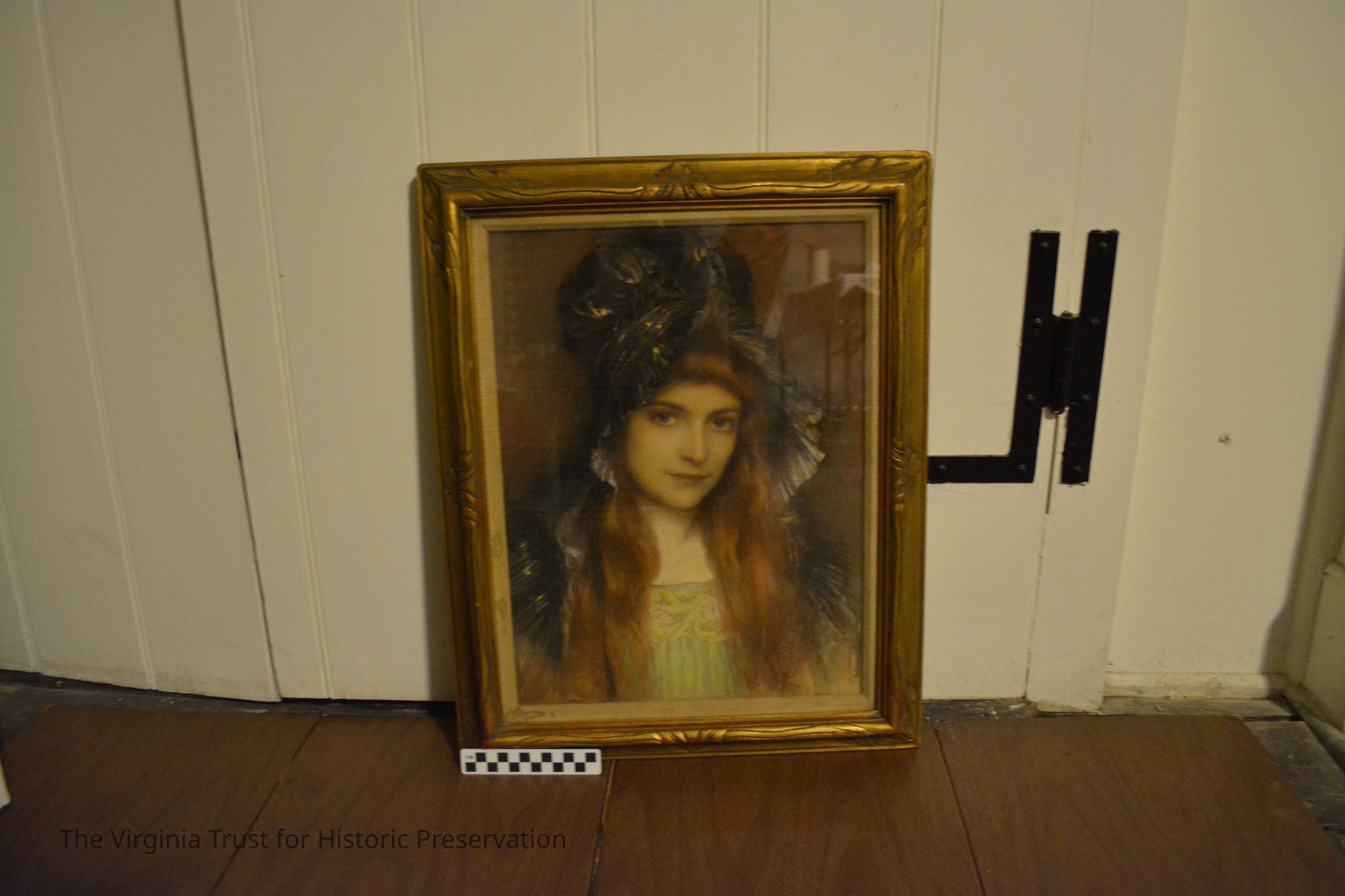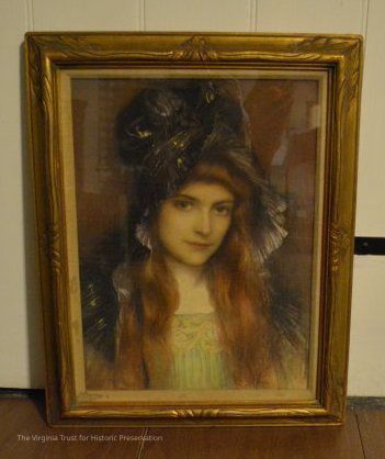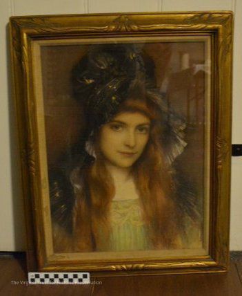 Pastel portrait of a young woman with a black hat and green dress. Gilded wood frame with linen mat. Signature of artist at lower right.