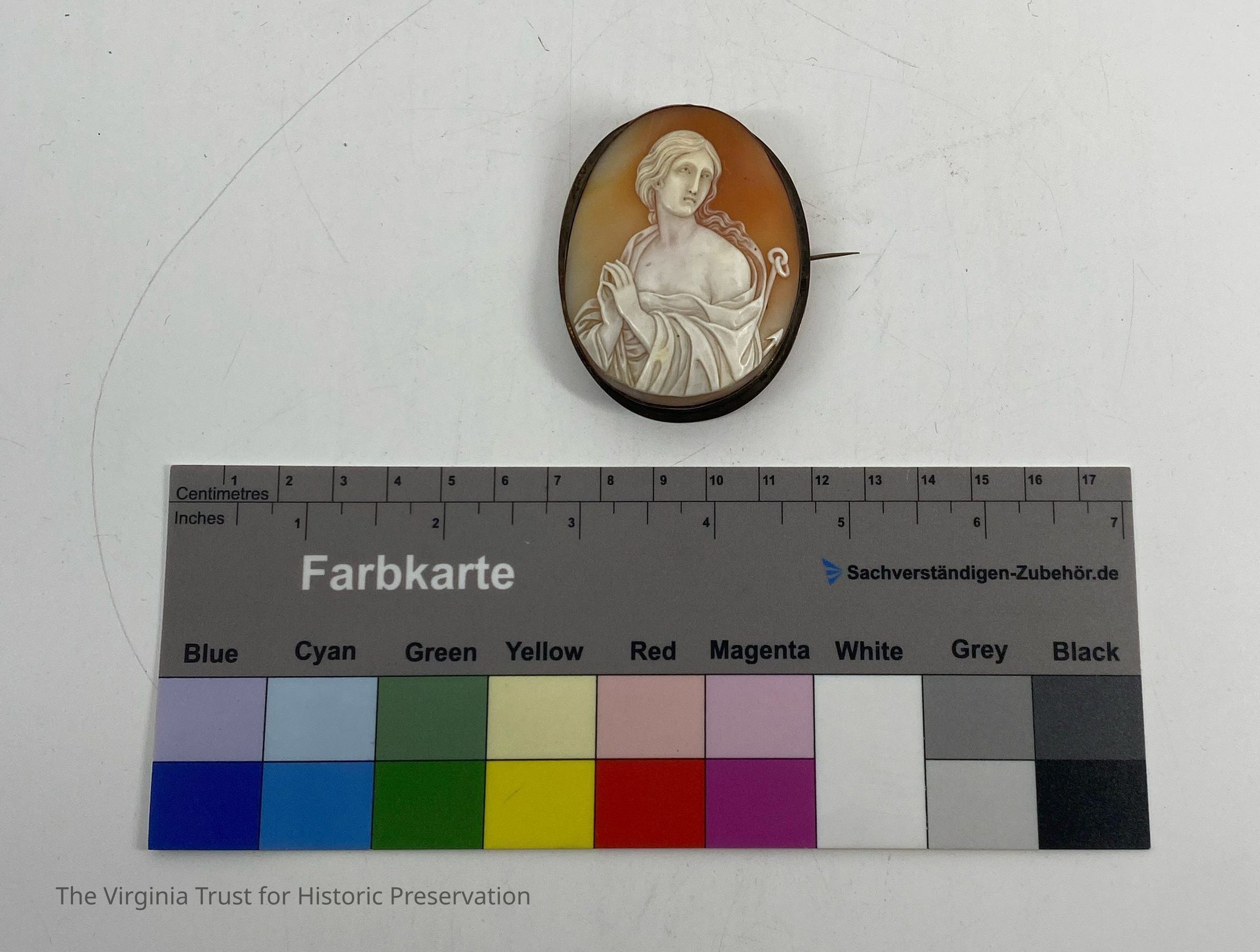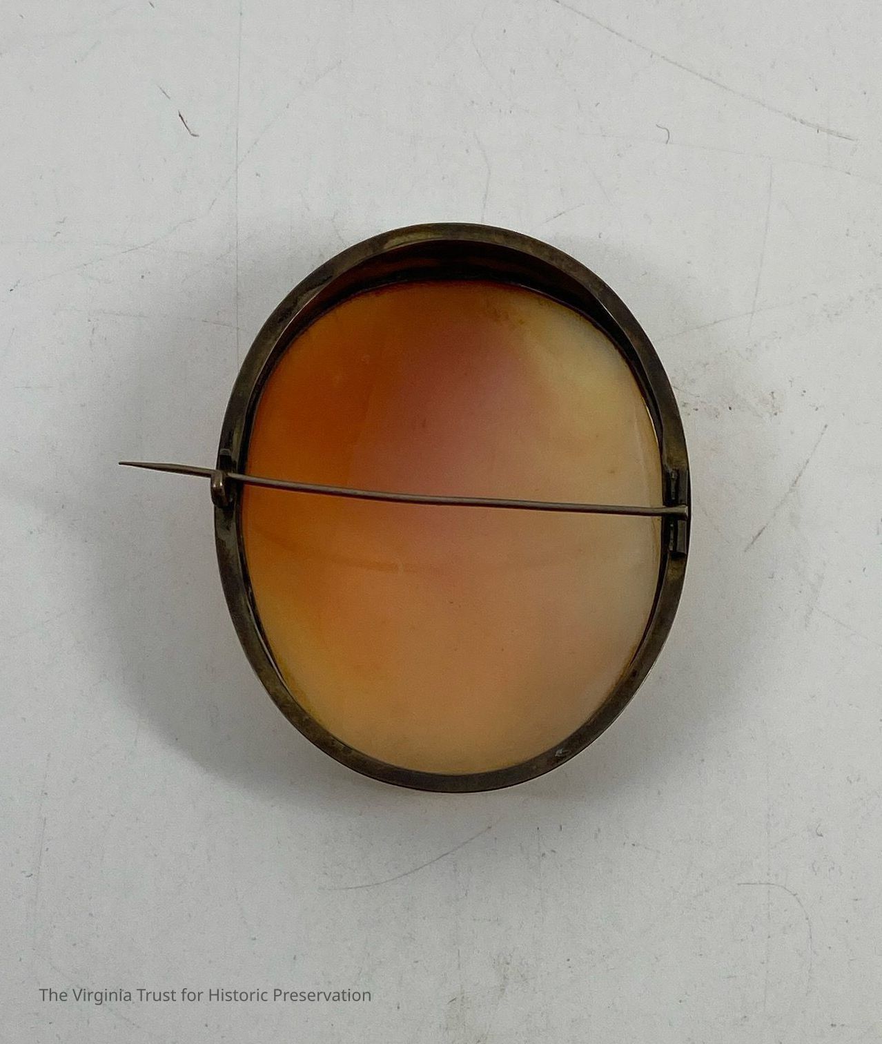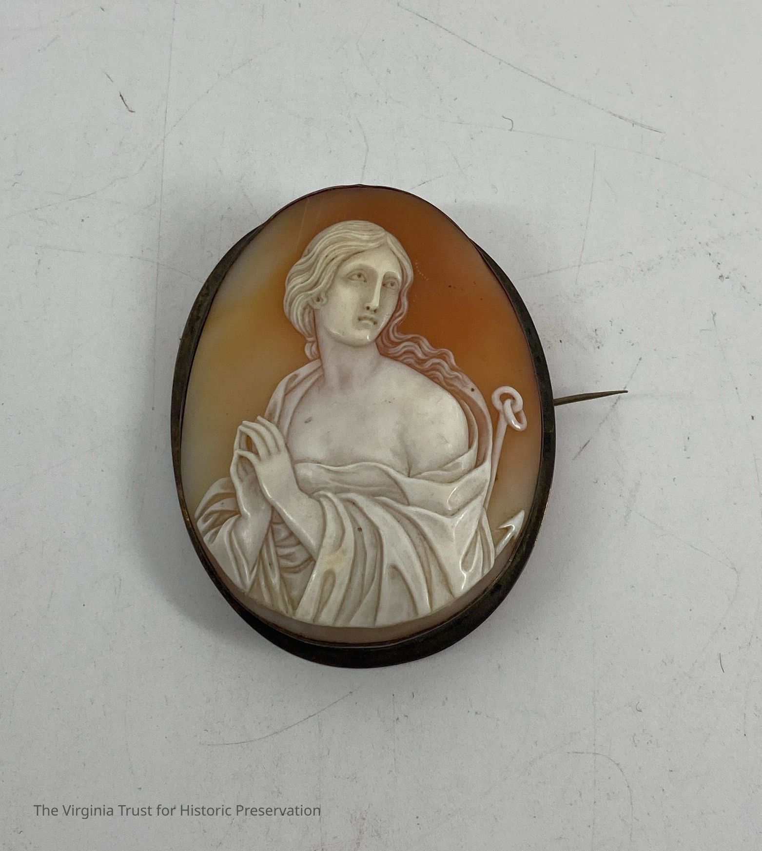 Shell cameo brooch in gold setting. Female figure. Pin on back.