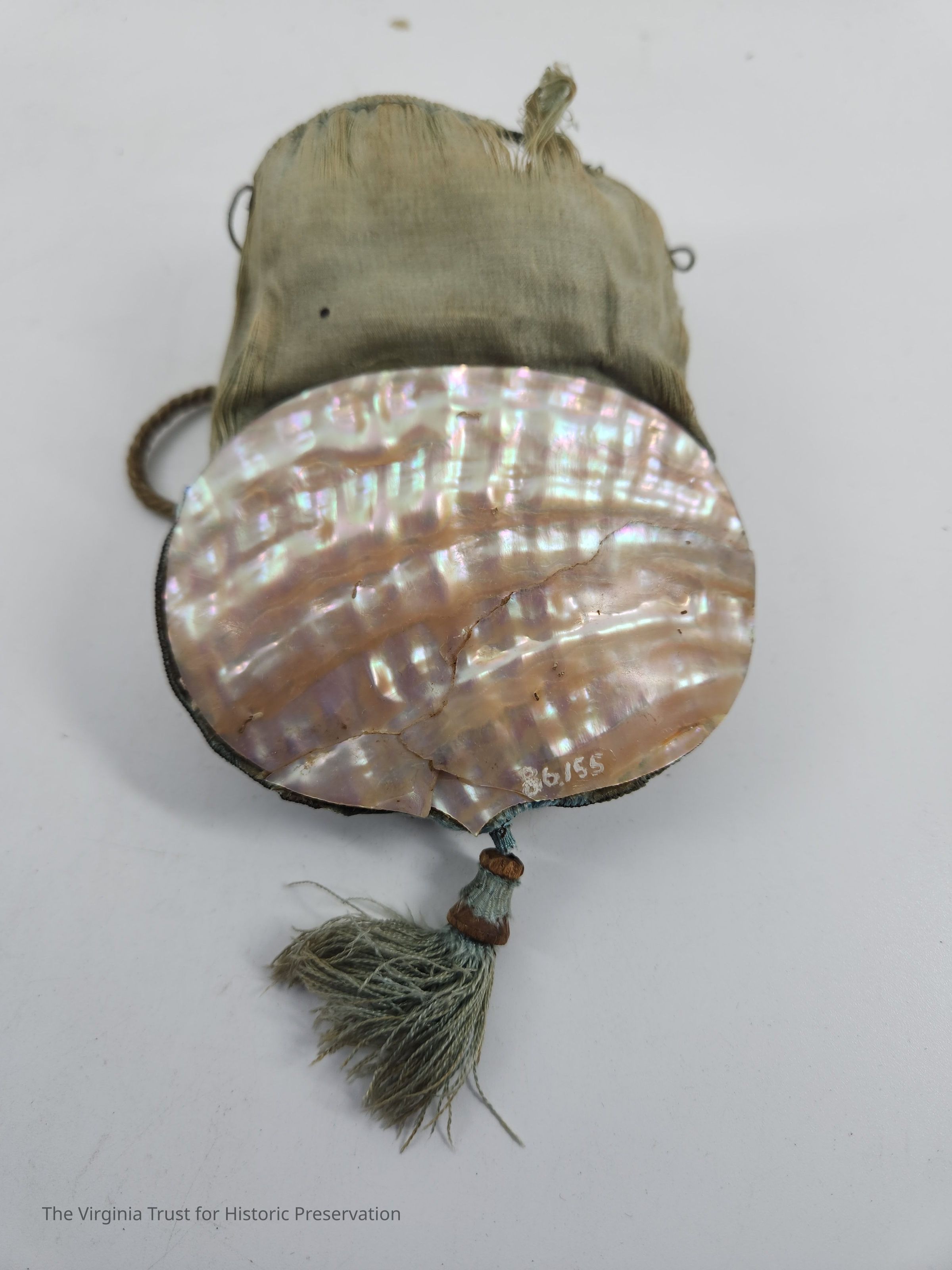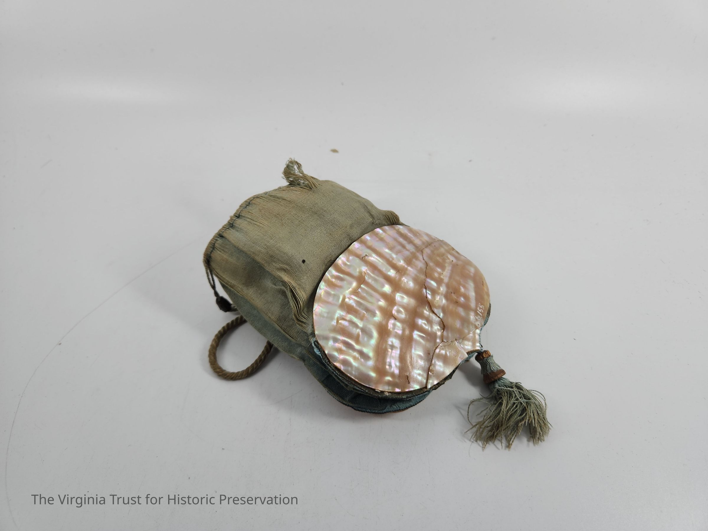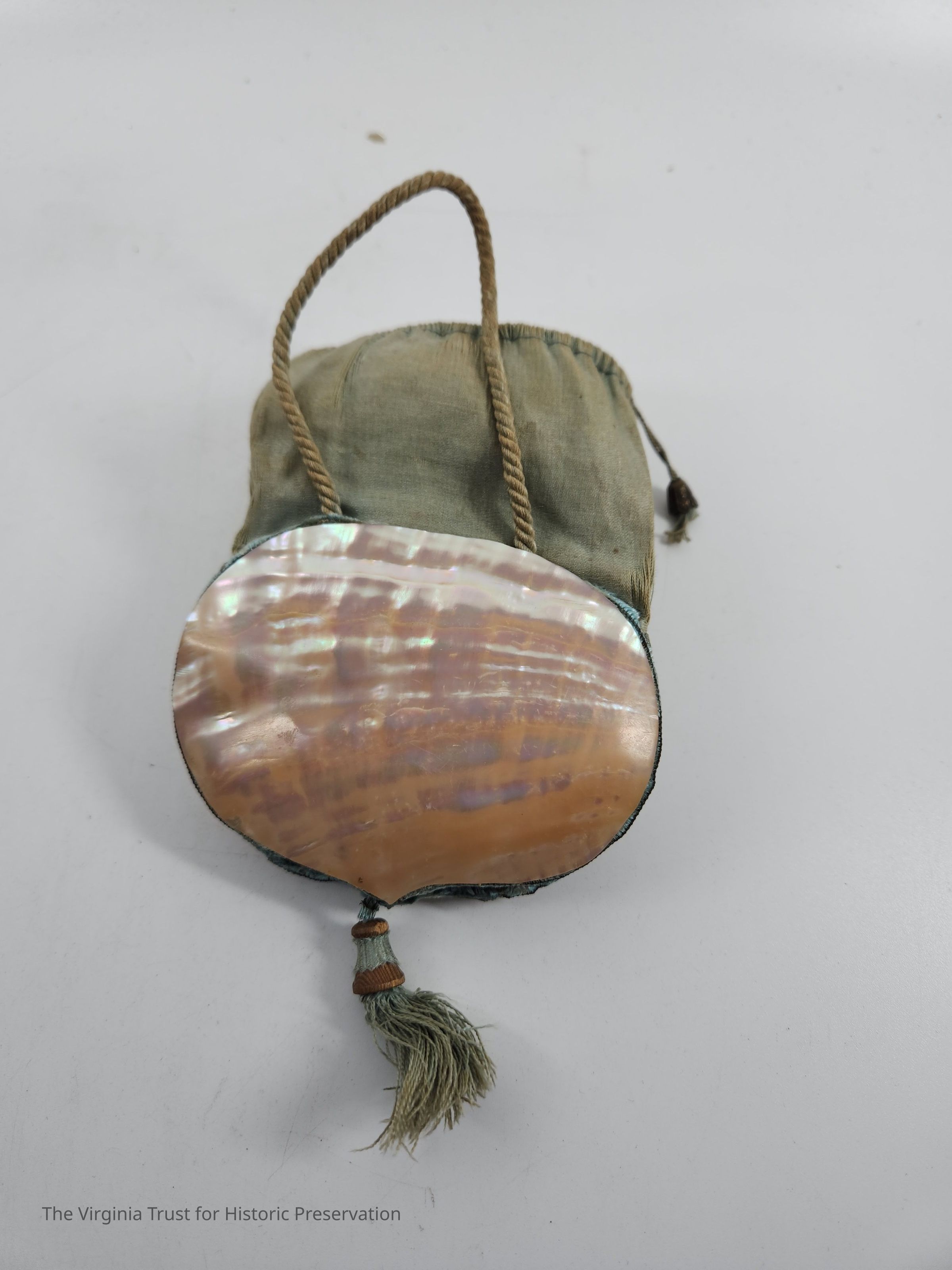 Drawstring purse made from green material with large pieces of shell attached on both sides. The shell on one side has been broken. The purse has a green cord handle and a tassel.Dimensions