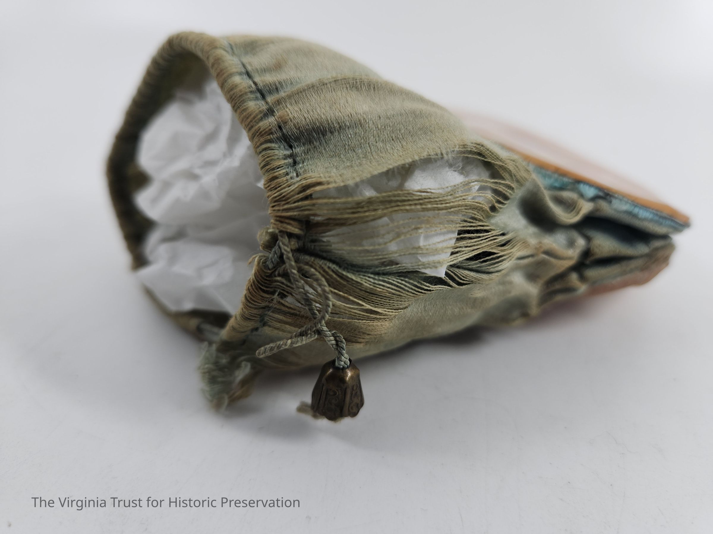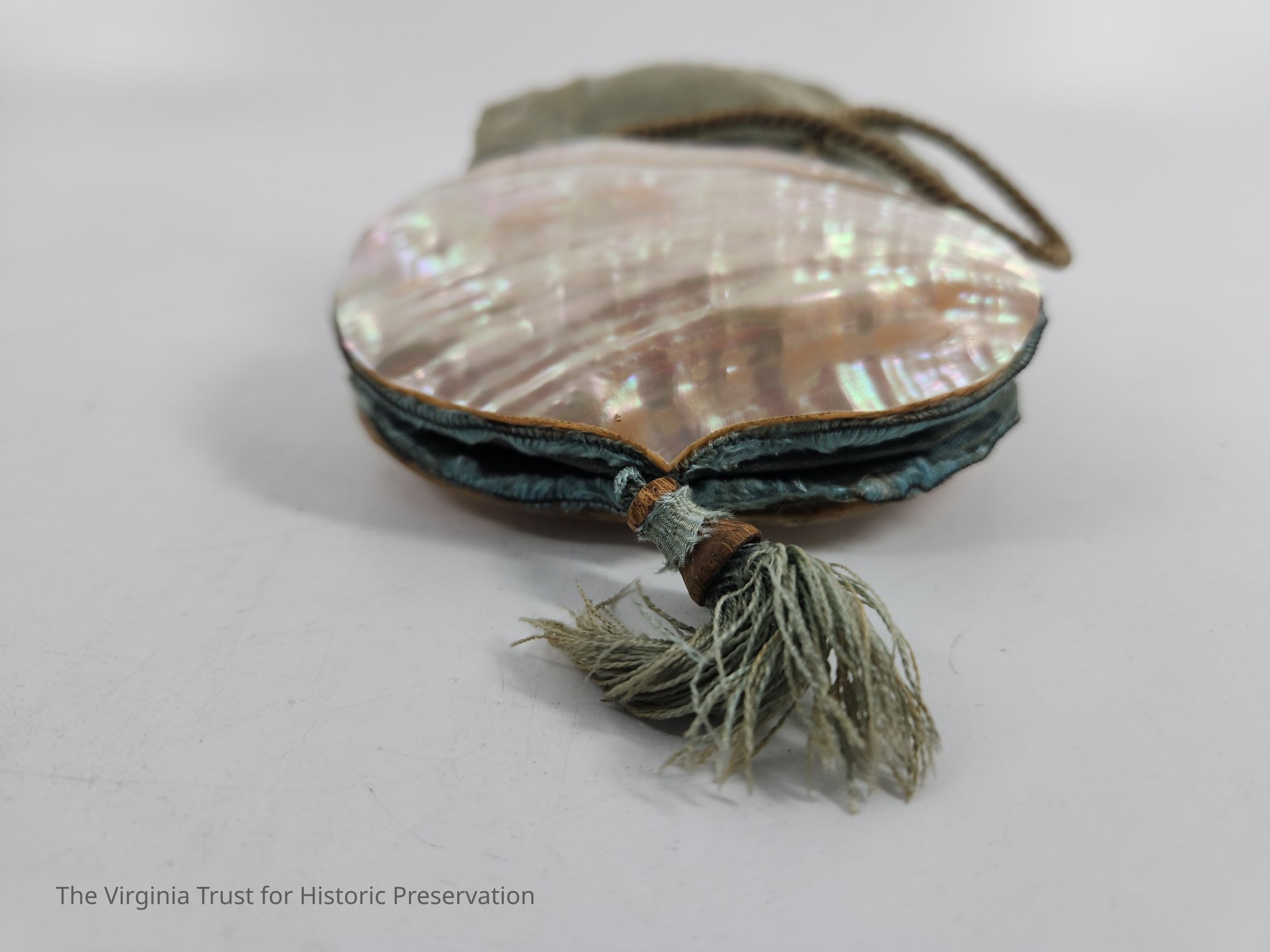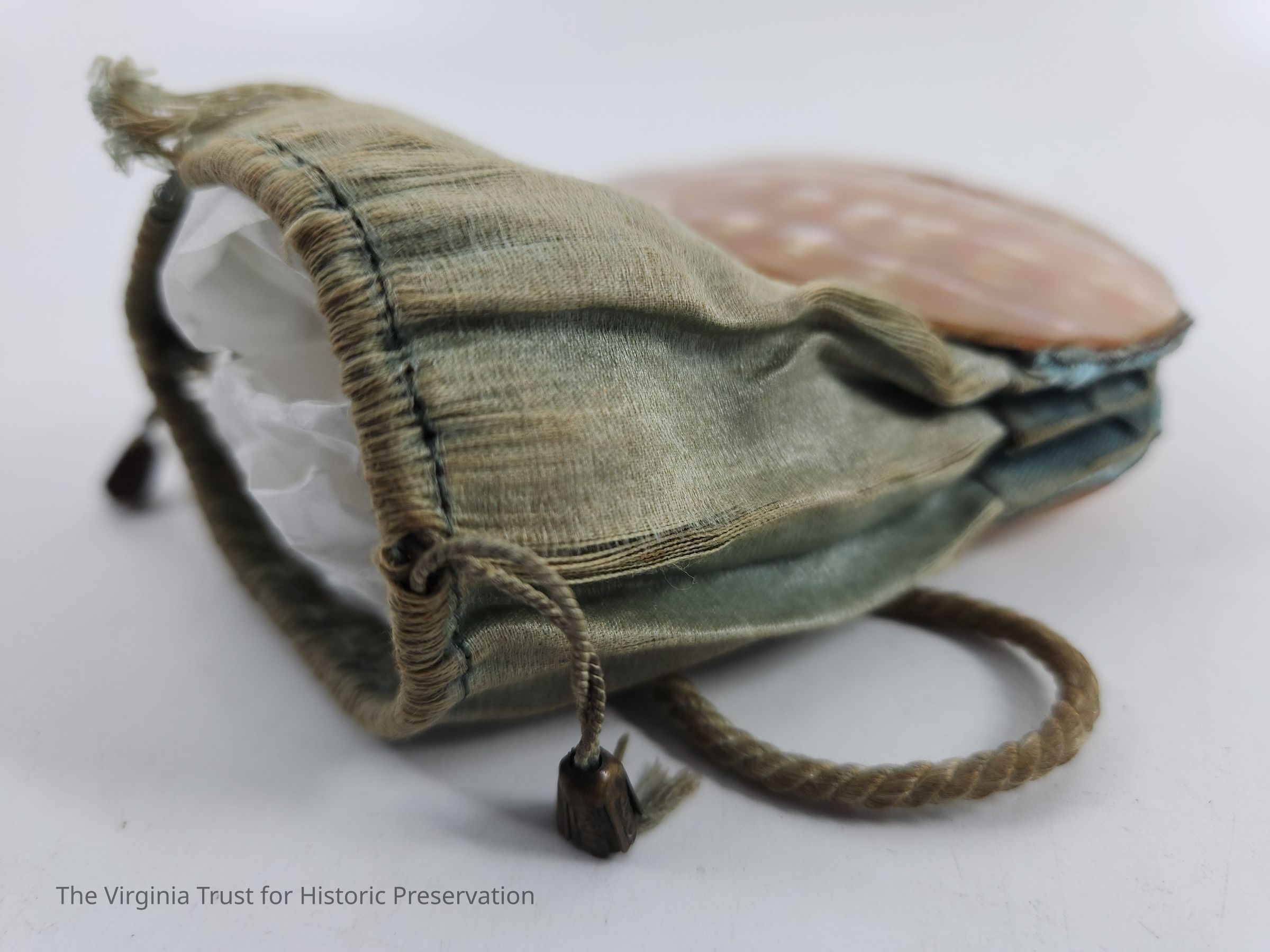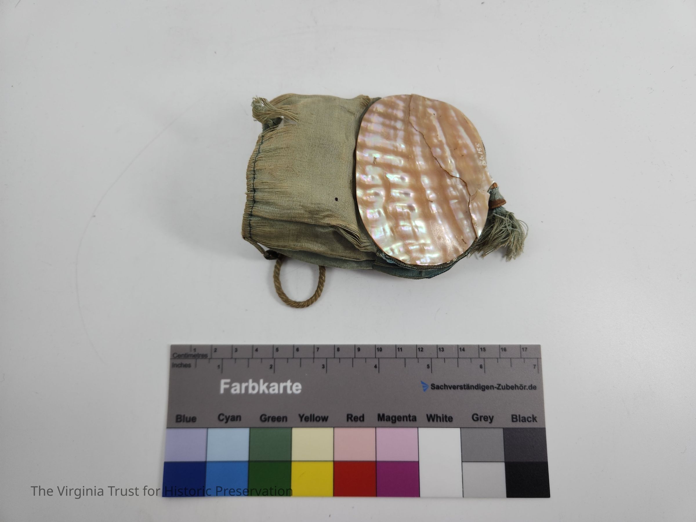Drawstring purse made from green material with large pieces of shell attached on both sides. The shell on one side has been broken. The purse has a green cord handle and a tassel.Dimensions