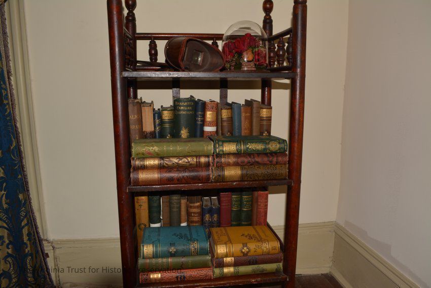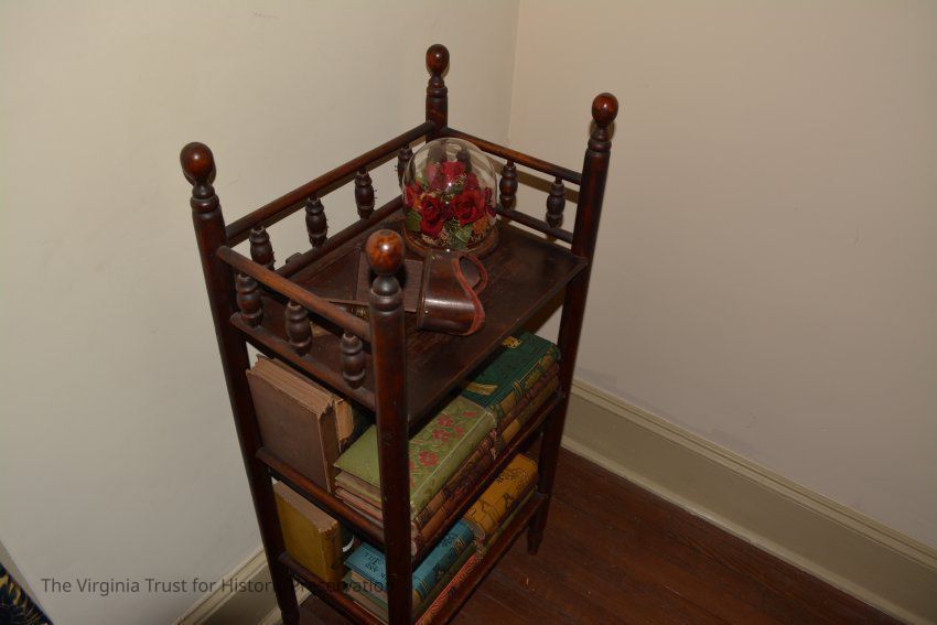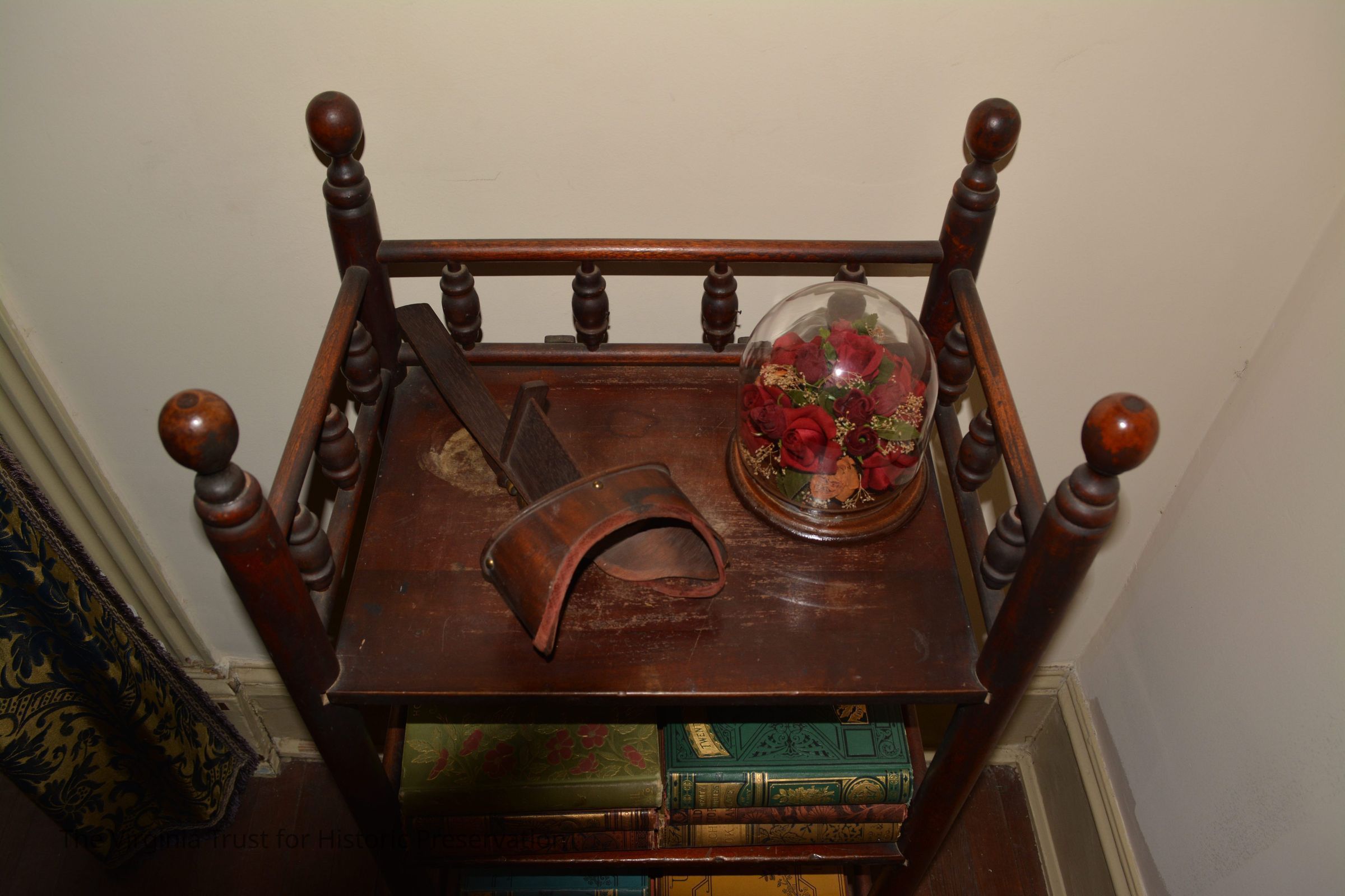 Bookcase with three shelves. Rail and spindle design on top shelf. Four knobs on top.