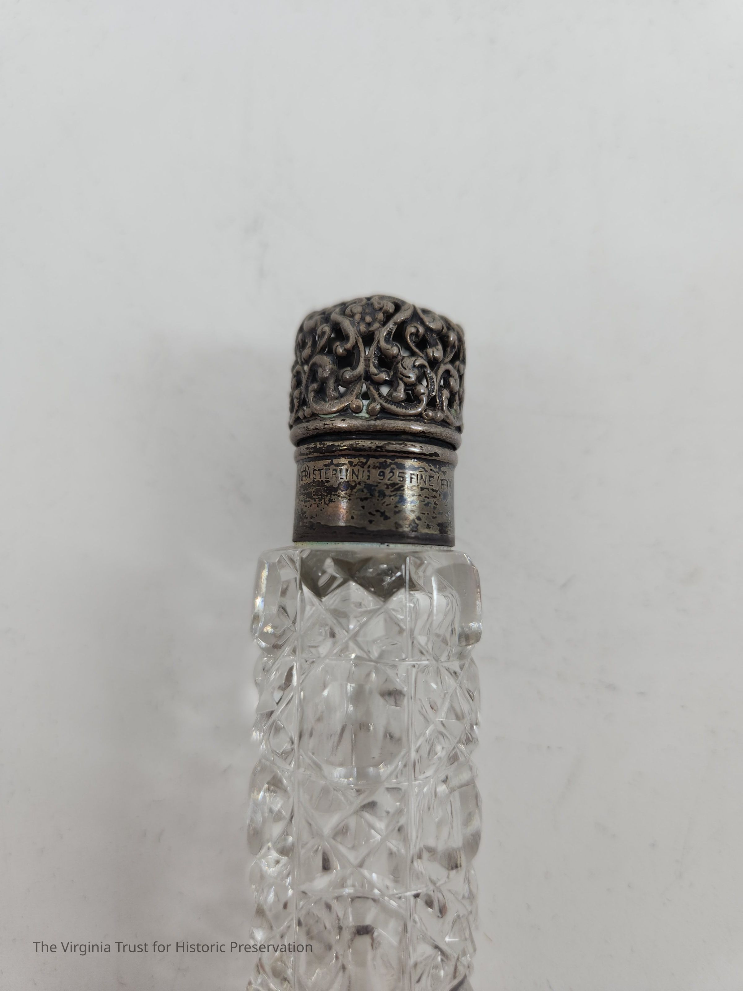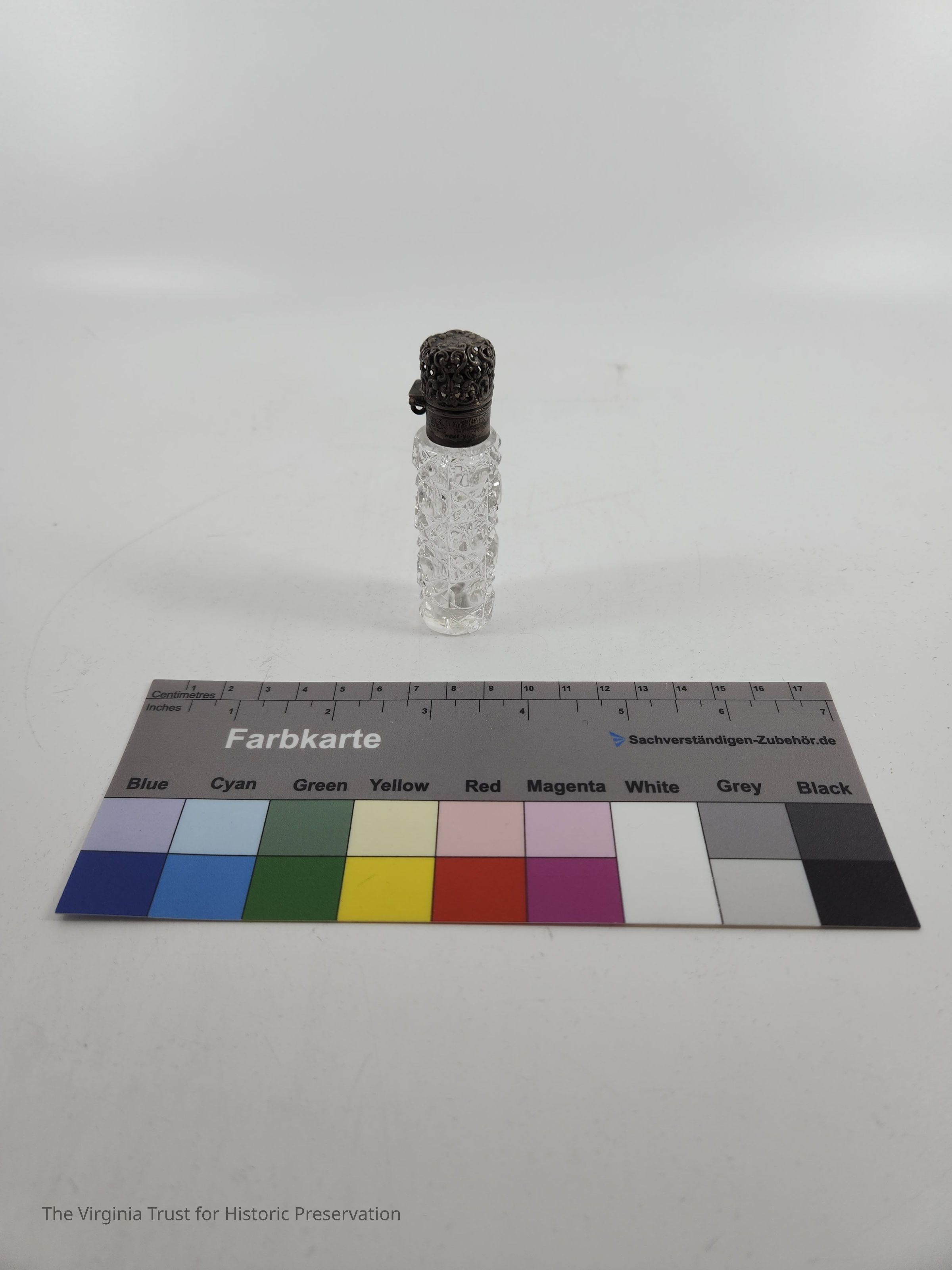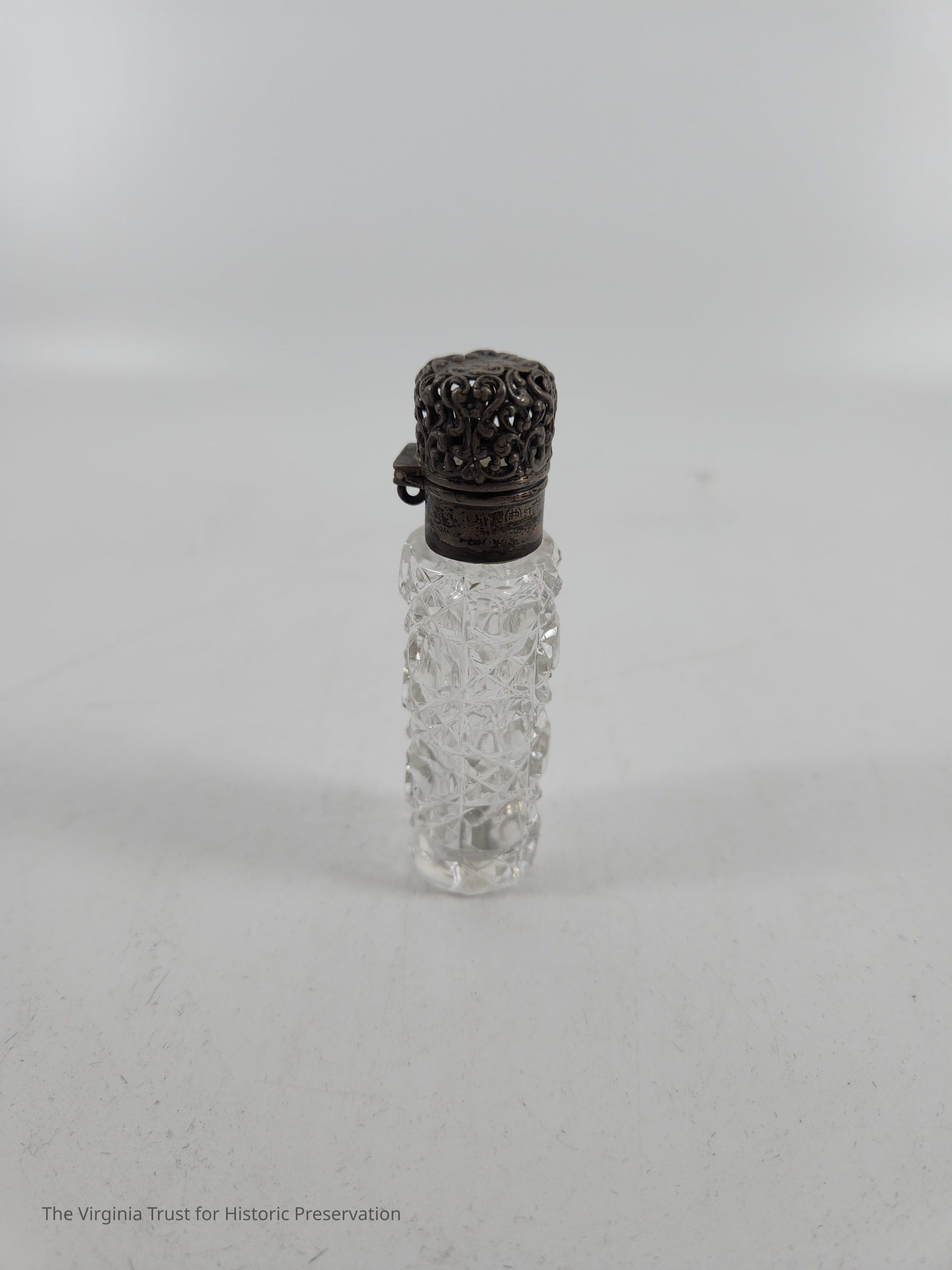Small vial made of cut glass with a silver lid