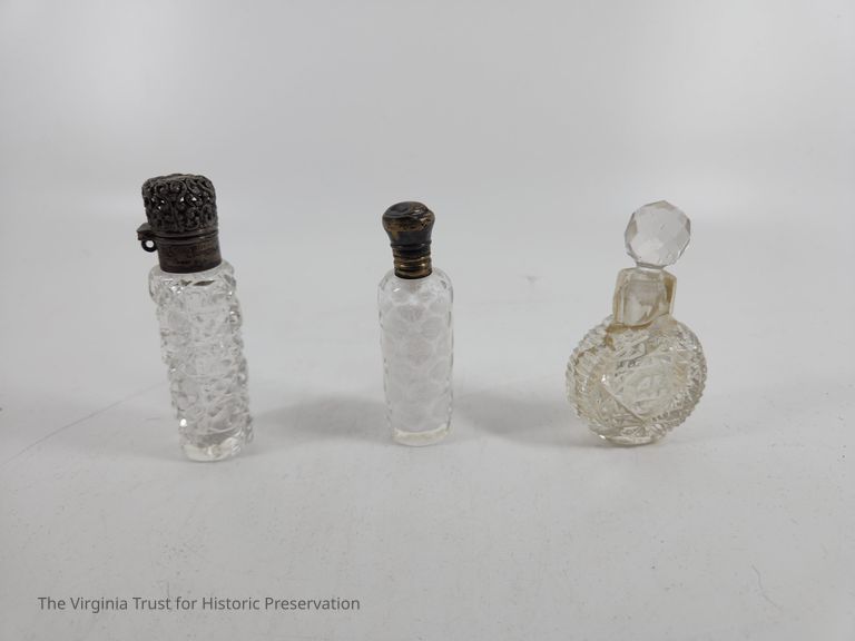Cut glass bottle with a pierced metal lid. "Salts" vials. Set of three.