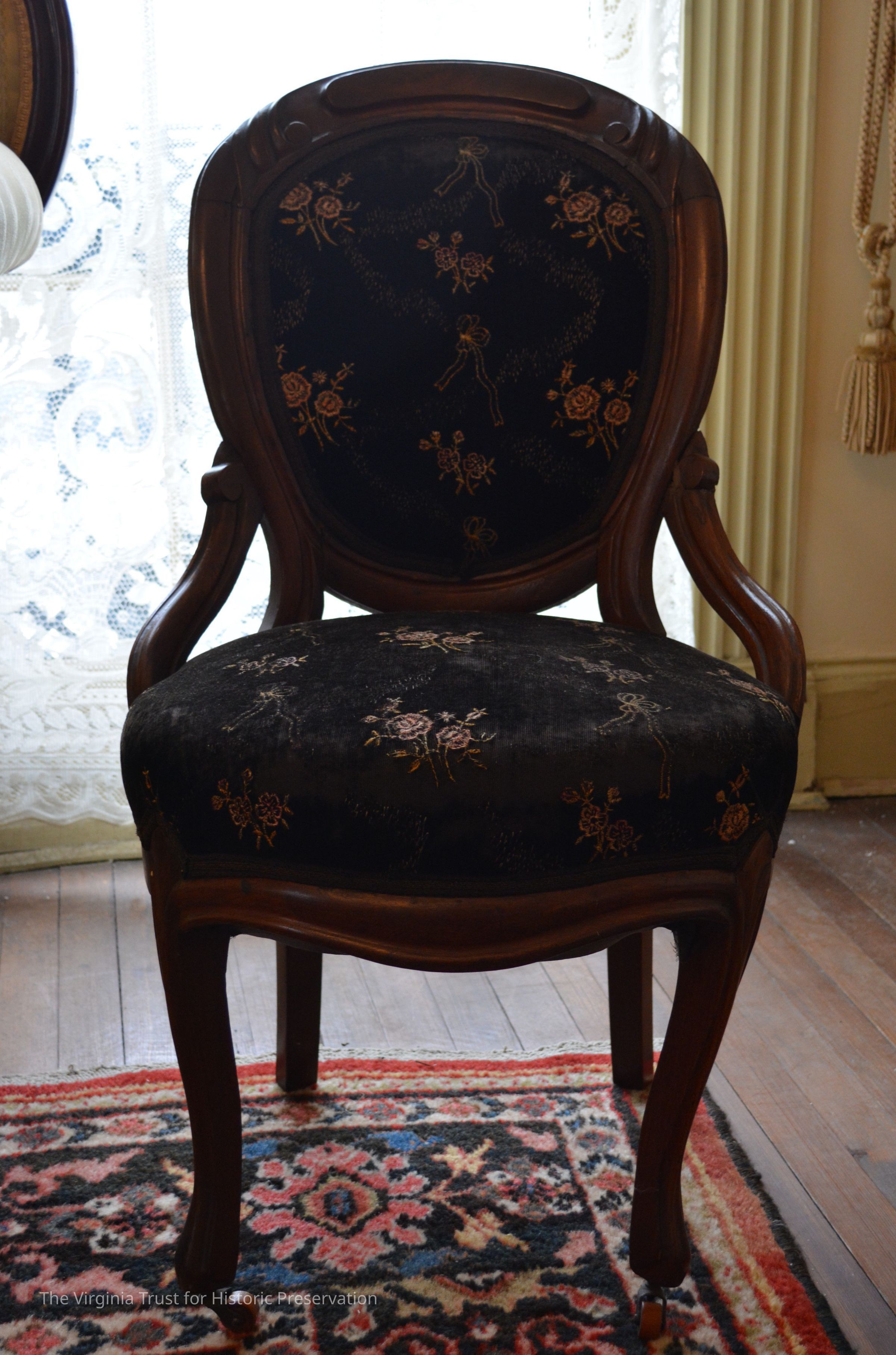 Pair of Victorian side chairs with carved arched back, caster feet. Black velvet upholstery with rose design.