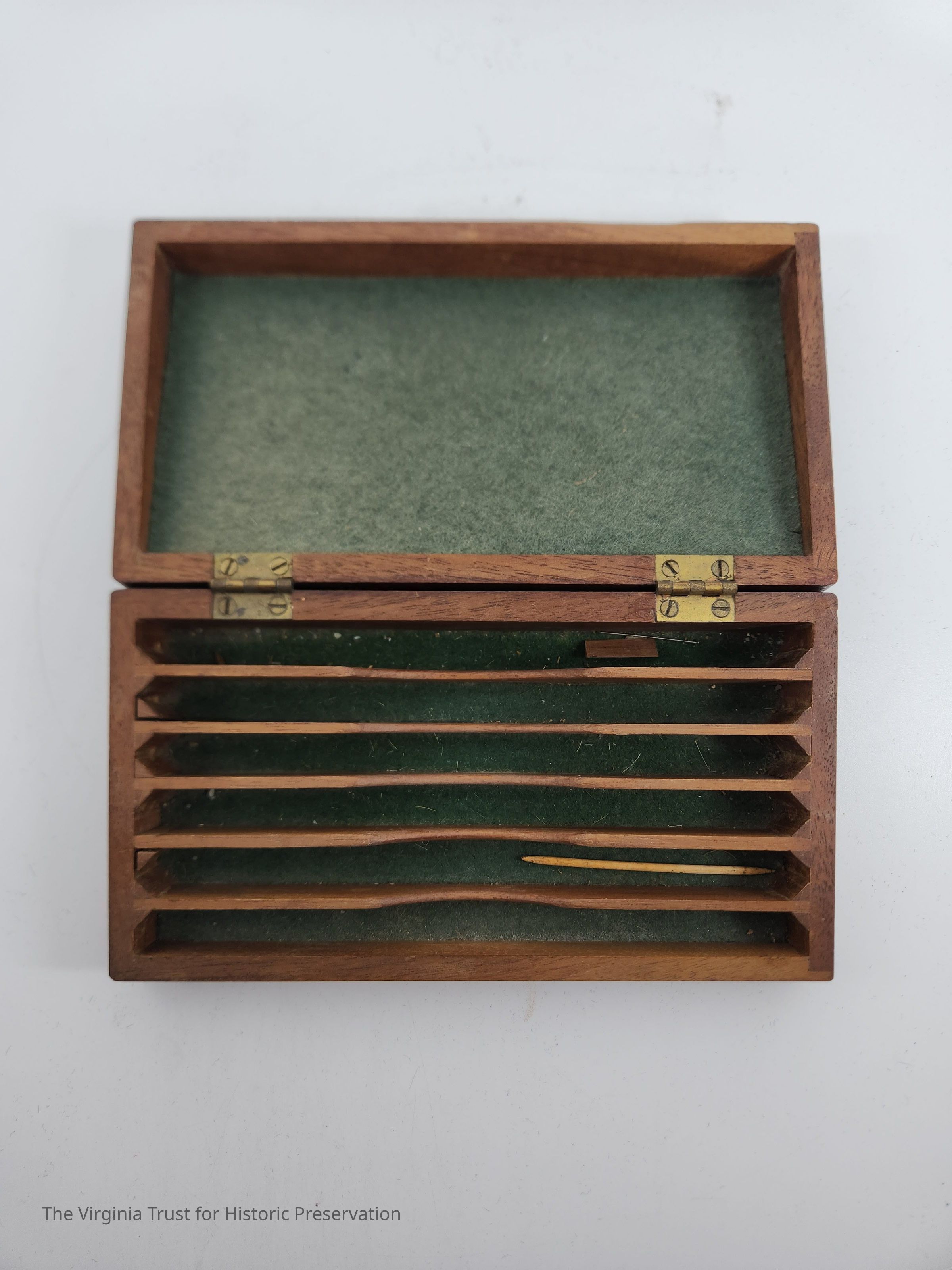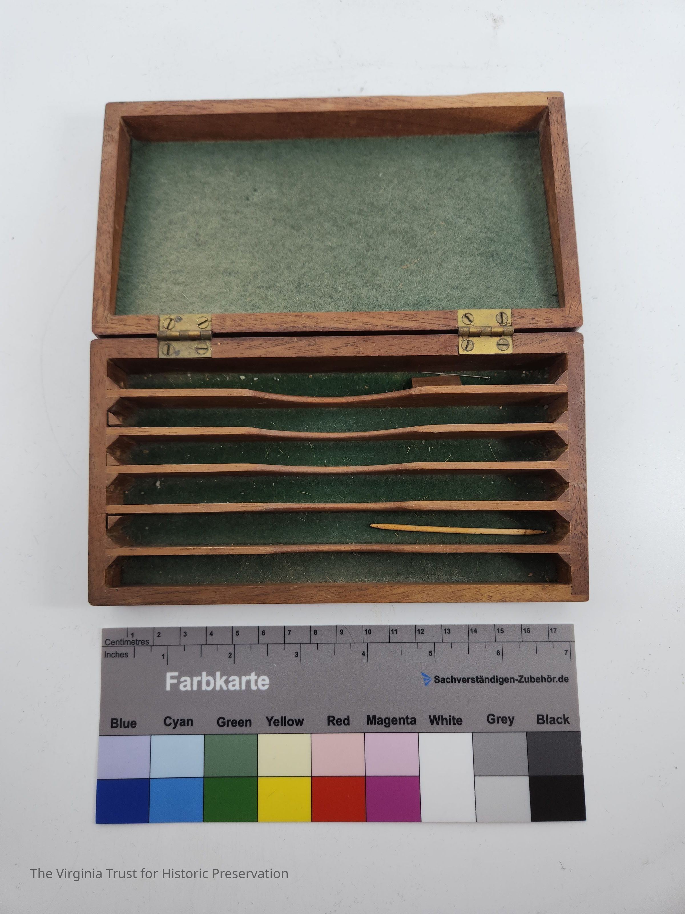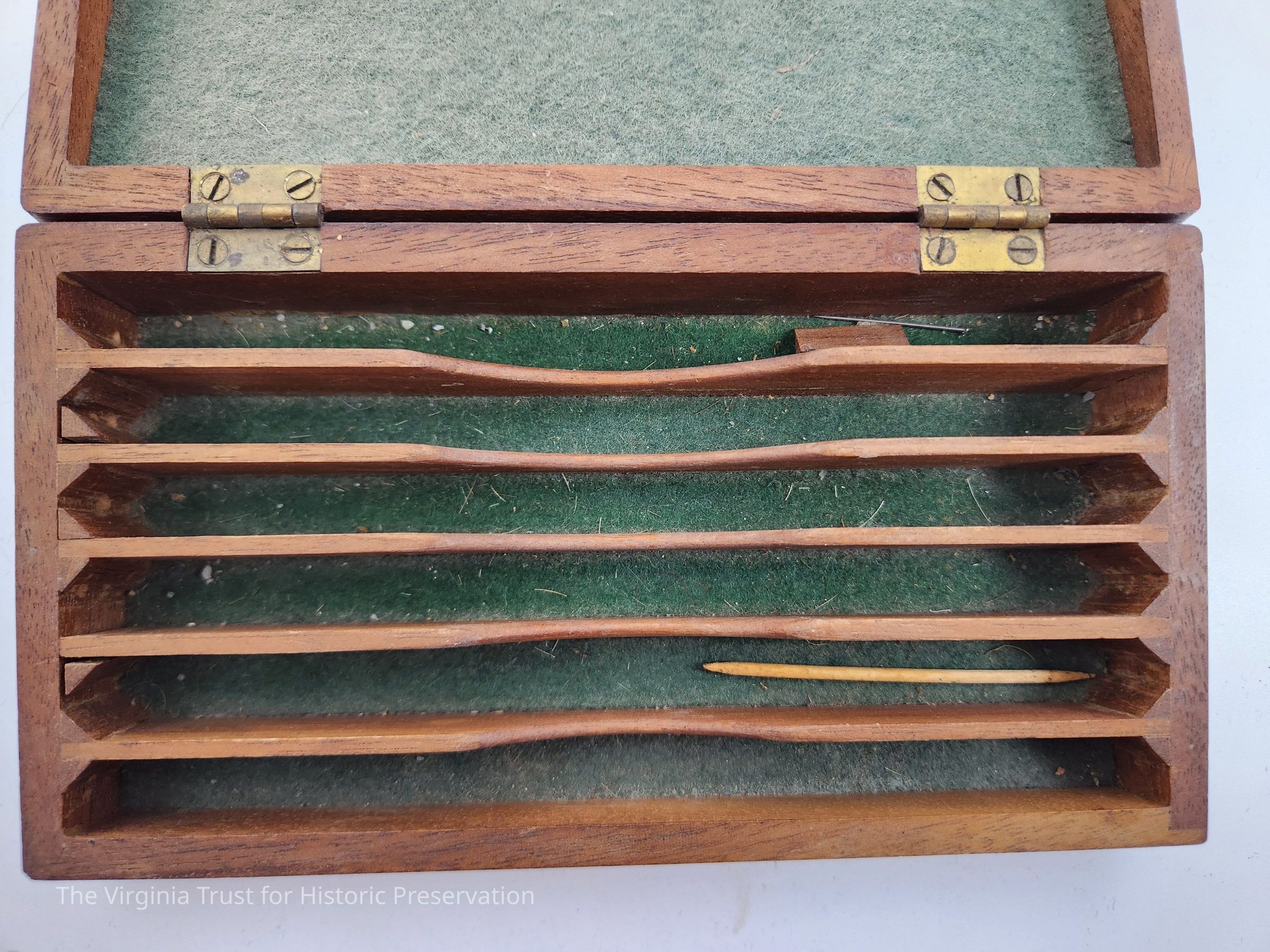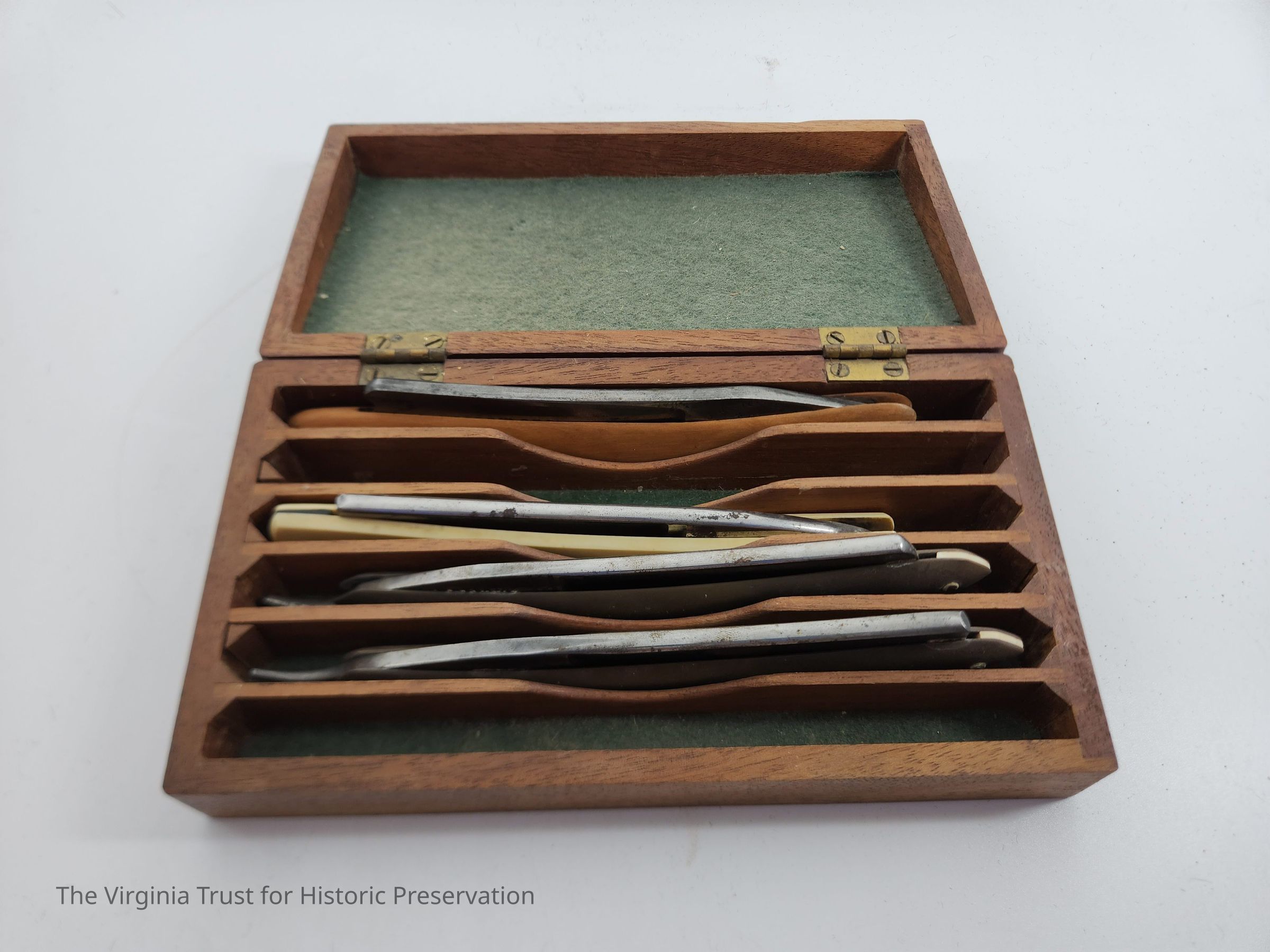 Set of 6 razors, 2 are missing. Case contains: 1 Vanadium steel razor. 1 razor with steel case, 1 razor with wood case marked "Sheffield, J. Wostenholm & Sons," 1 steel razor. 1 marked "Barbers Comfort," Made in Germany, W. E. Bain, Alexandria, VA. Case is felt lined.