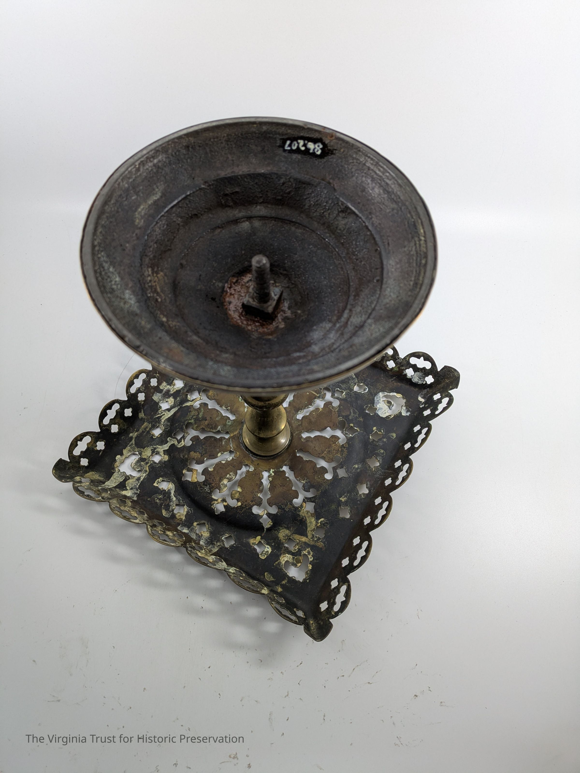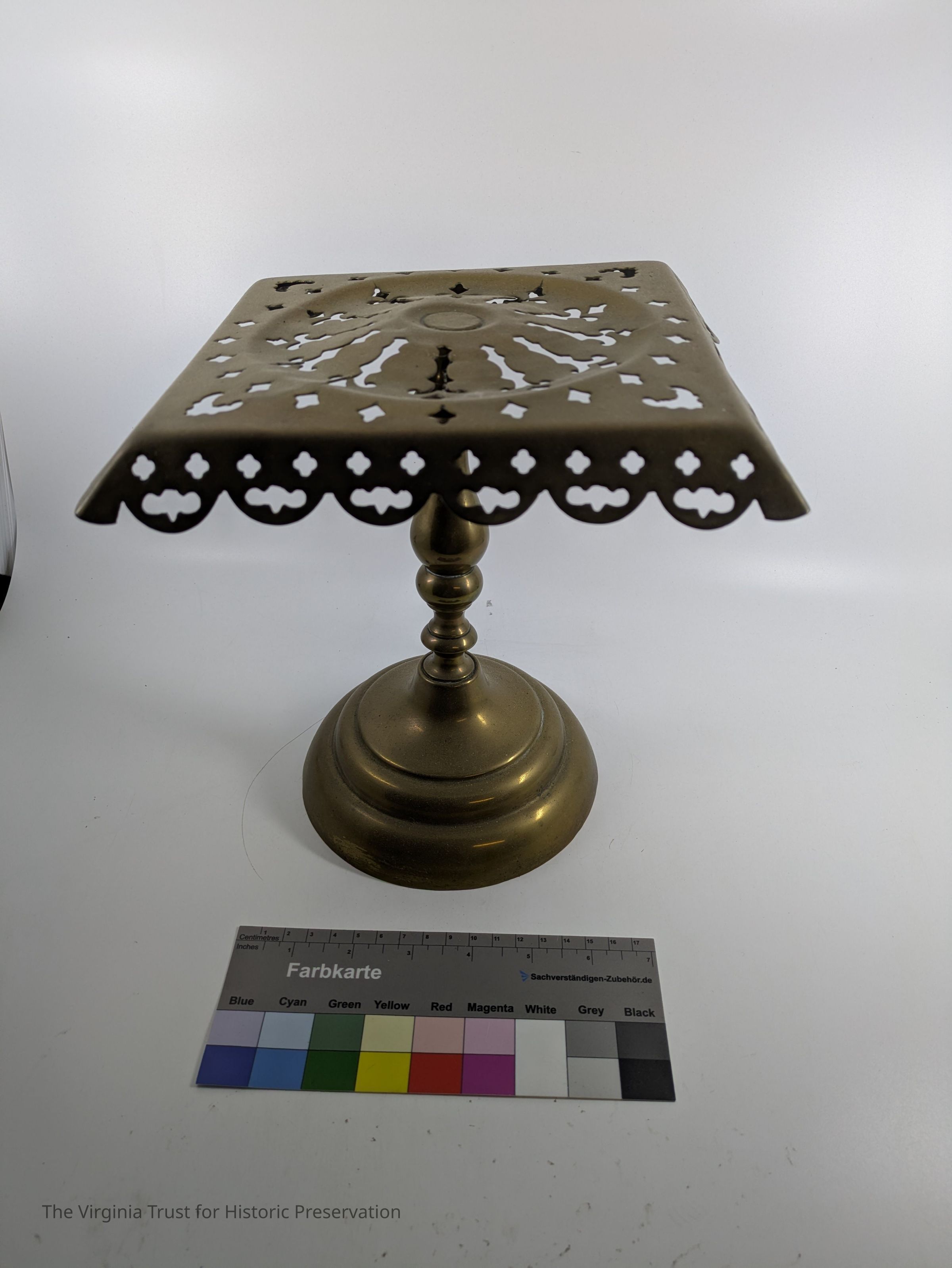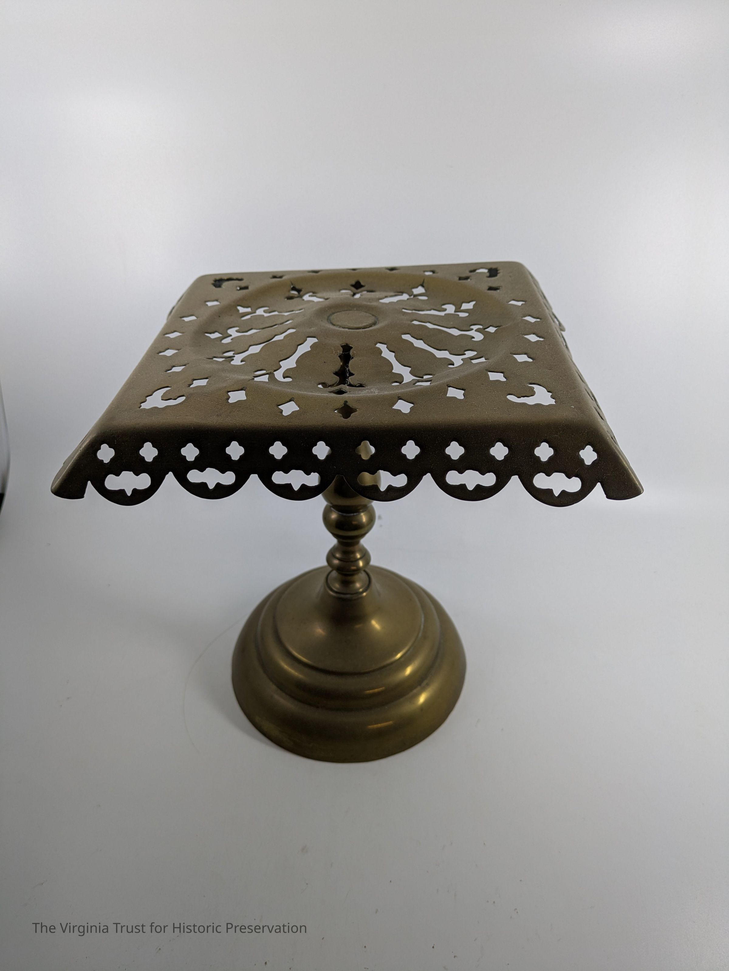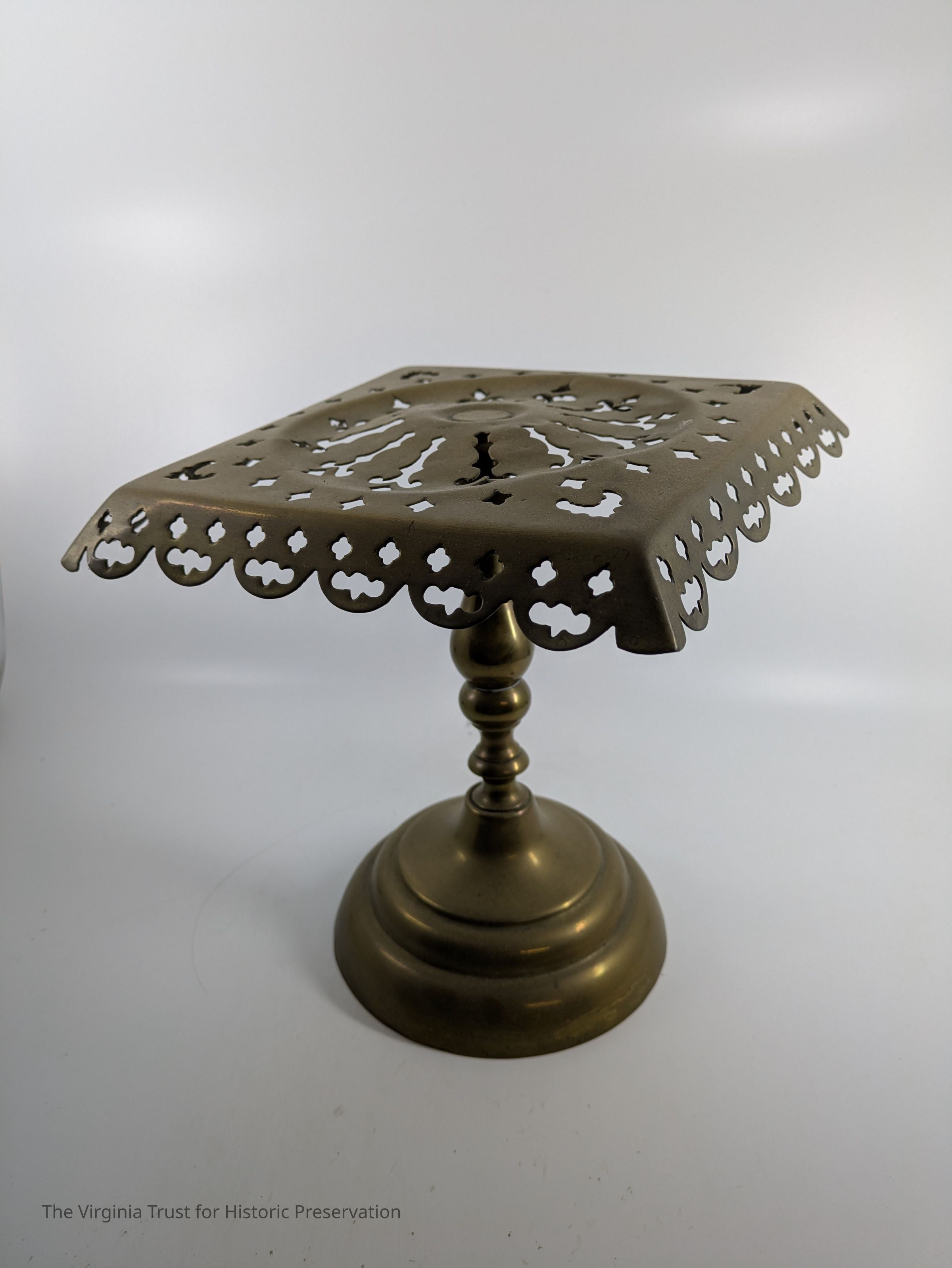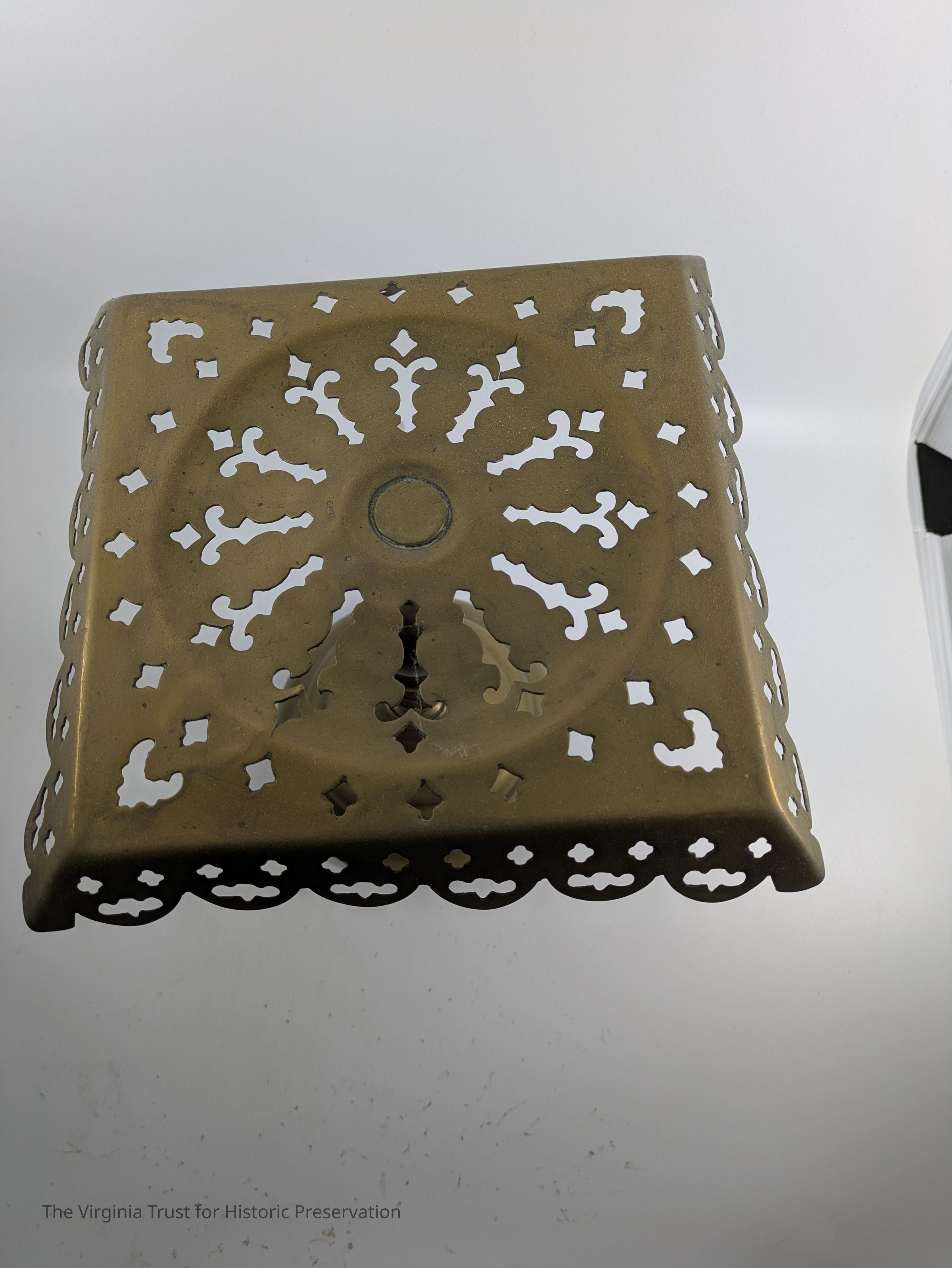 Brass fireplace trivet with pierced brass design on circular brass base. Square top marked "86673."