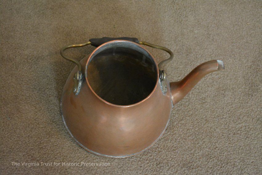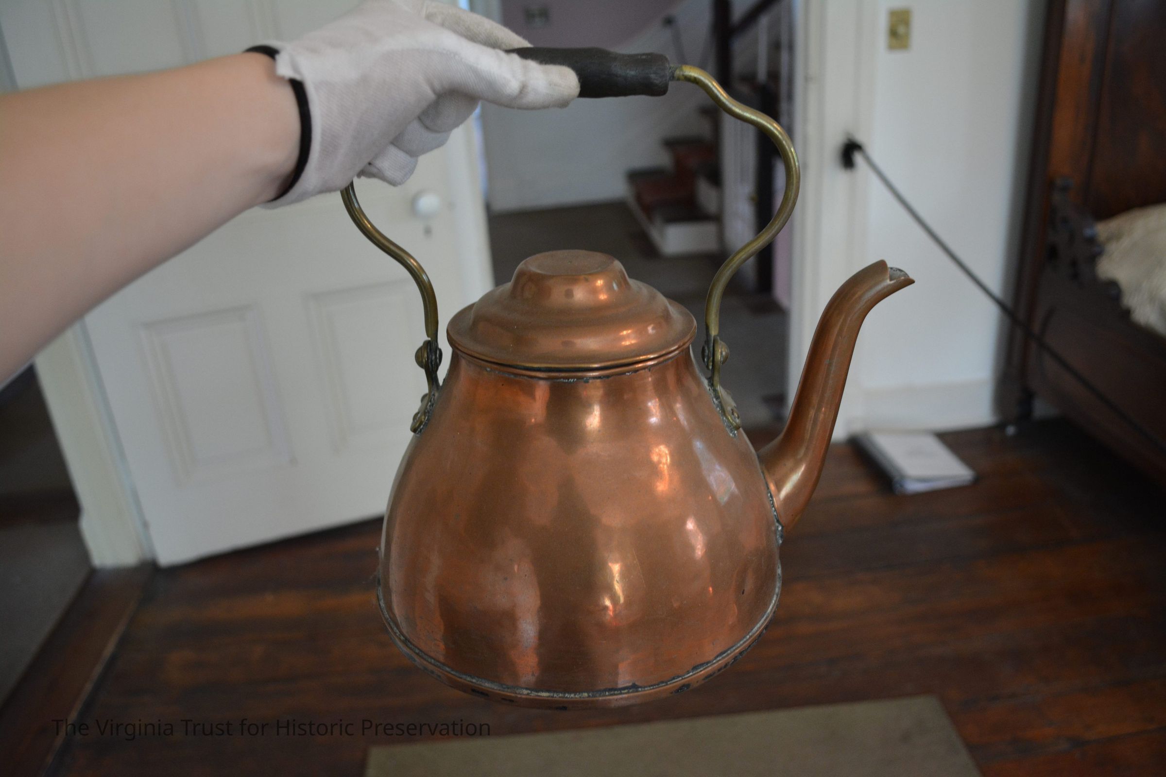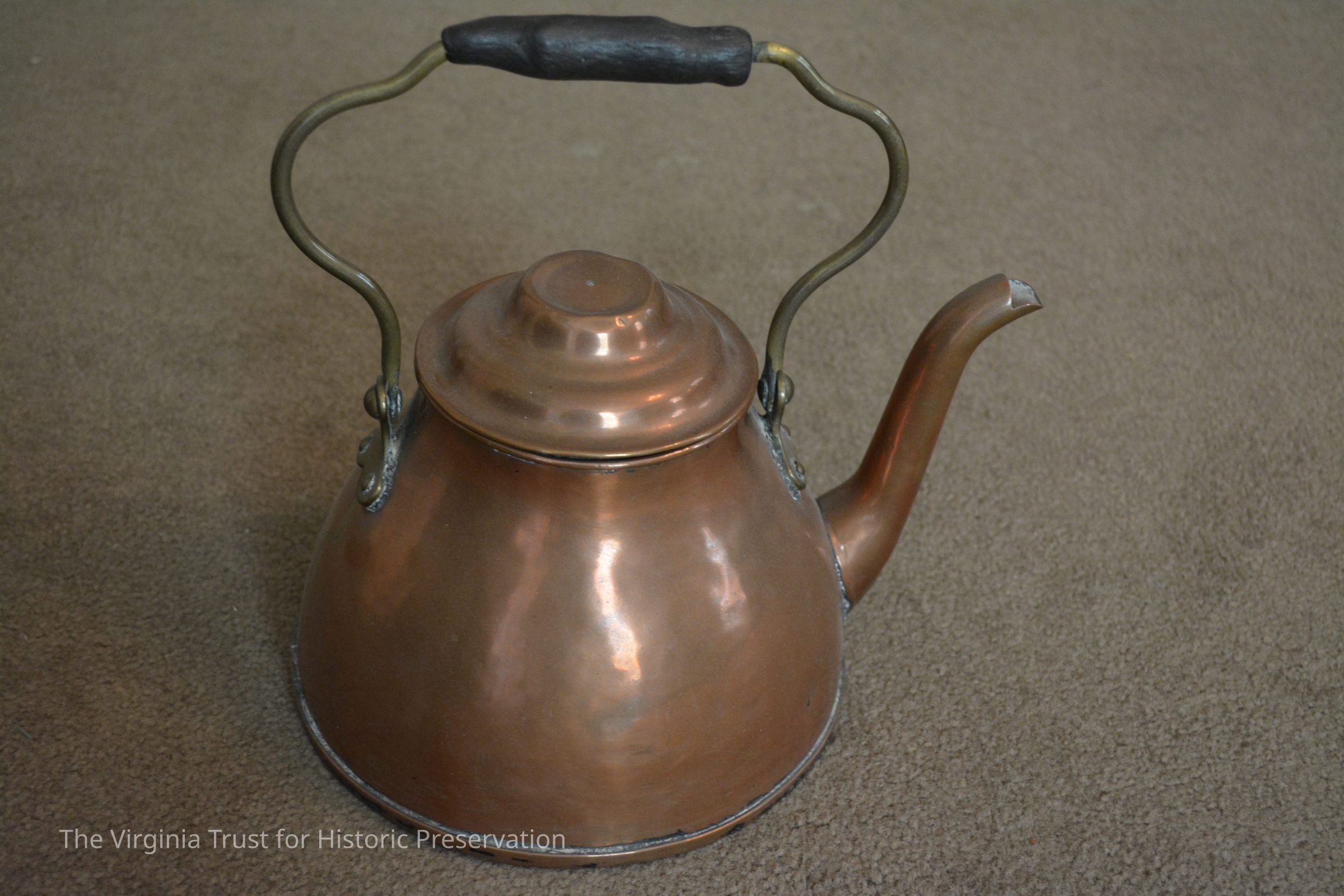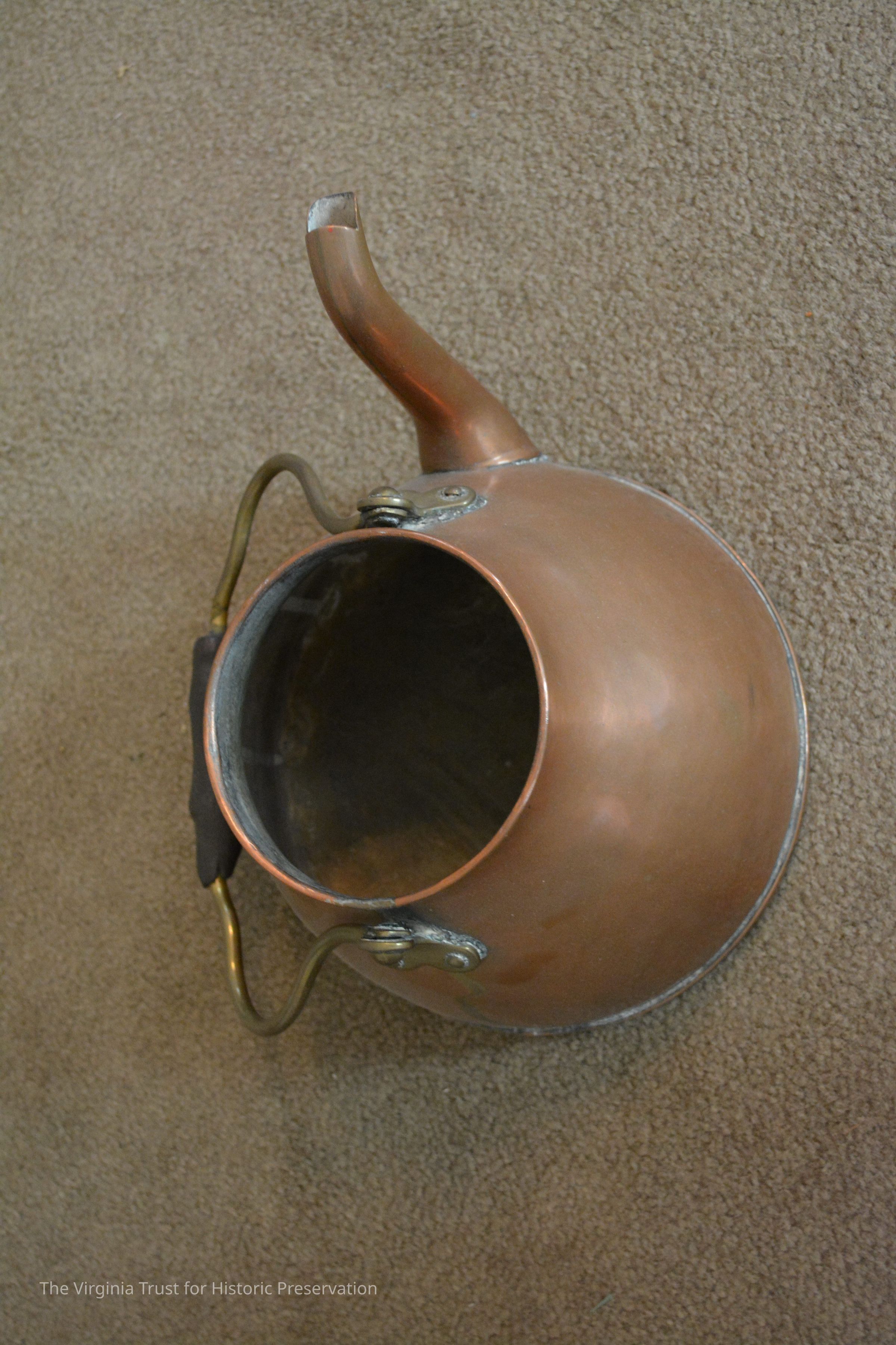 Copper tea kettle with brass handle and black wood grip. Separate lid with no handles.