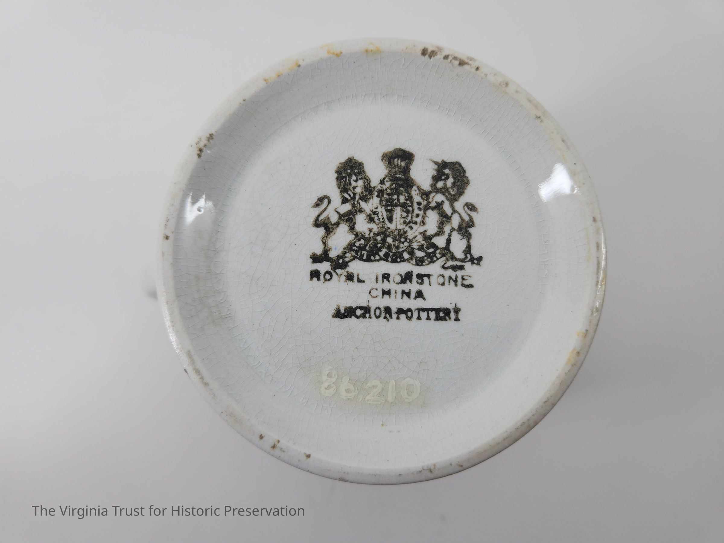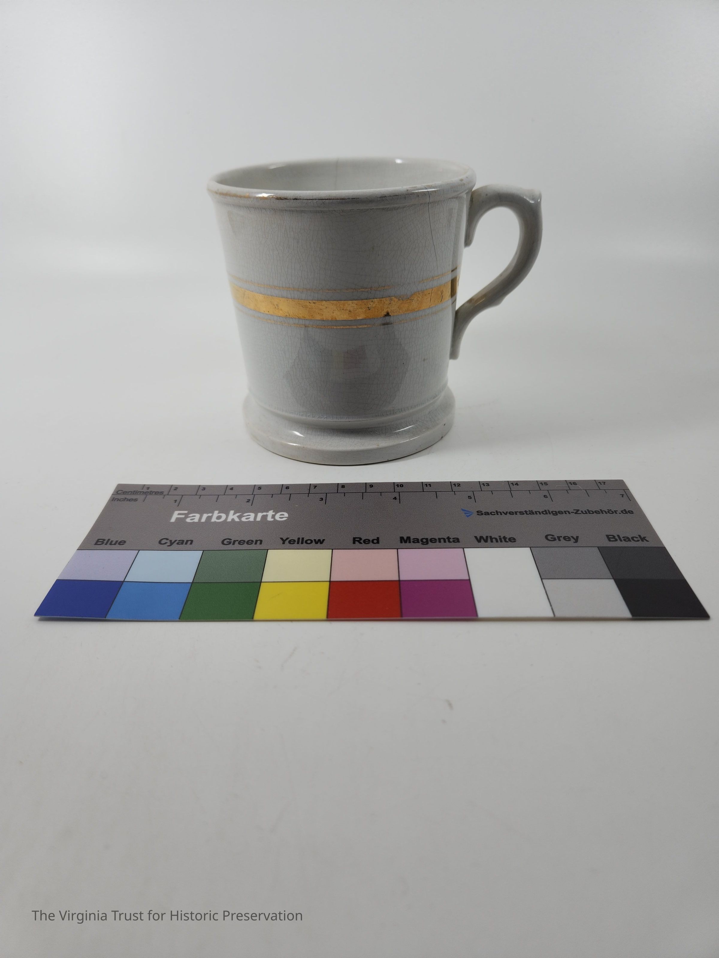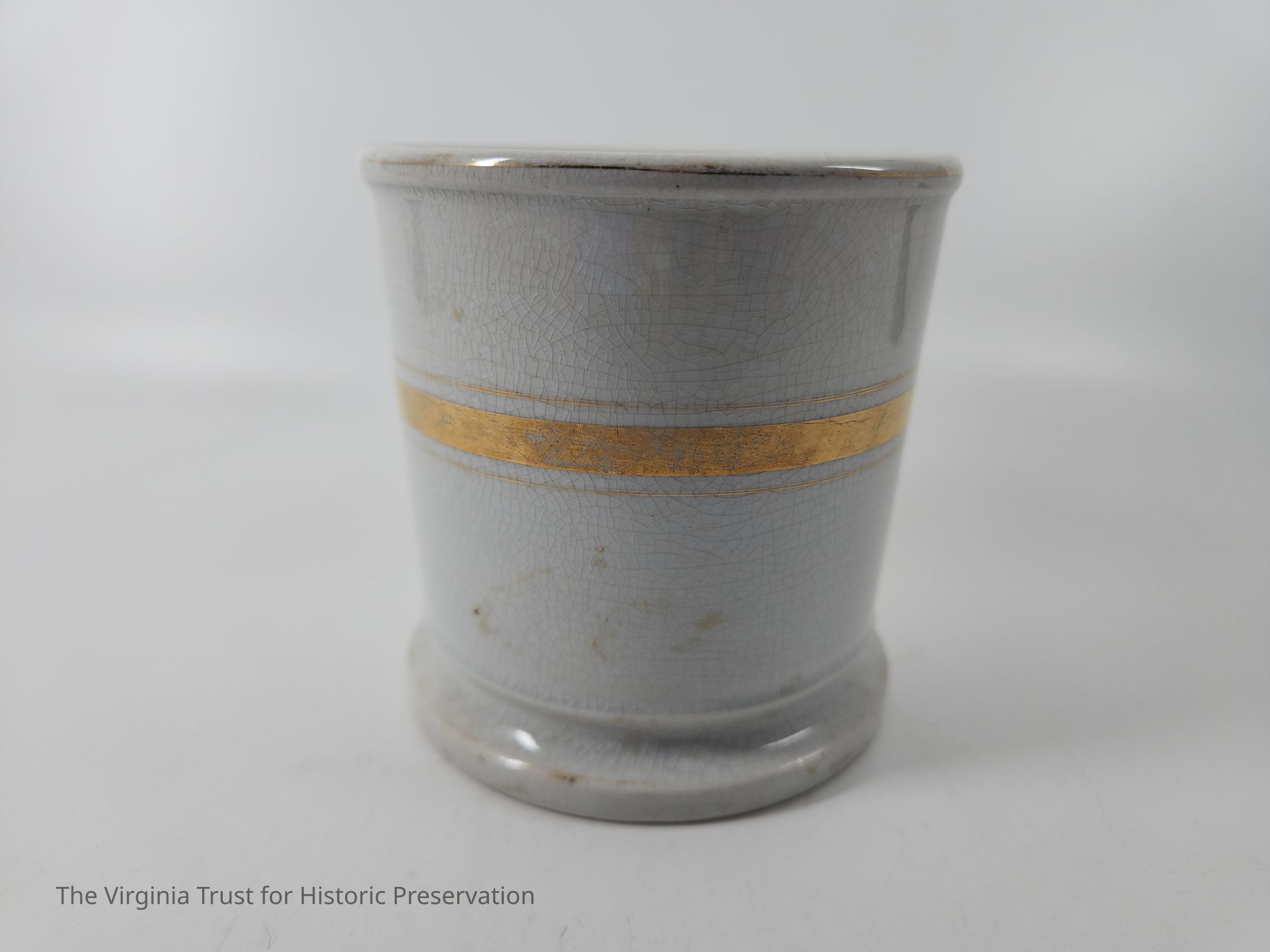 White porcelain shaving mug with gold banding. Marked "Royal Ironstone China Anchor Pottery". Matches soap dish 1986.210 A.
