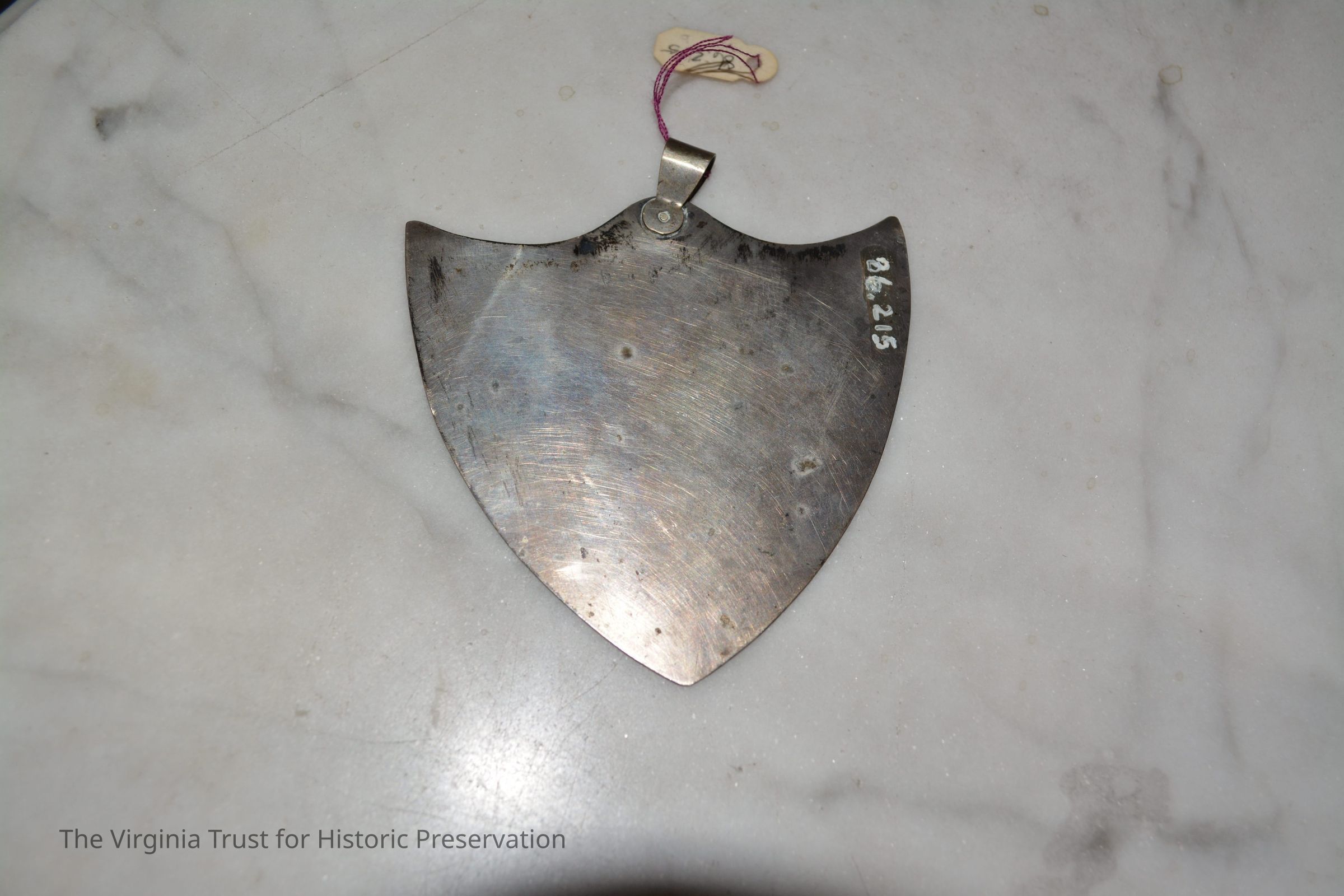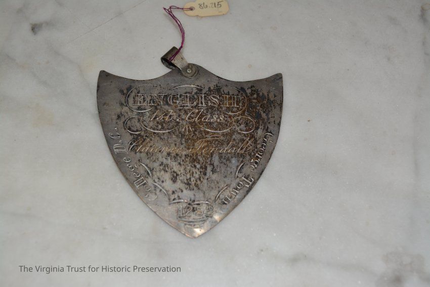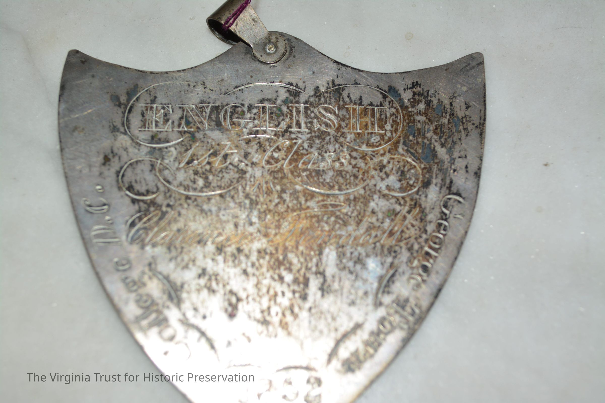 Metal shield marked "English 1st Class, Clarence Fendall-Georgetown College DC, 1852." Has ring for ribbon still attached on top.