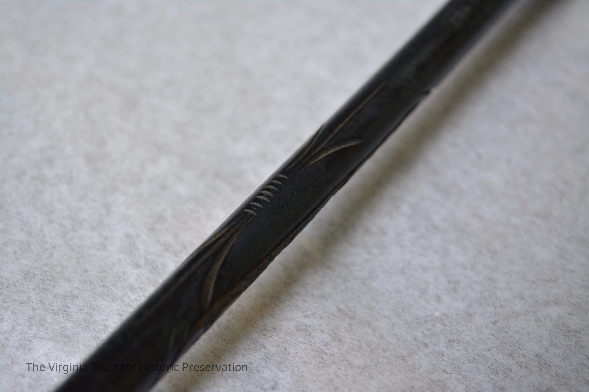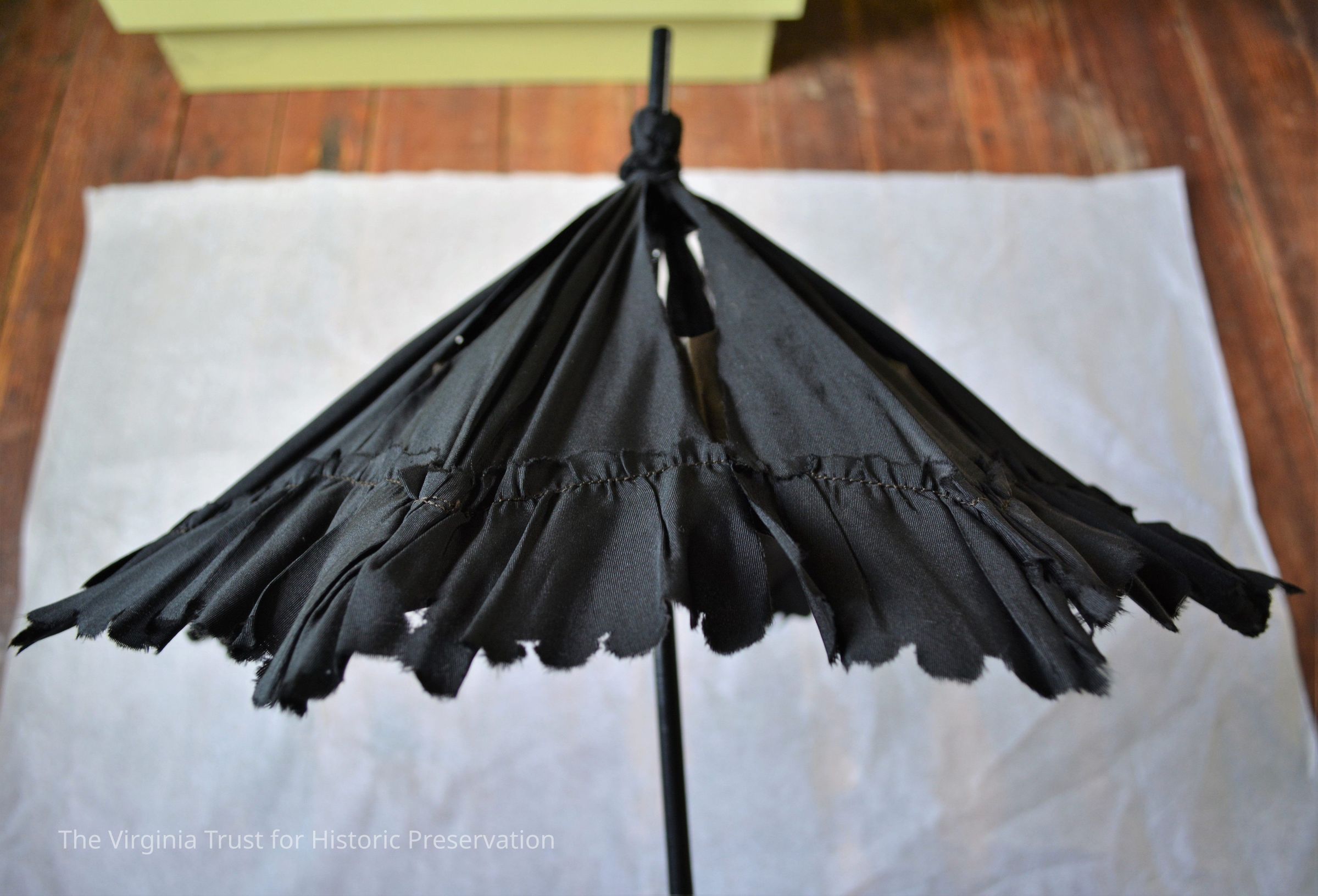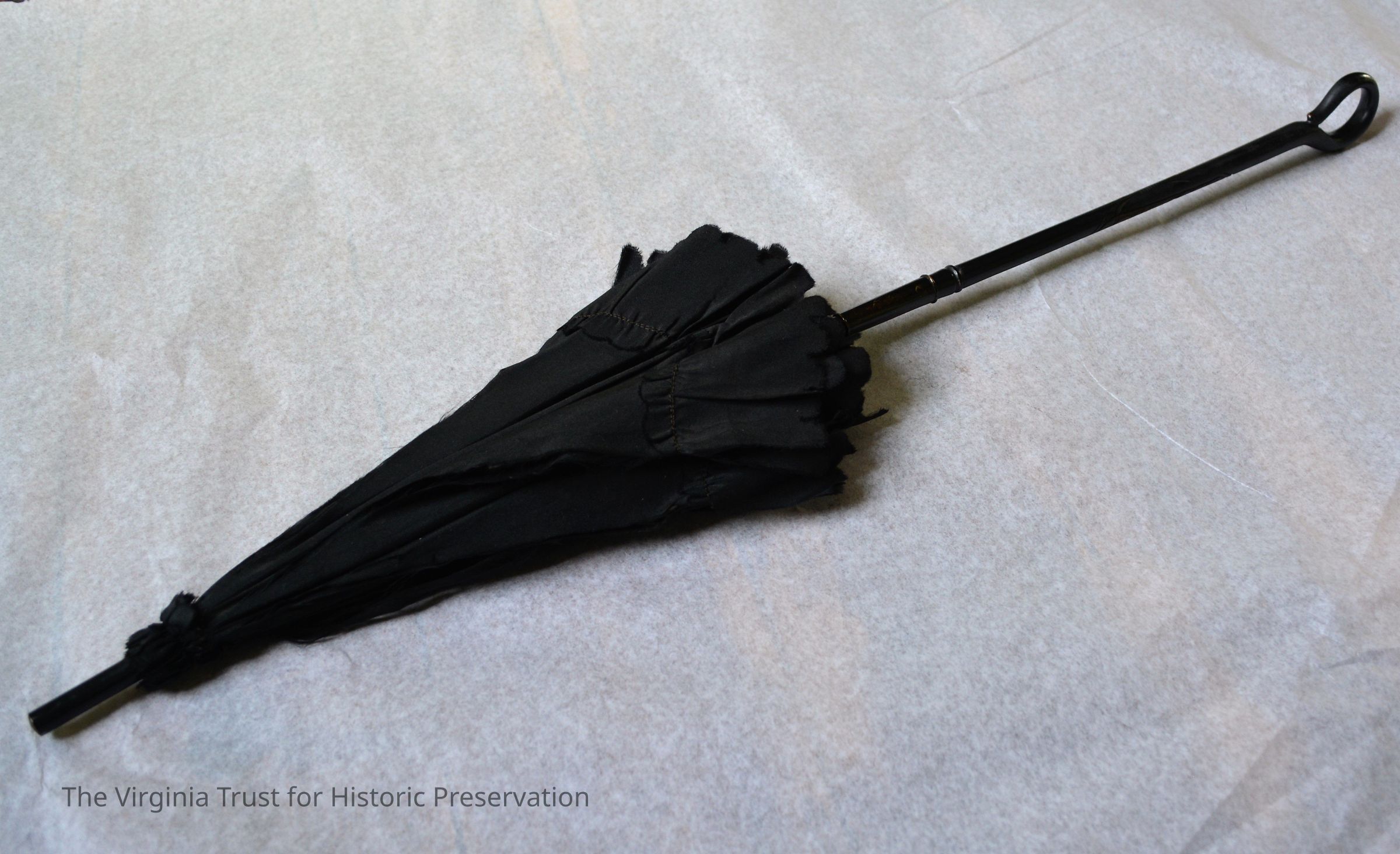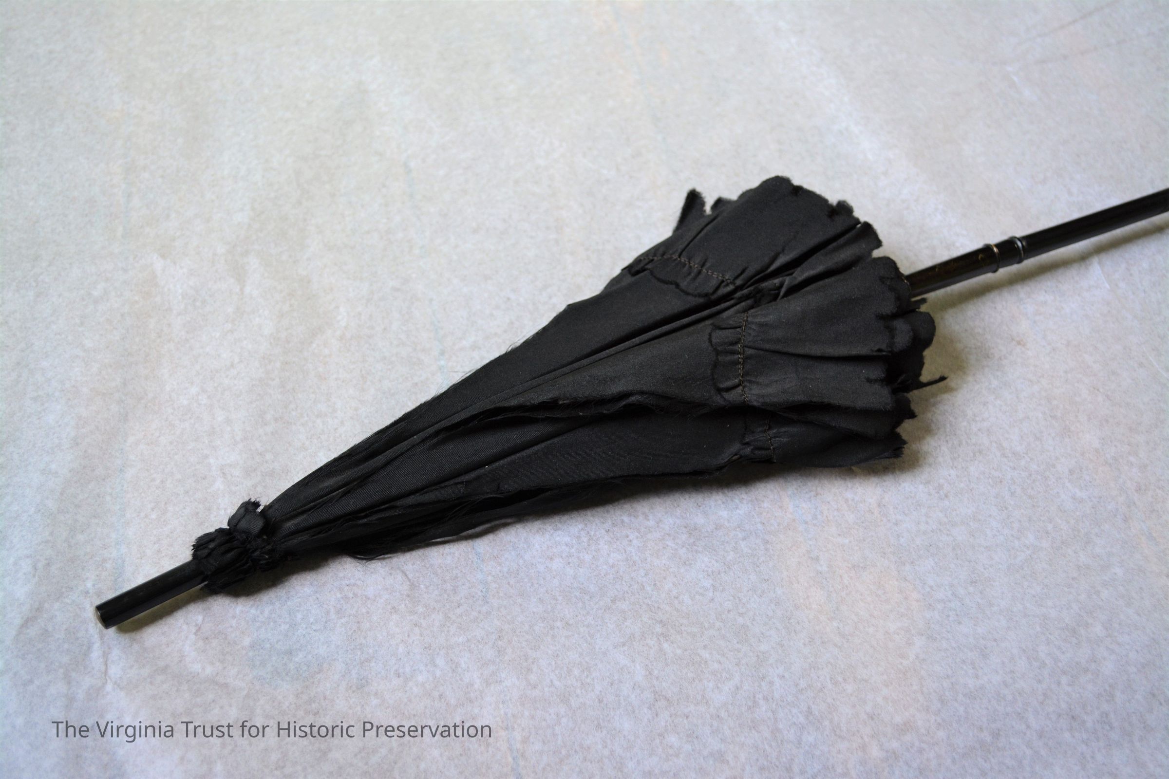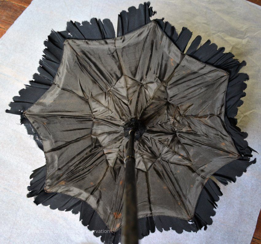 Black silk parasol with folding handle. When the handle is unfolded, a sliding metal tube secures it in place. Handle carved with floral design. Possibly used for mourning.