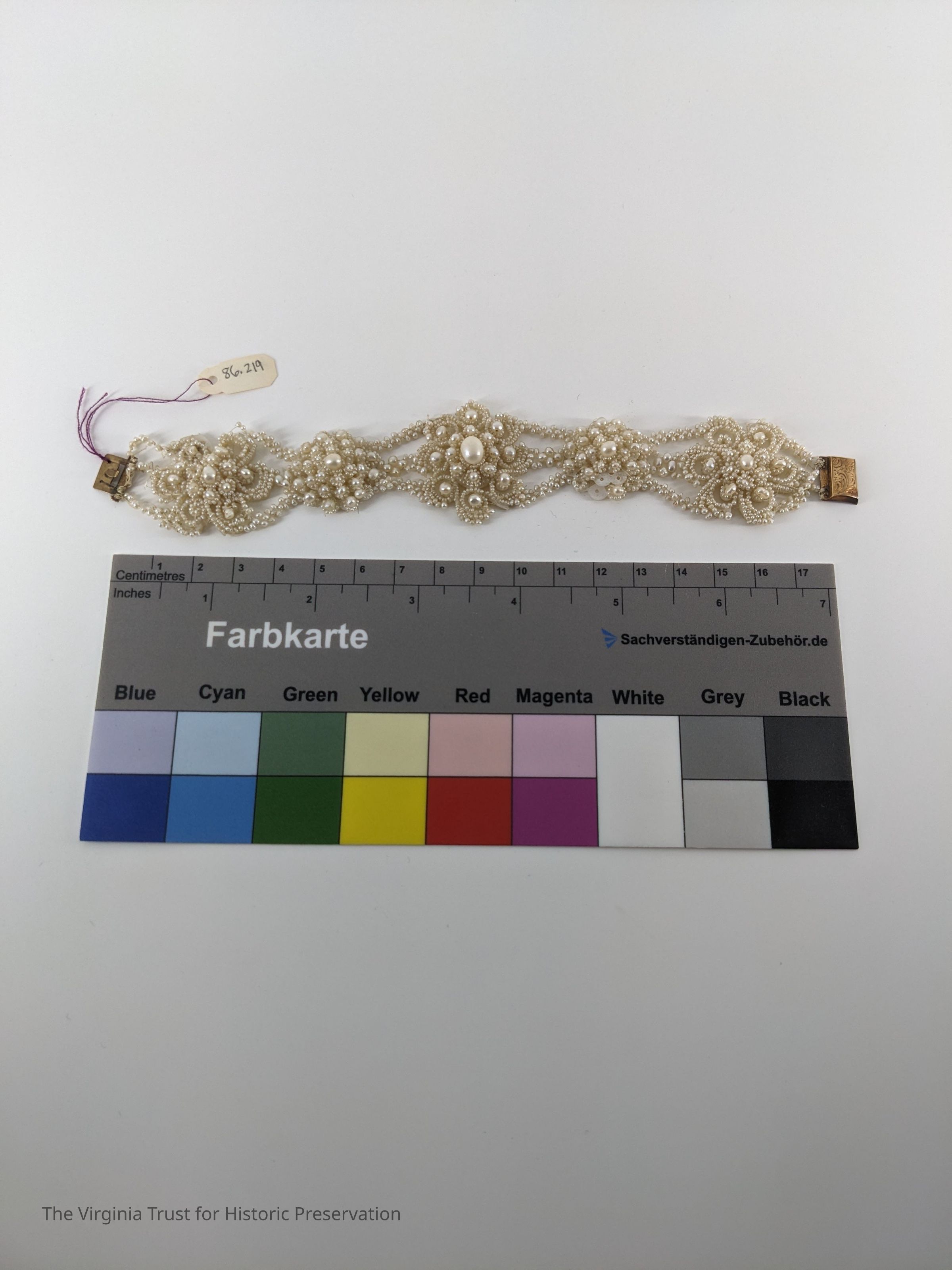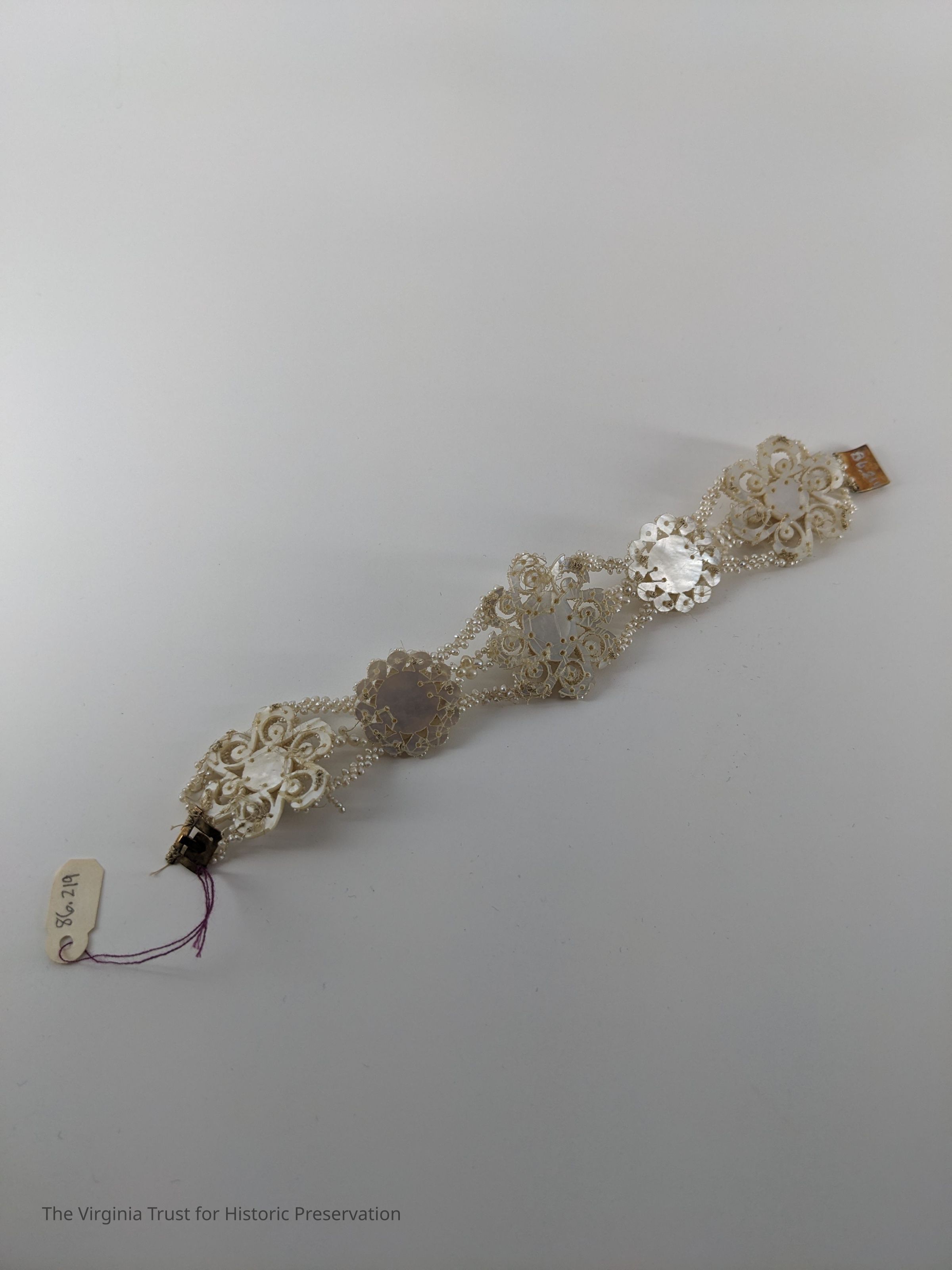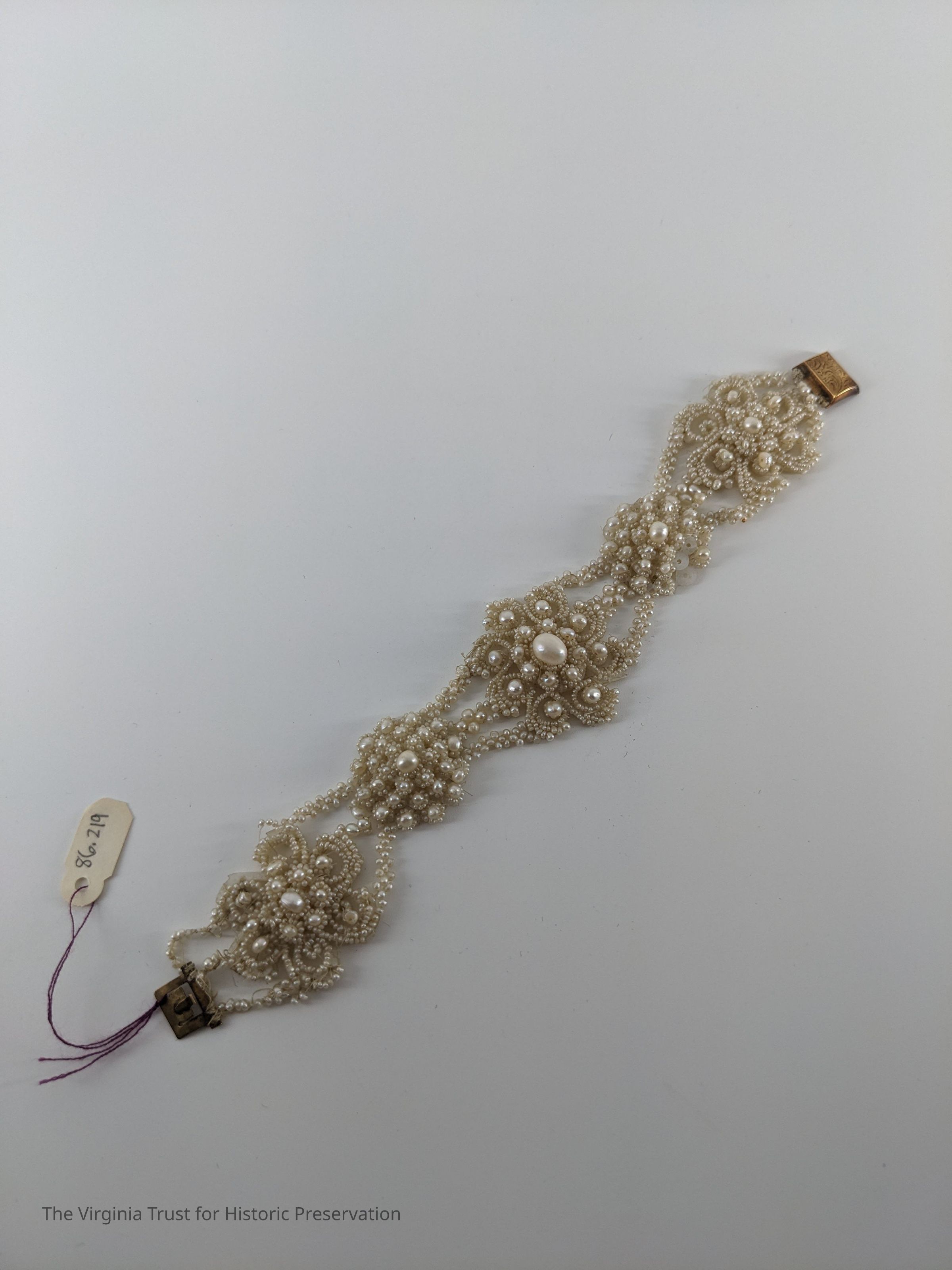 Lady's pearl bracelet. Five circular rosettes, with a gold clasp. Hundreds of seed pearls with larger natural pearls in the center of each rosette. Pearls appear to be mounted on mother-of-pearl carved disks and sewn. Mid-nineteenth century.