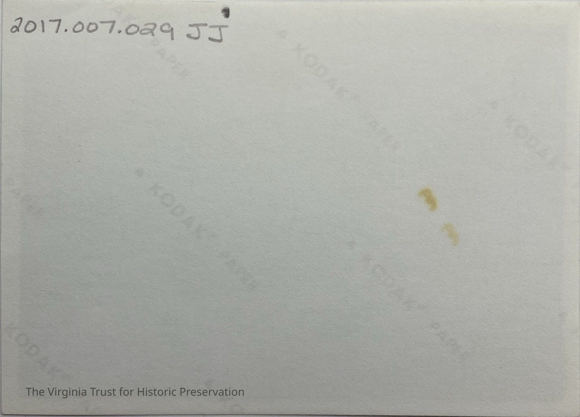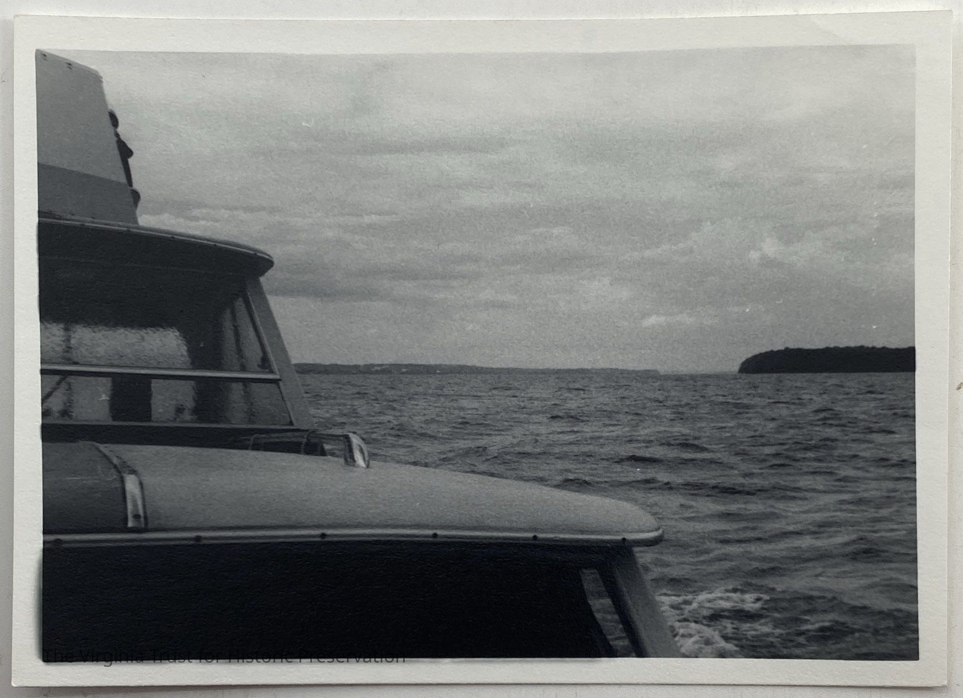 Black and white photograph of a boat on a body of water. Land masses in the background. White border with straight edges.