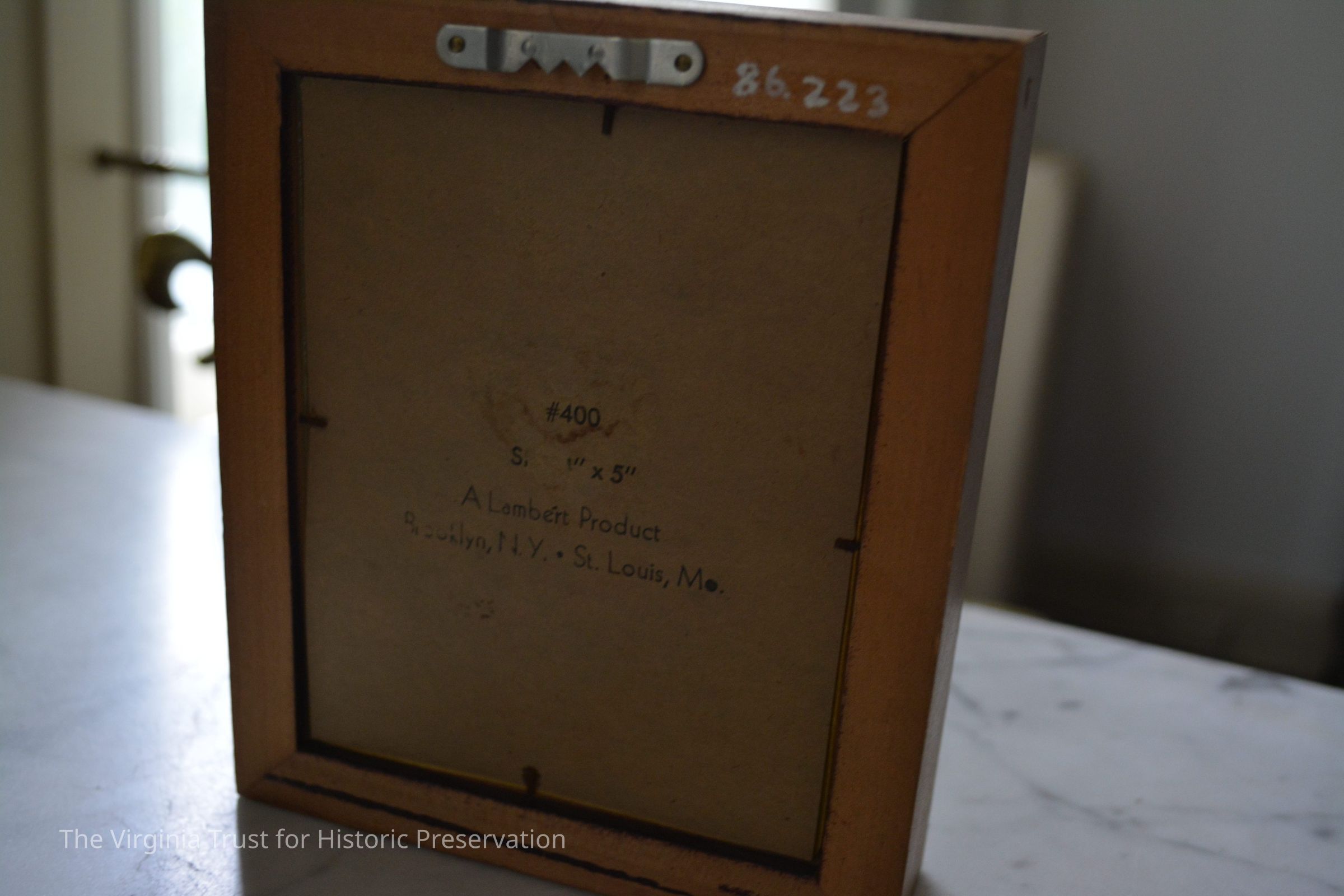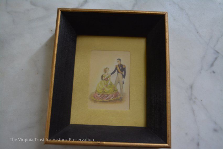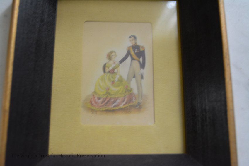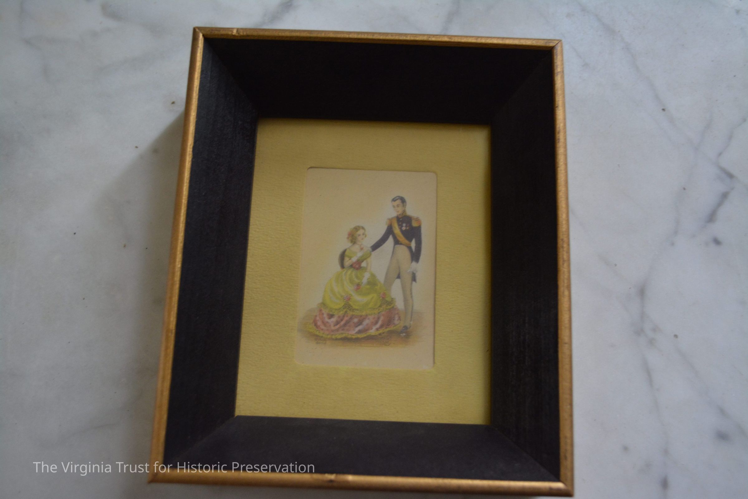 One of a set of three framed cards, each depicting a gentleman and lady in dress clothes.