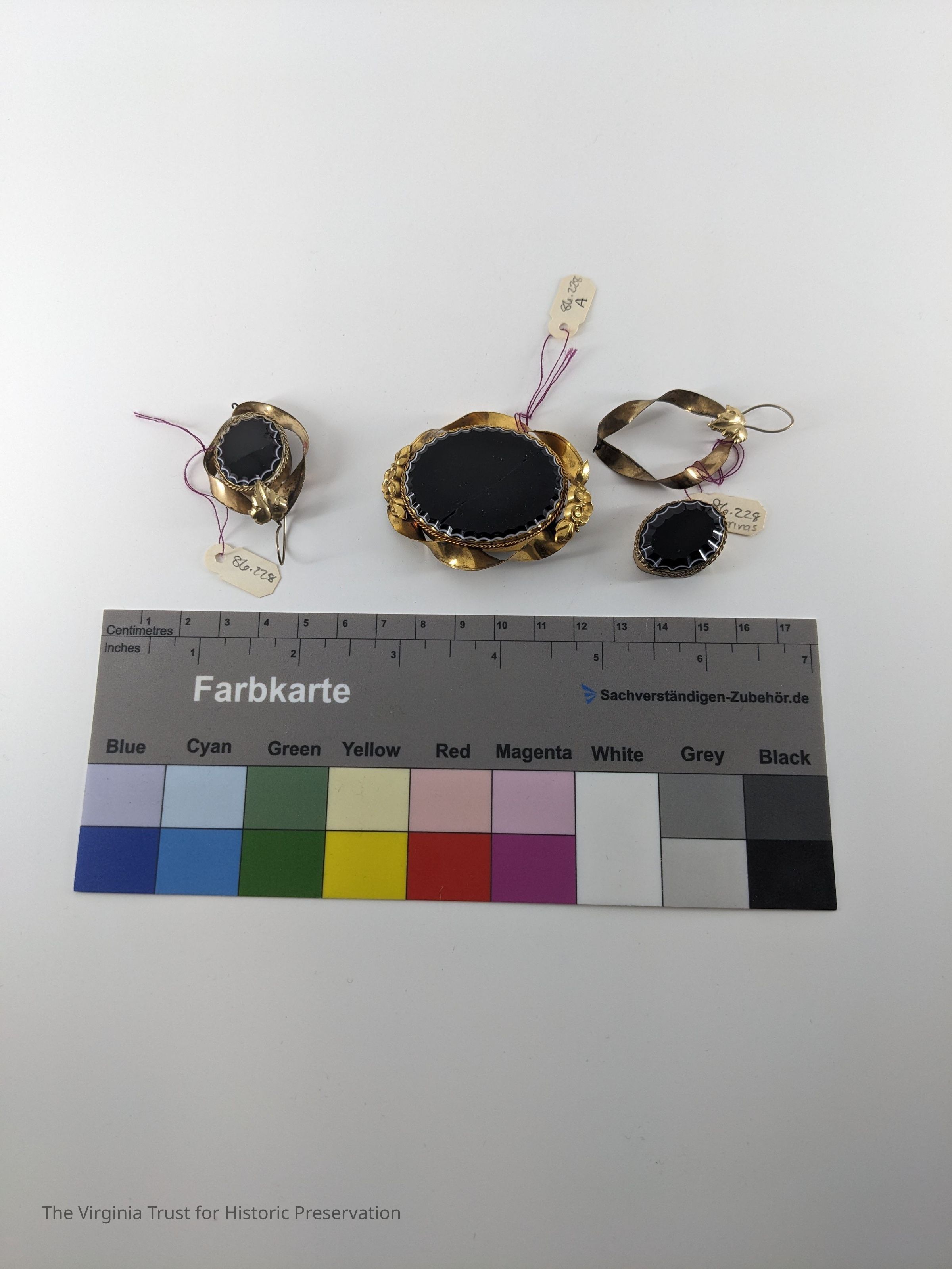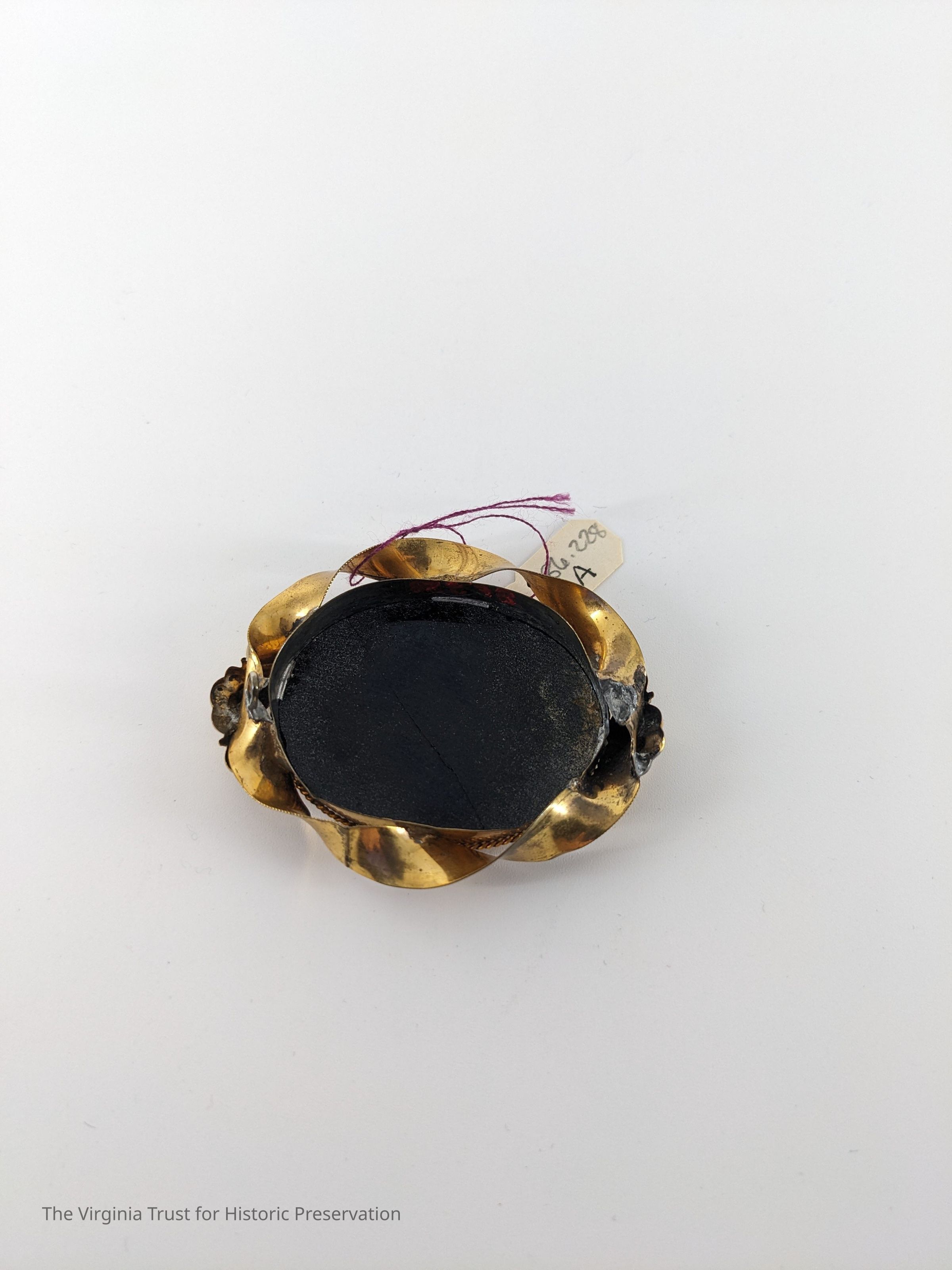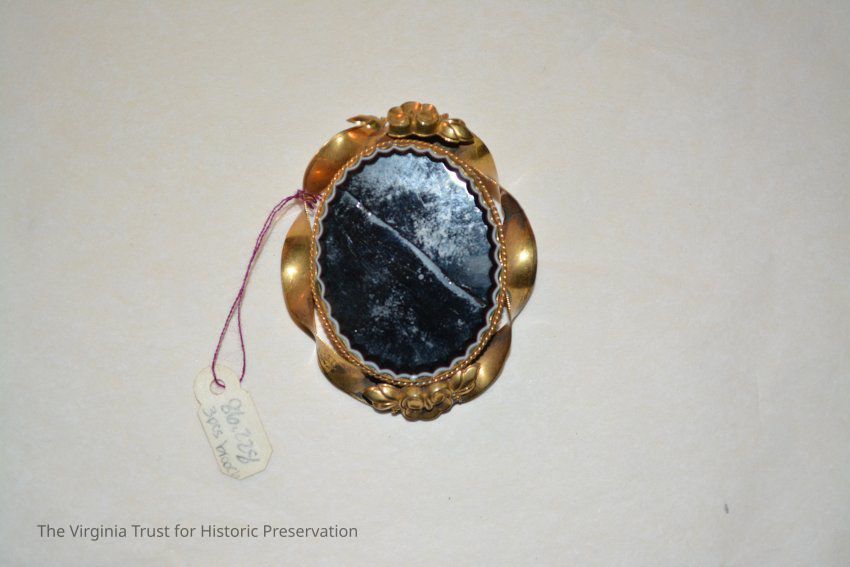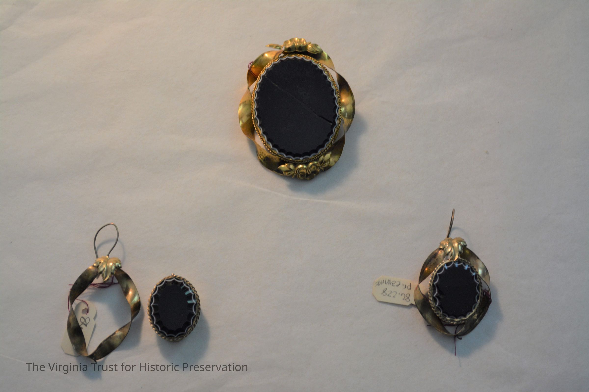 Brooch in gold setting with large black oval stone in center. Setting is twisted gold. Matching earrings (pierced).