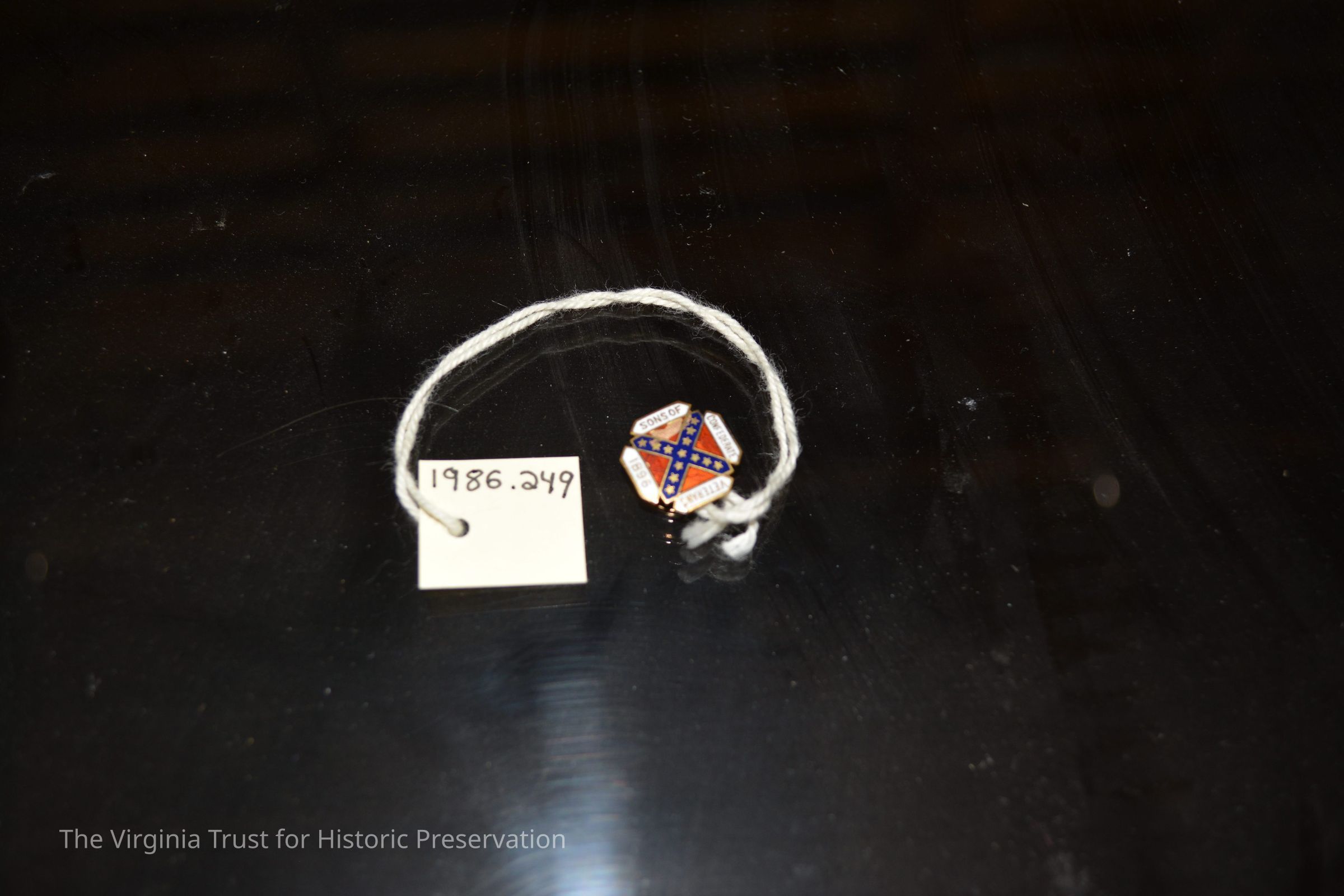 Small membership pin attached to blue box. Marked "Sons of Confederate Veterans, 1896."
