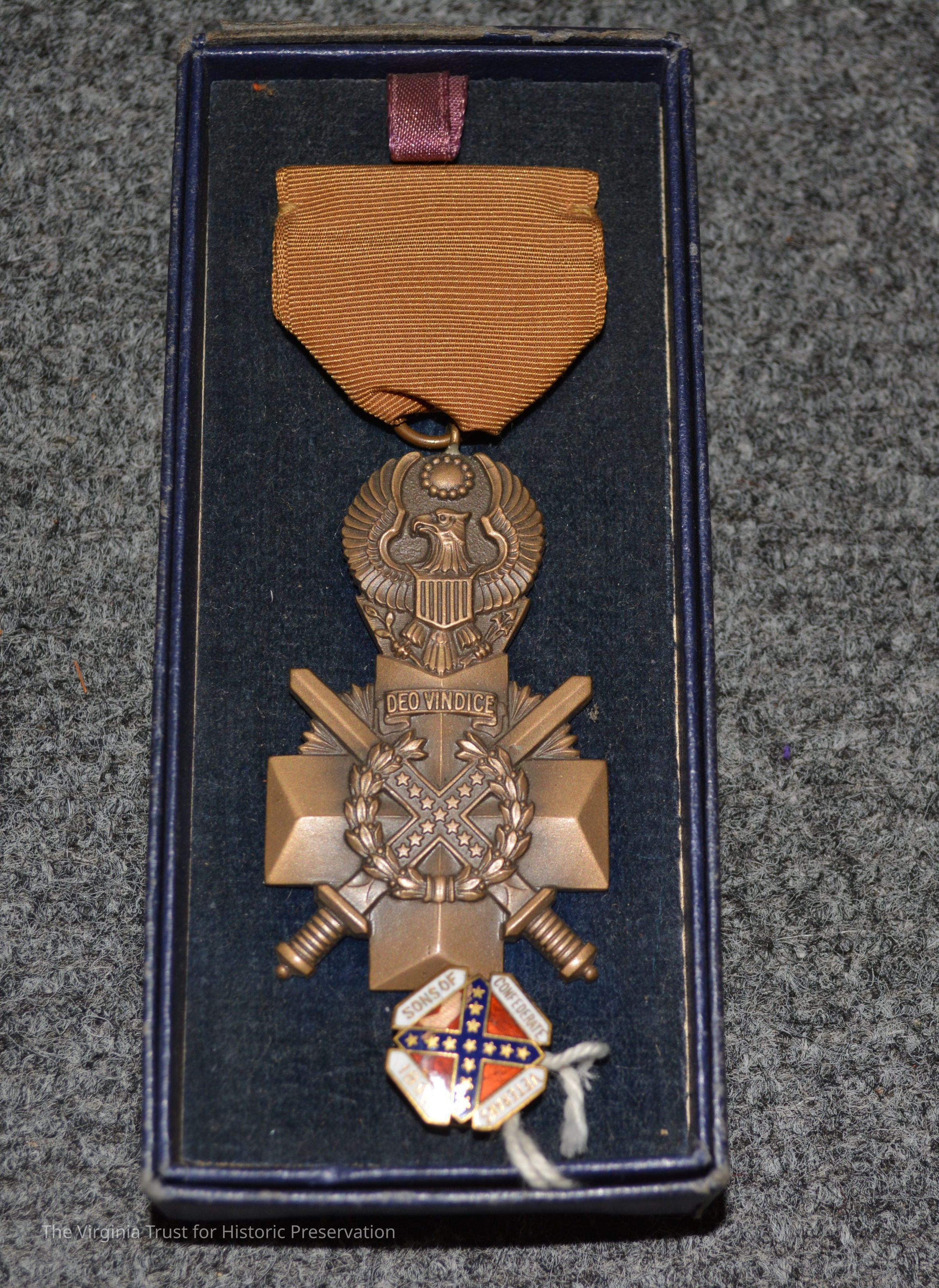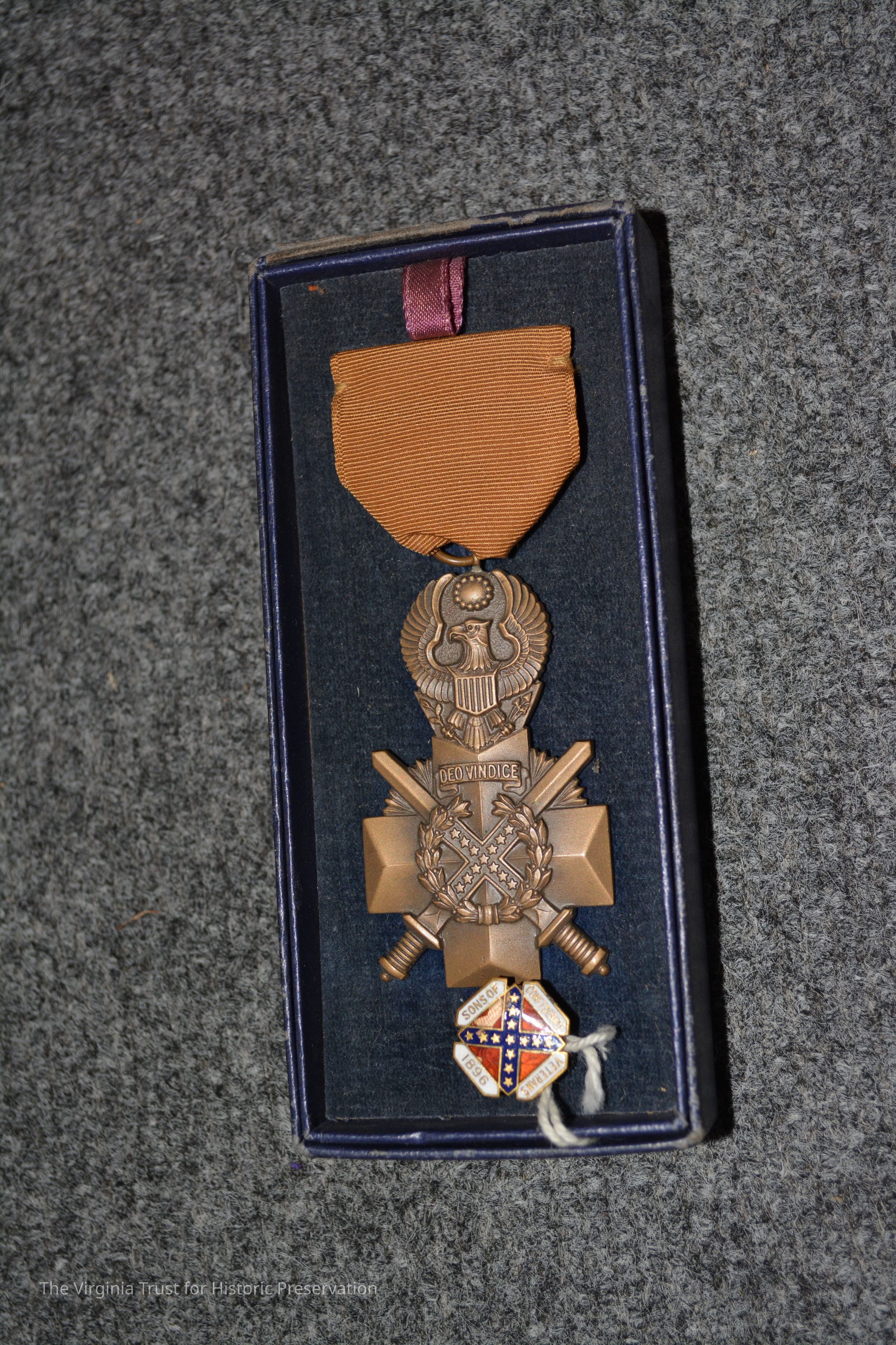 Medal attached to a gold ribbon. Medal is pinned in a blue box (5" x 2 1/4"), a letter found in the box has been removed and placed in the file. Letter states "worn by the 'Stars and Bars' being descended from officers of Confederate soldiers & sailors." Medal has crossed confederate swords with eagle above.Dimensions