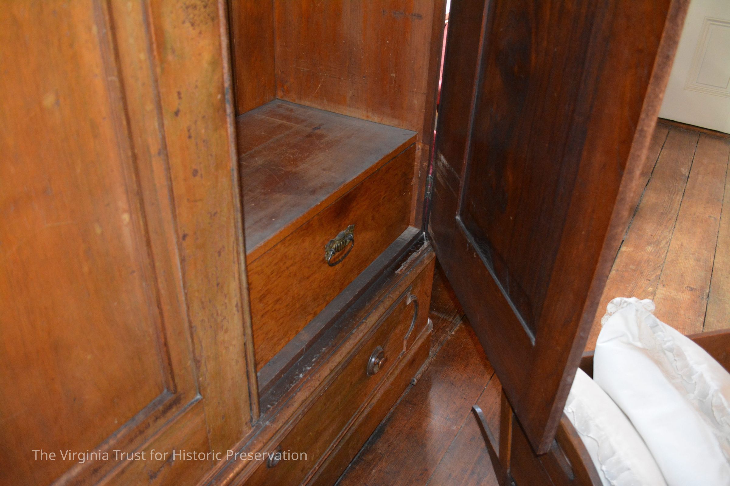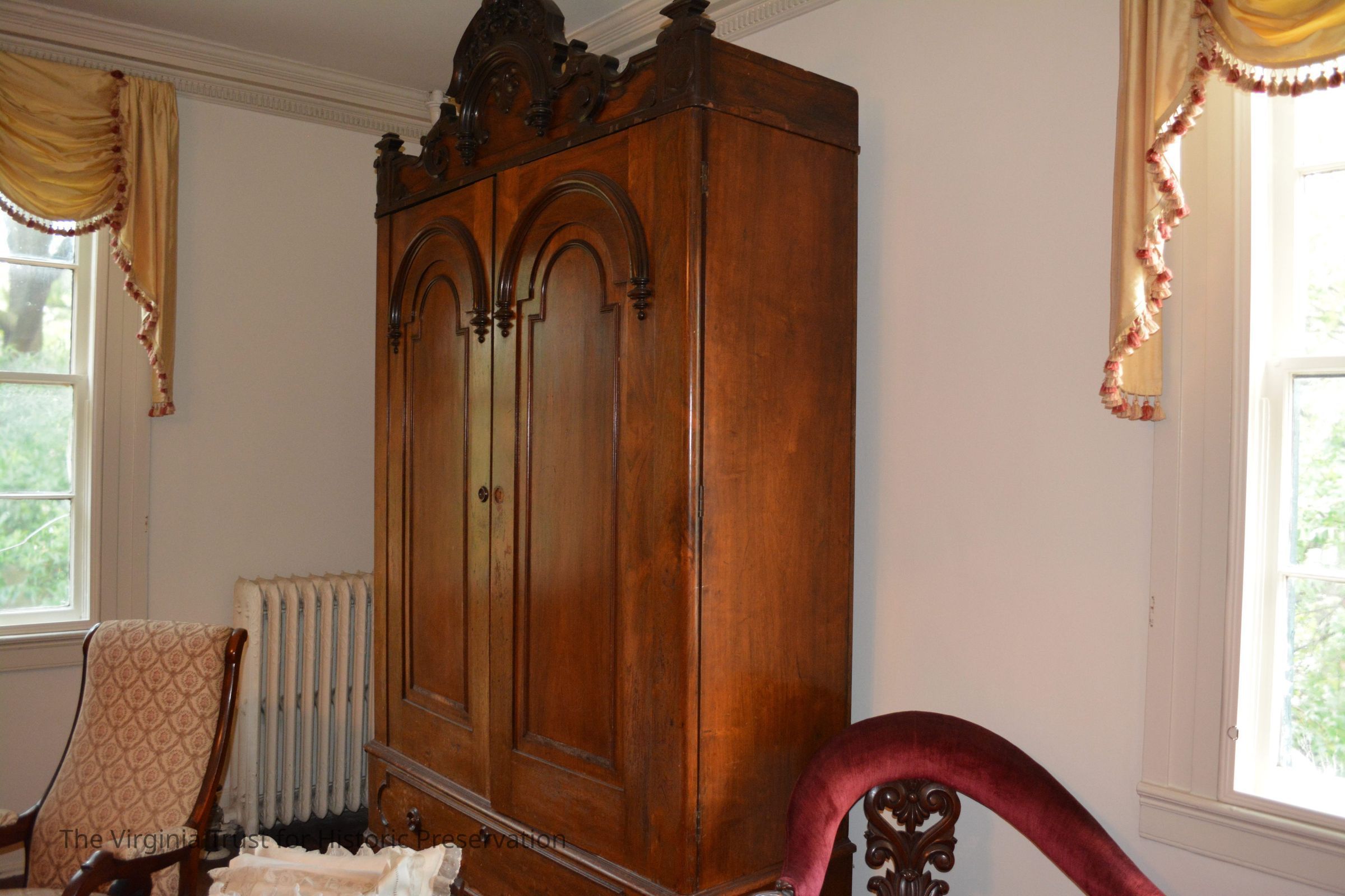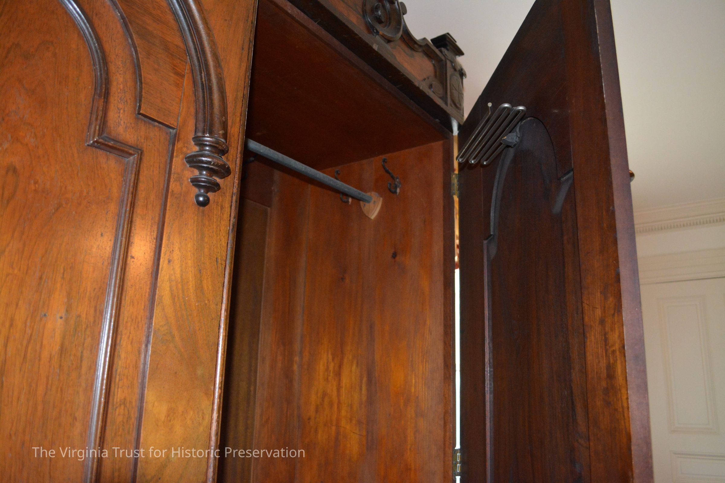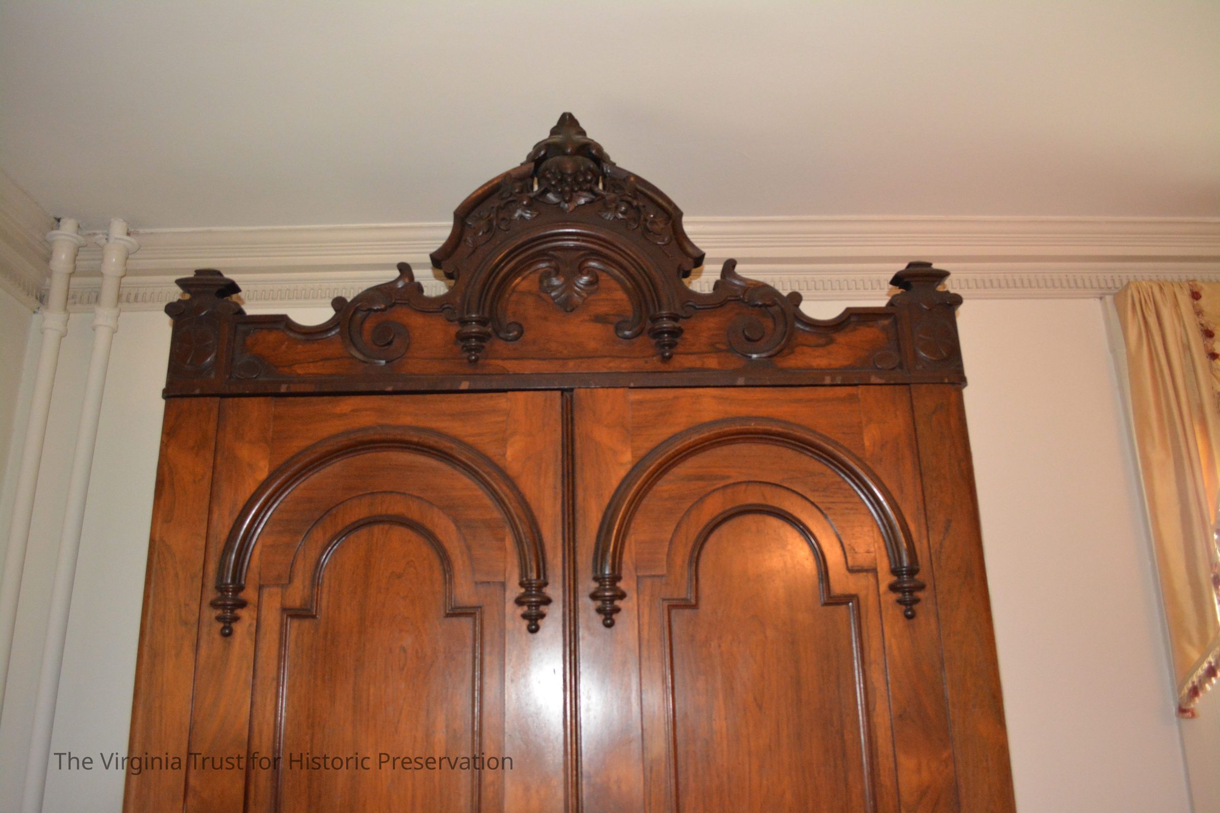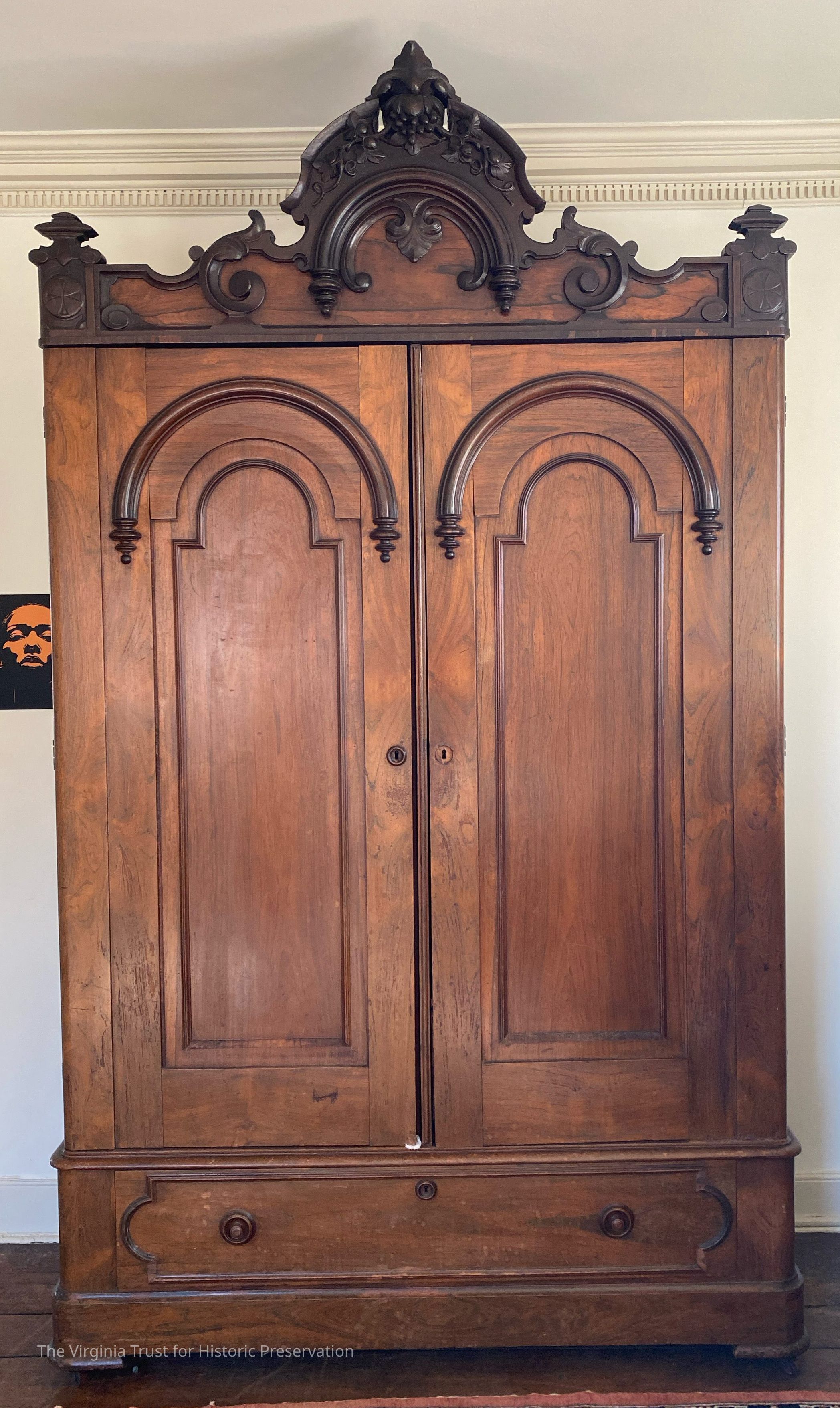 Wardrobe on a base with one large drawer, the center part having two large drawers each fitted with an inner drawer and hanging space, over which is a high ornately carved top. Part of a set of five mid to late Victorian rosewood bedroom pieces. Possibly made by George Henkel of Philadelphia.
