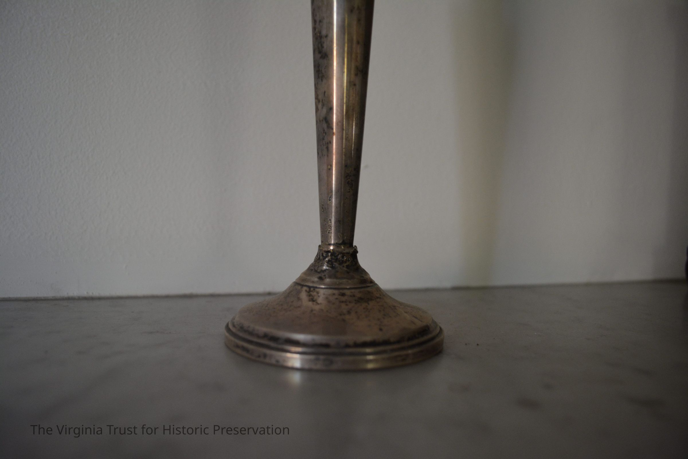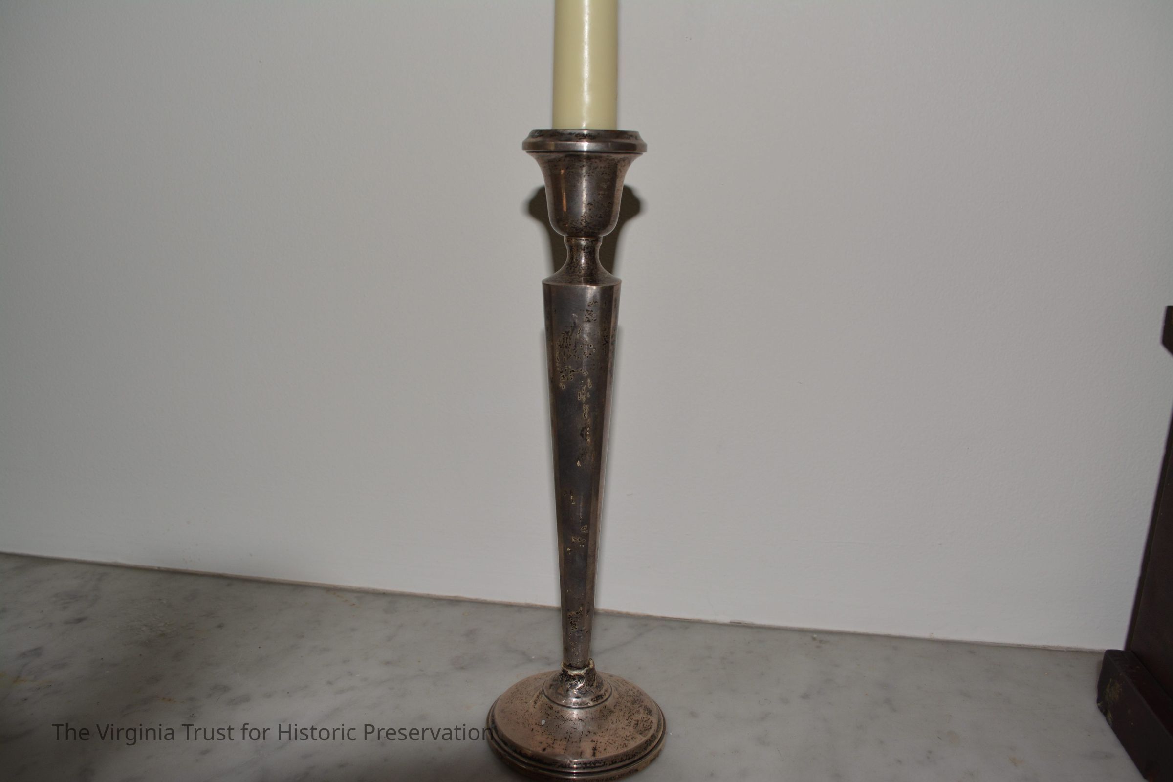 One of a pair of silver-plated candlesticks. Marked "Sterling reinforced with cement 408."