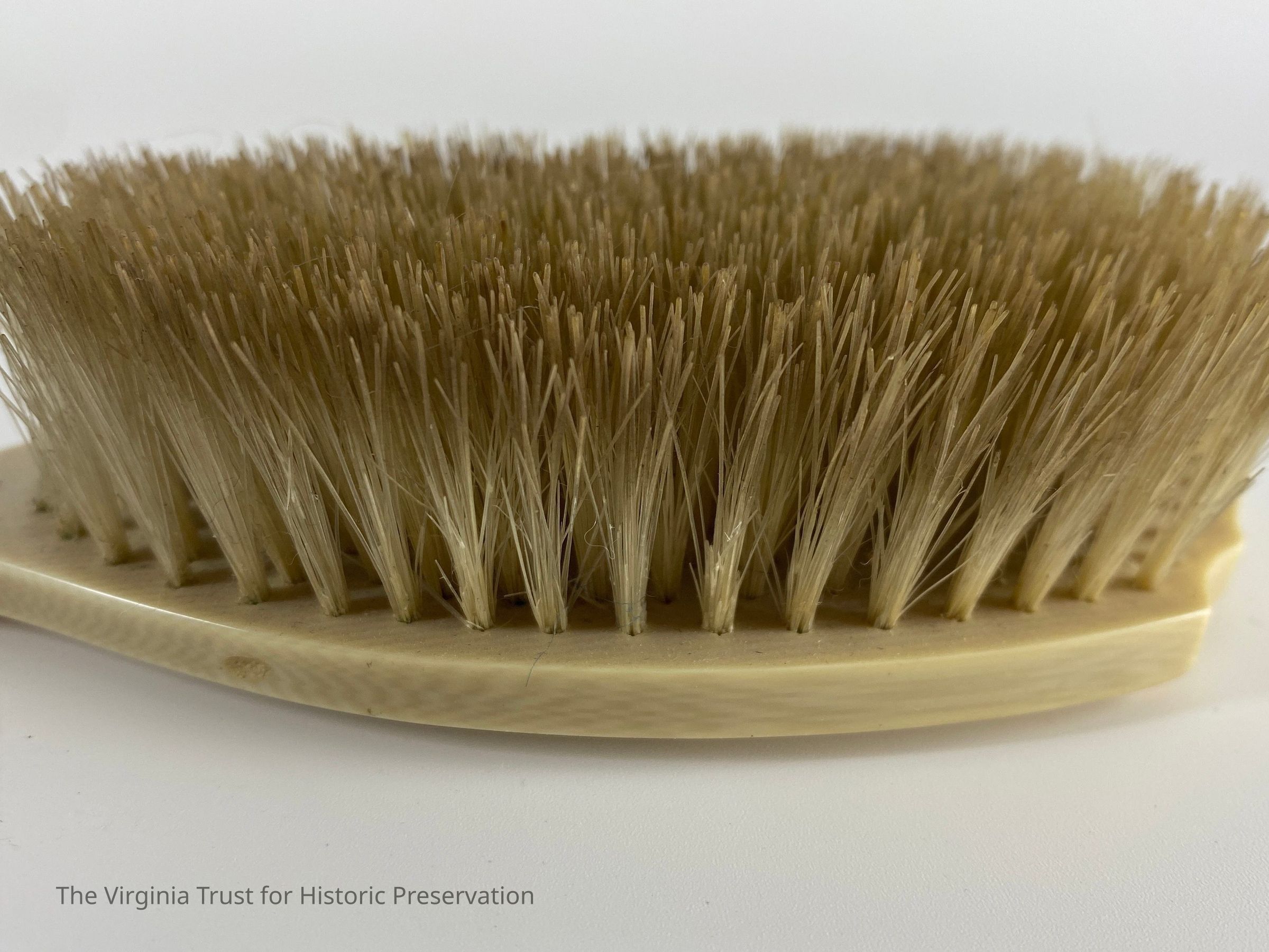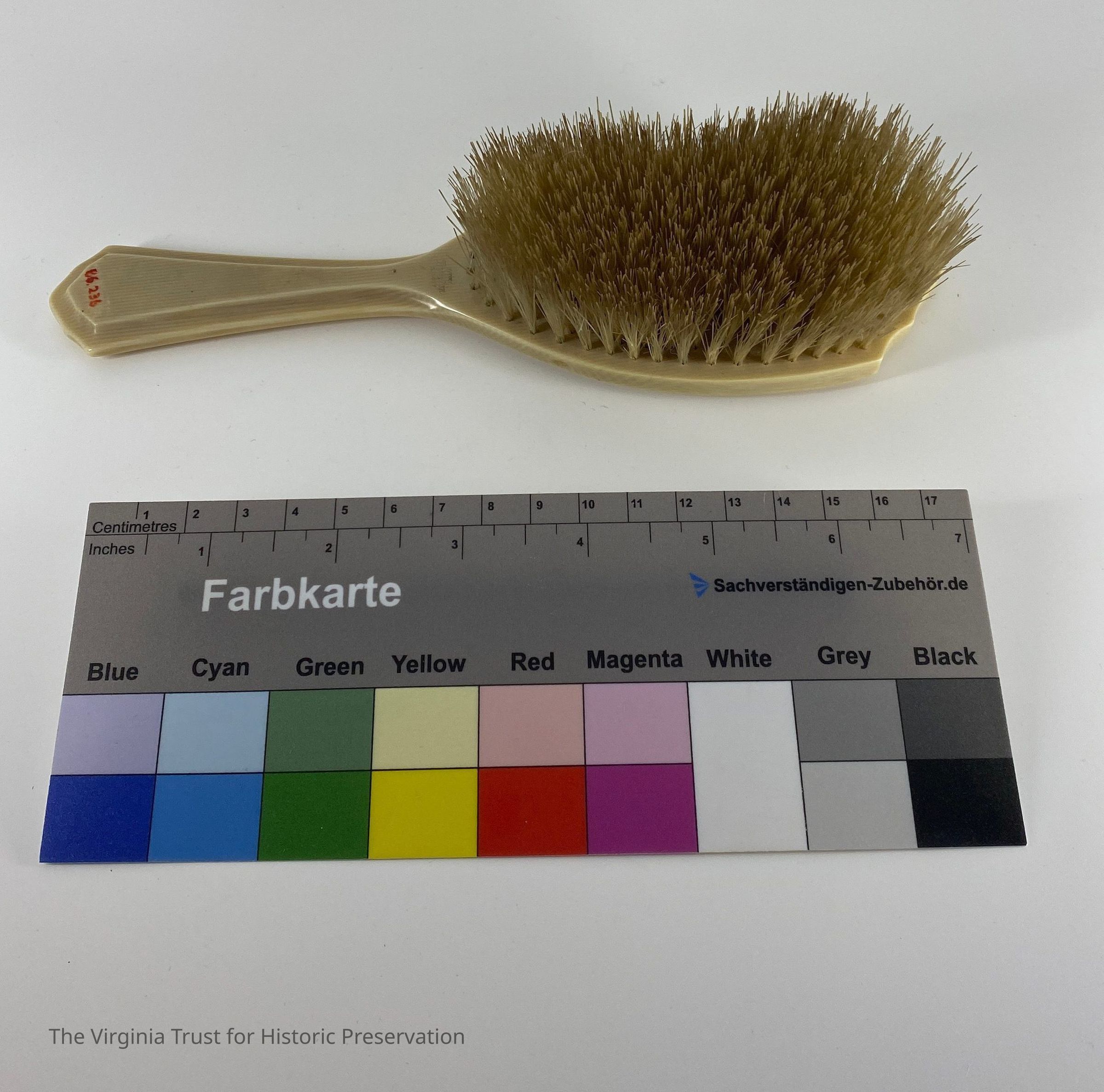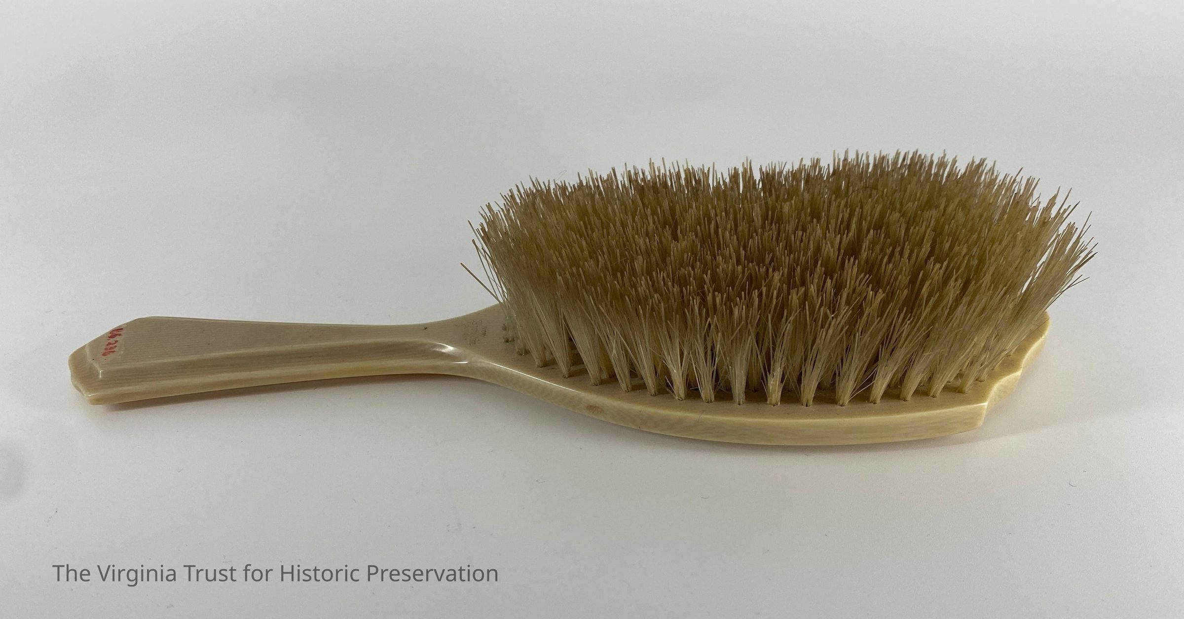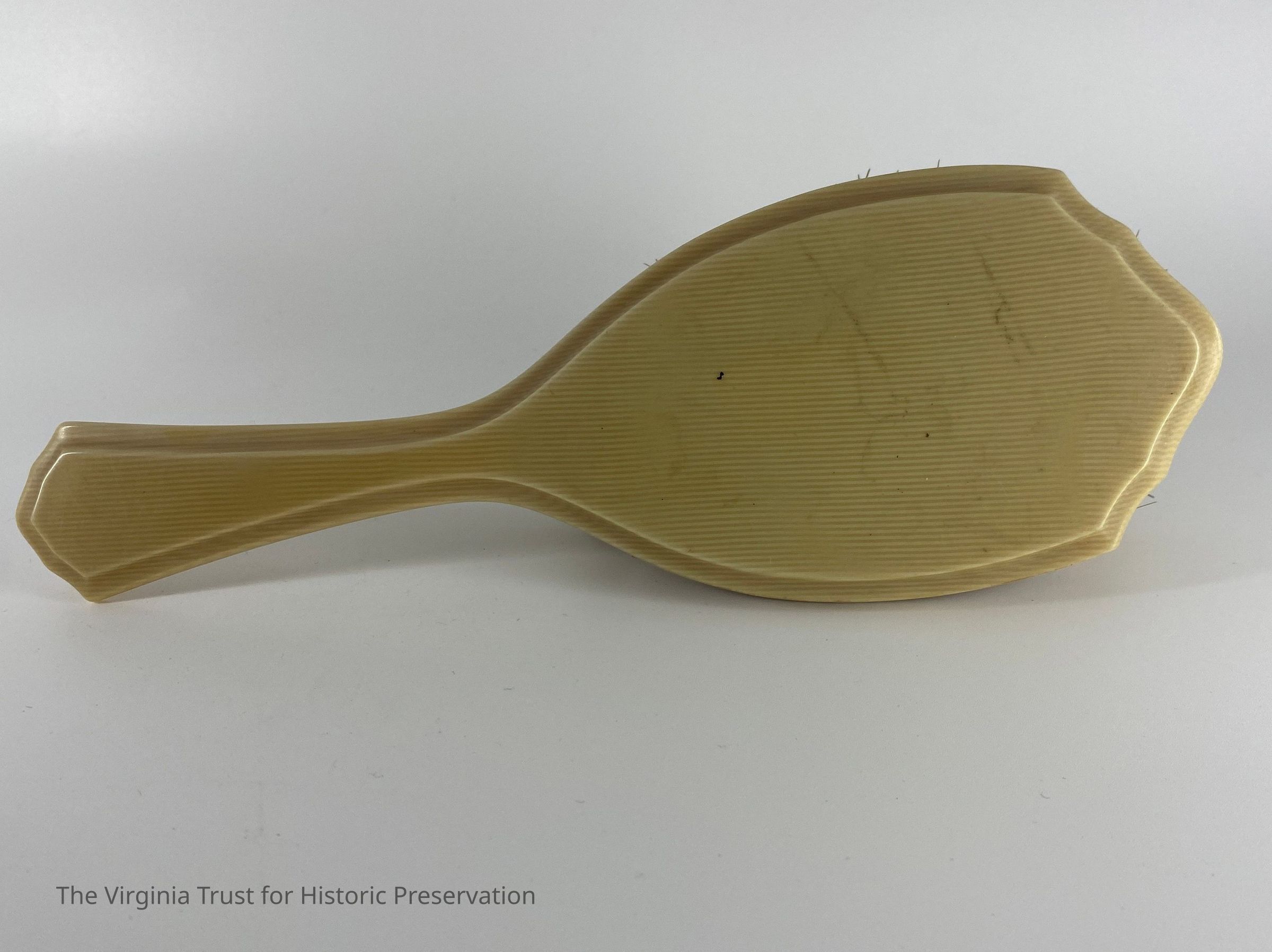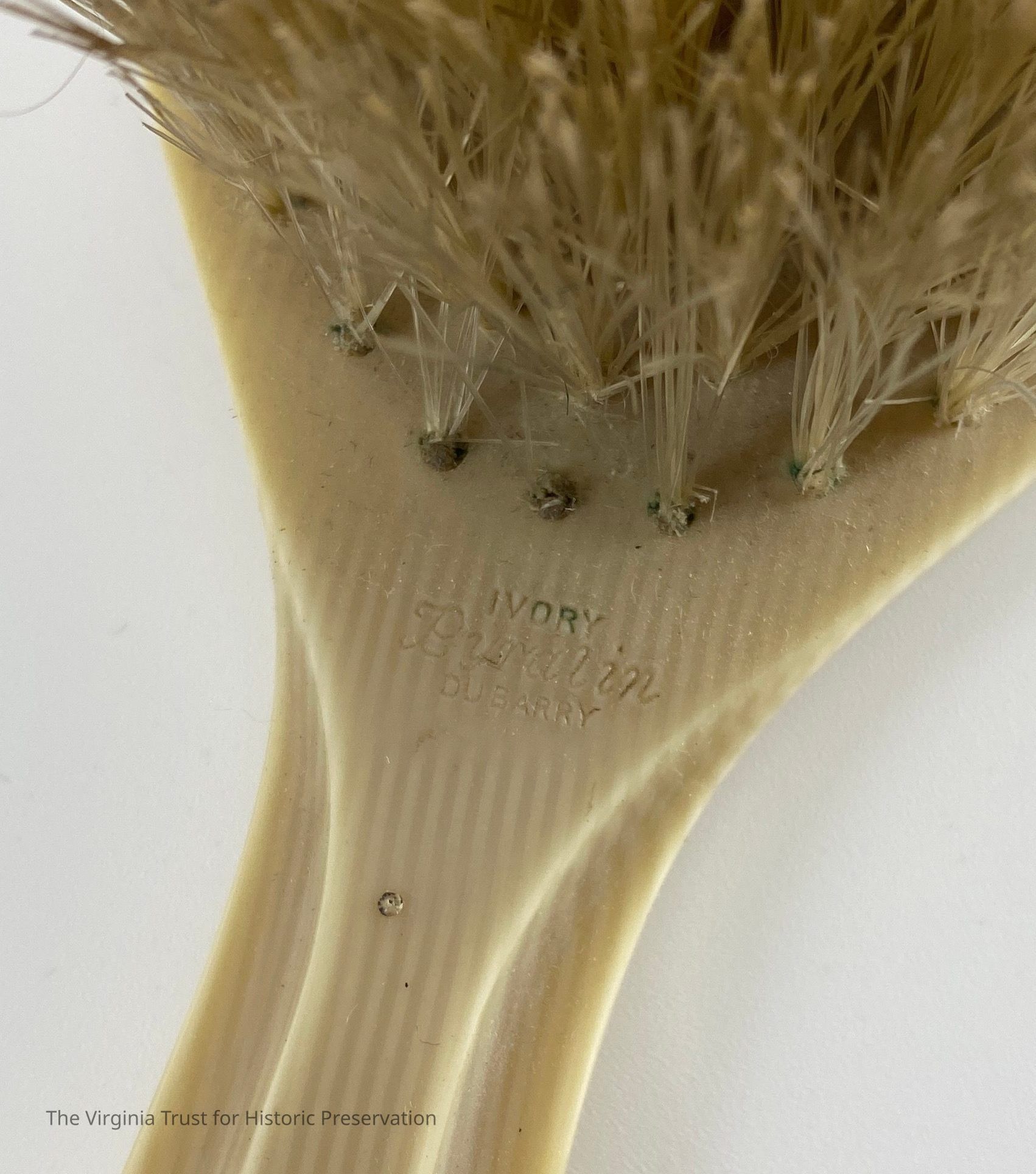 Ivory colored dresser set consisting of brush, comb, mirror, button (or corset) hook and nail implements. Nail implements unidentified and unmarked. Brush says "Ivory Pyralin DuBary."