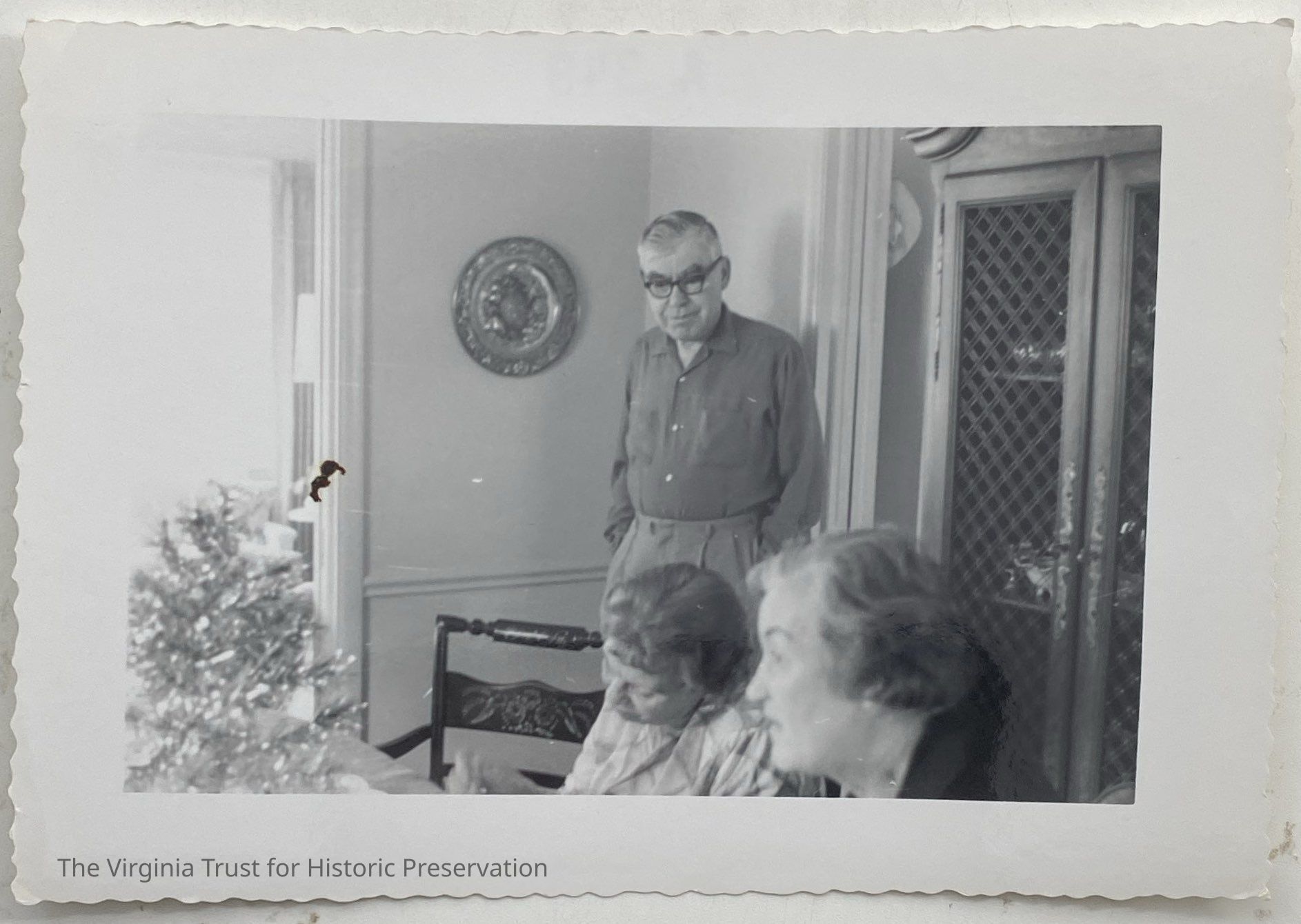 Black and white photograph of a man standing with two women sitting at a table in a room. Furniture all around them. White border with grooved edges.