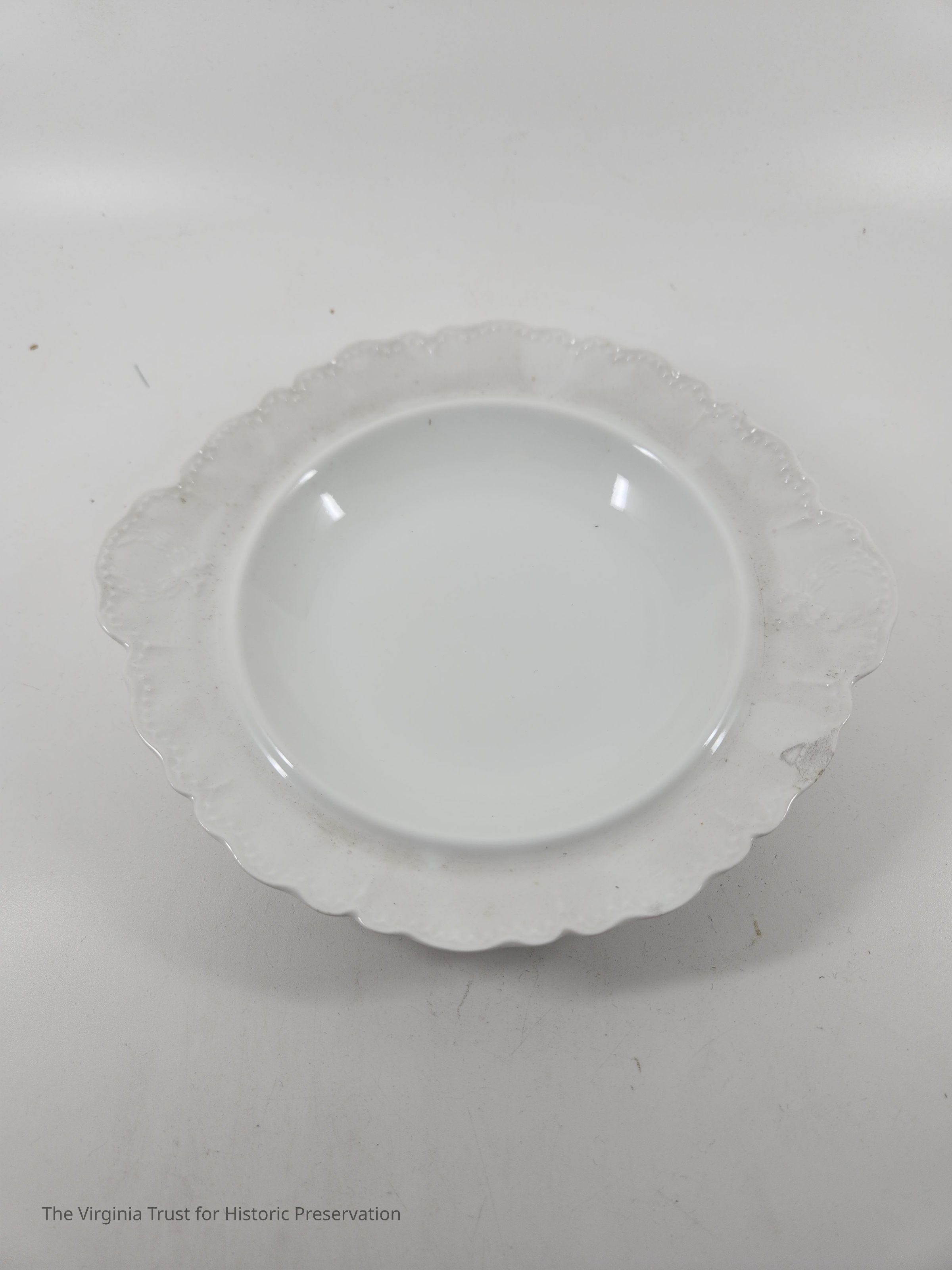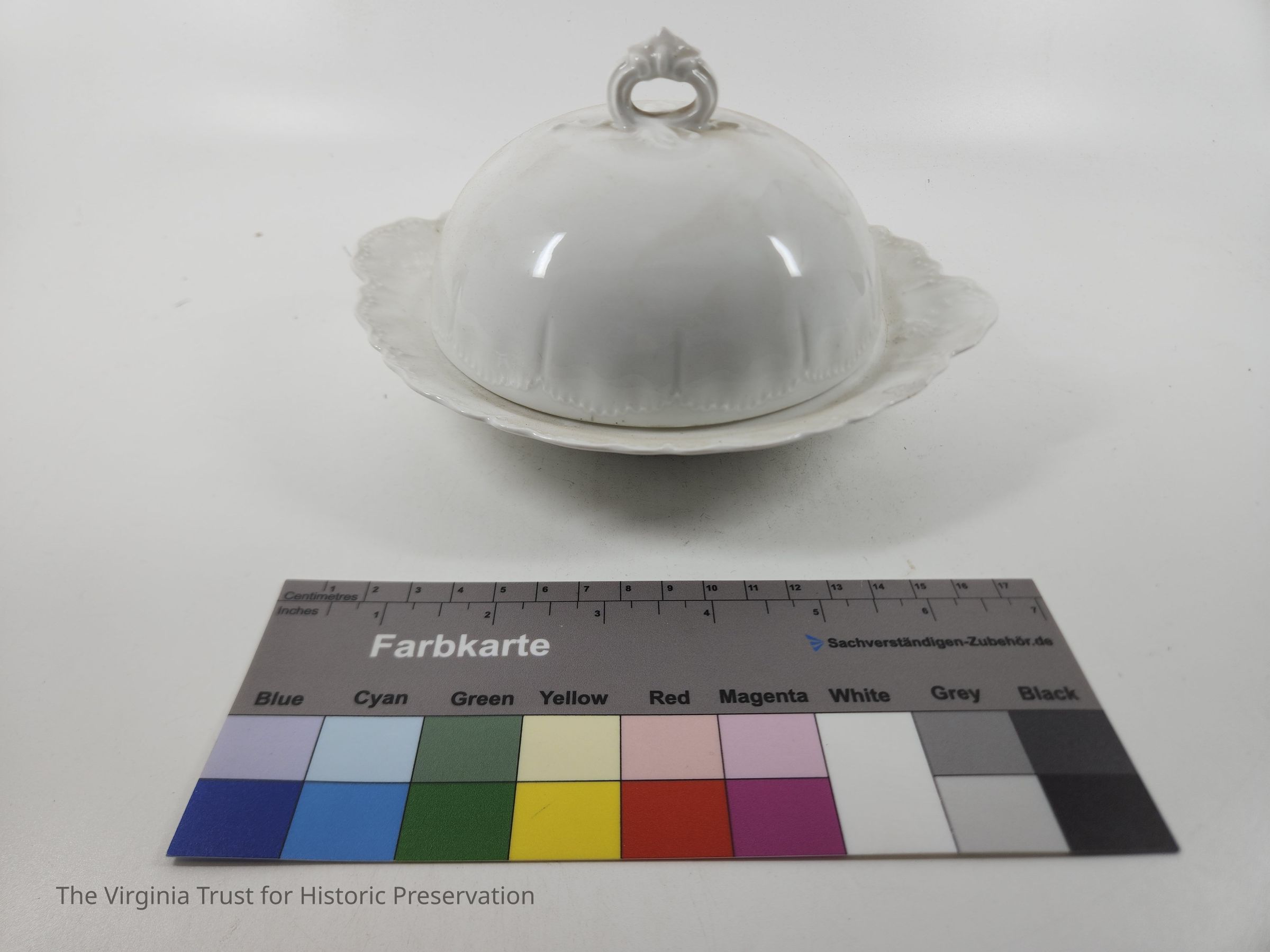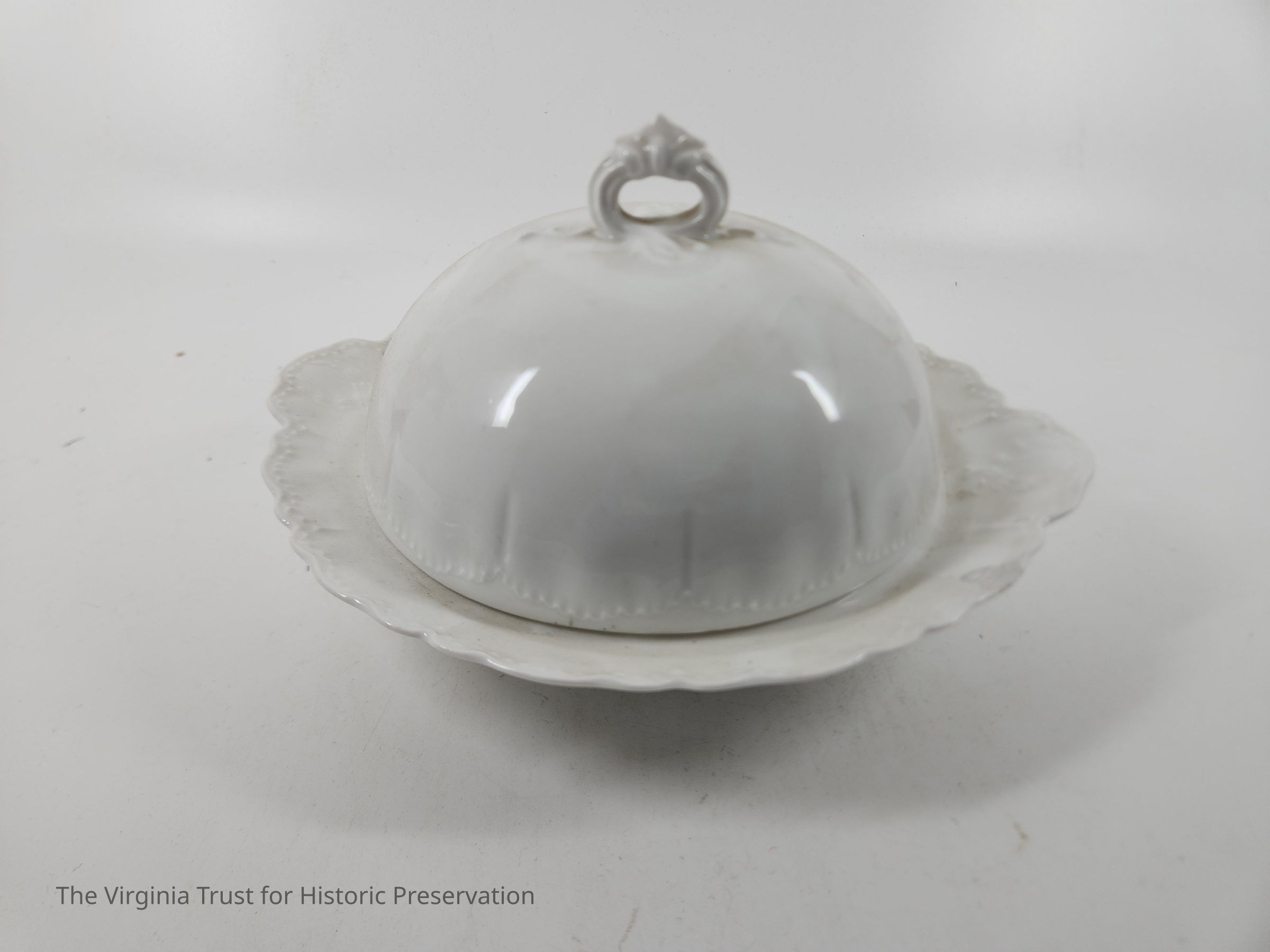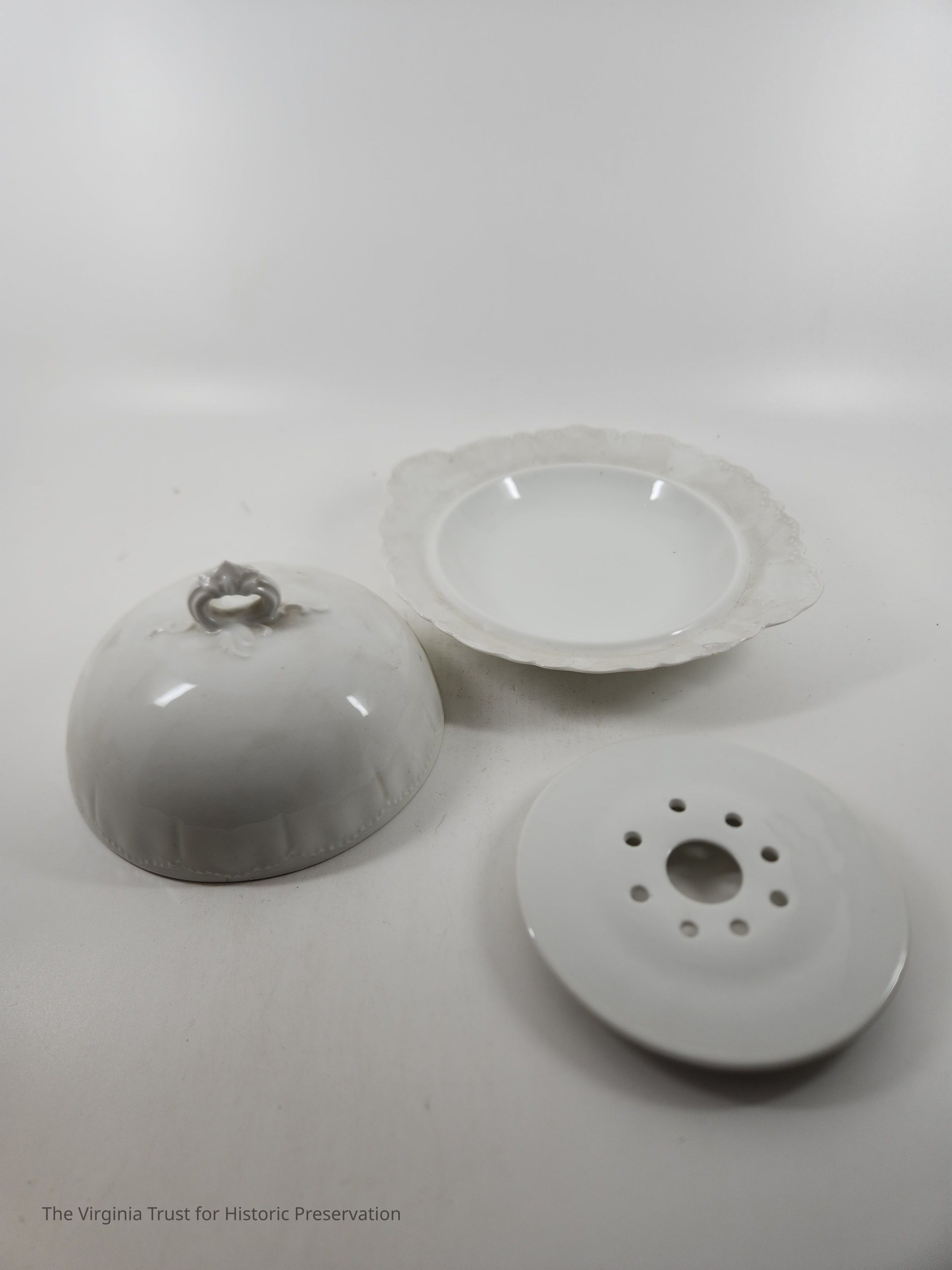 Three piece white ironstone butter dish marked "Haviland France." Removable drainer. Ironstone is a very durable ceramic that was used as a cheaper alternative to porcelain.Dimensions