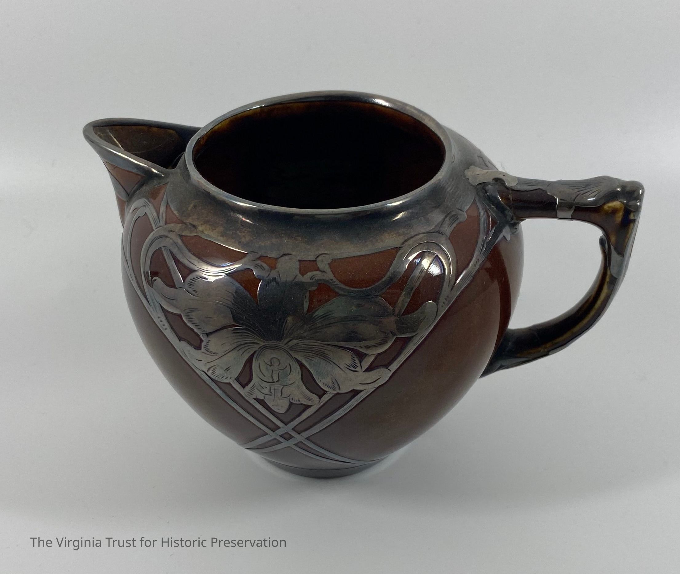 Creamer, dark red-brown Lenox with silver overlay. Part of a 3-piece tea set (tea pot, sugar, creamer).