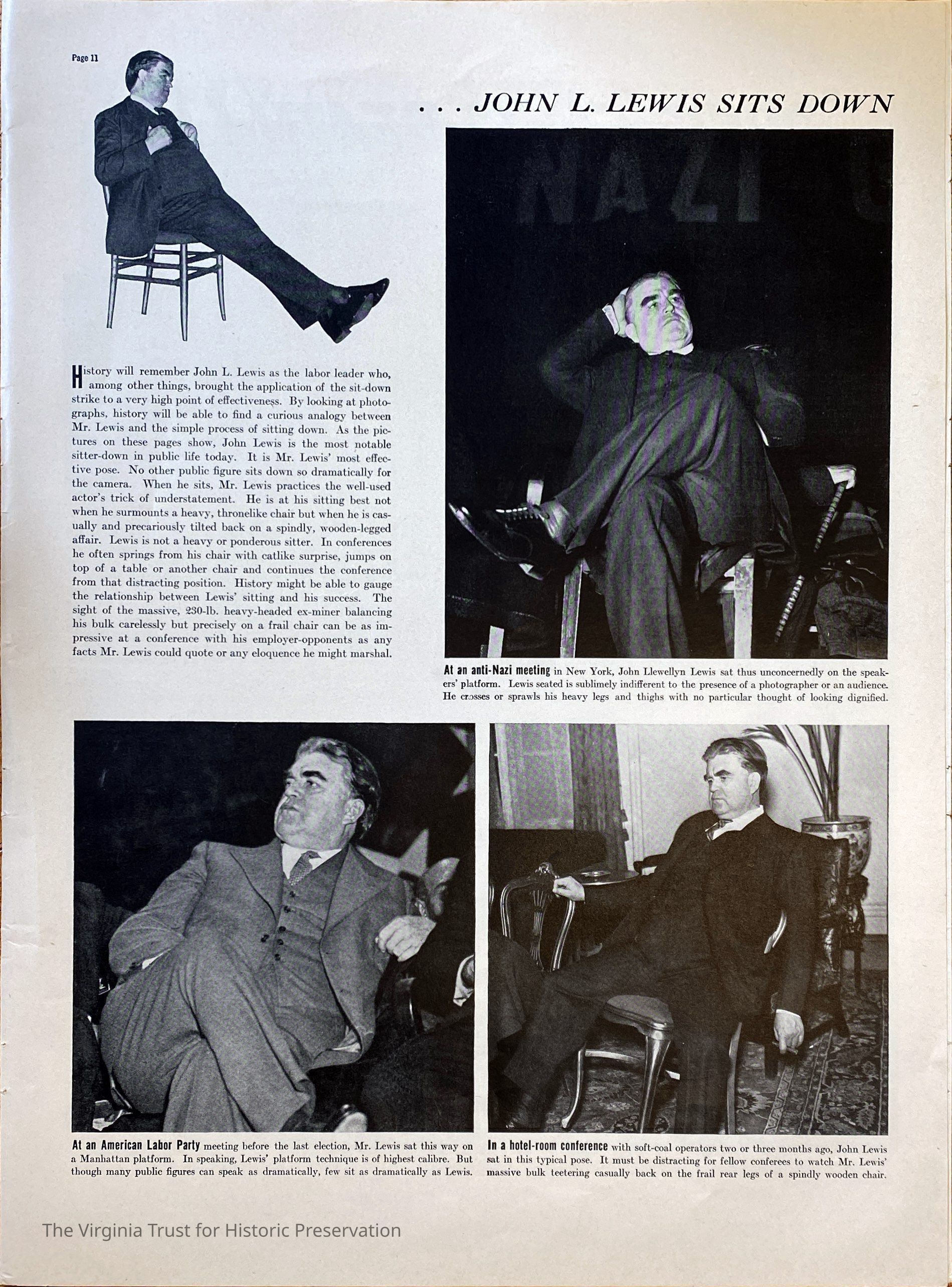 1937 issue of Fortune Magazine. Article on John L. Lewis titled "...John Lewis Sits Down". Short article with four photos regarding John L. Lewis sitting, which is his "signature pose". Relates to the sit-down strikes he calls for in the labor movement. Pages 9-14 of magazine - Lewis article found on Pages 10, 11, and 13.