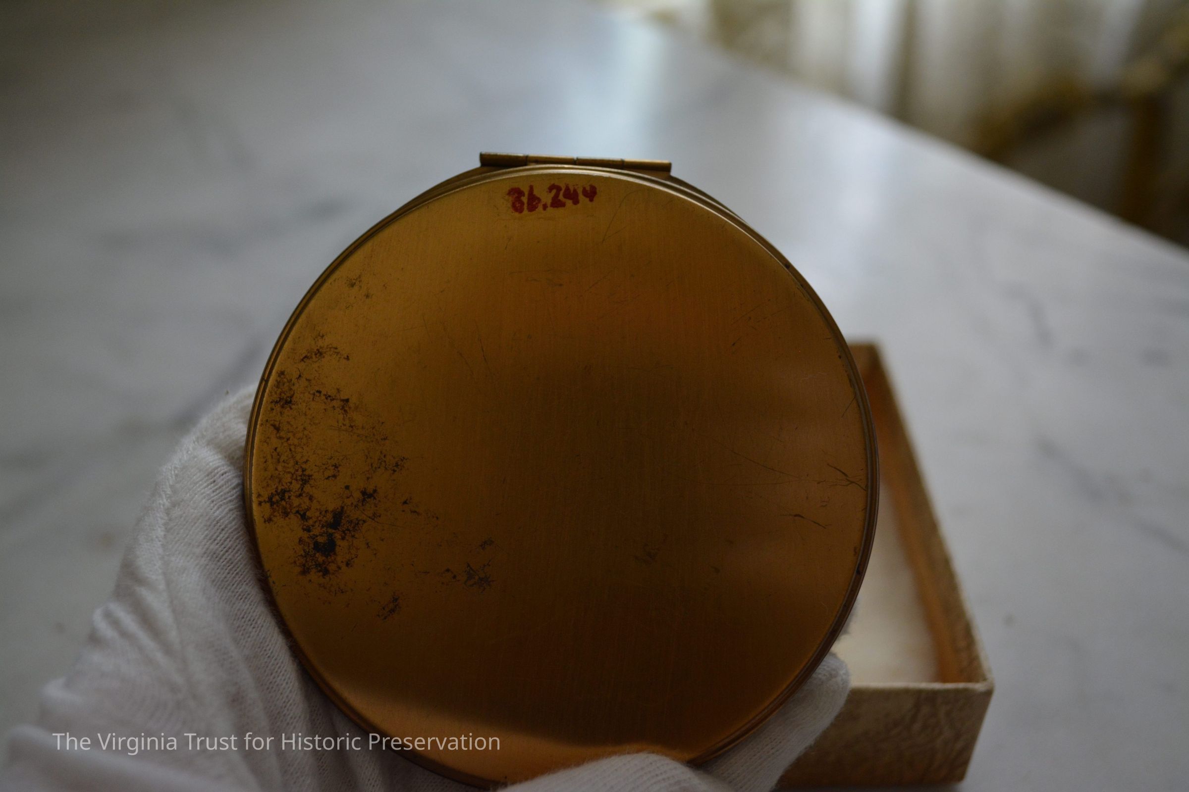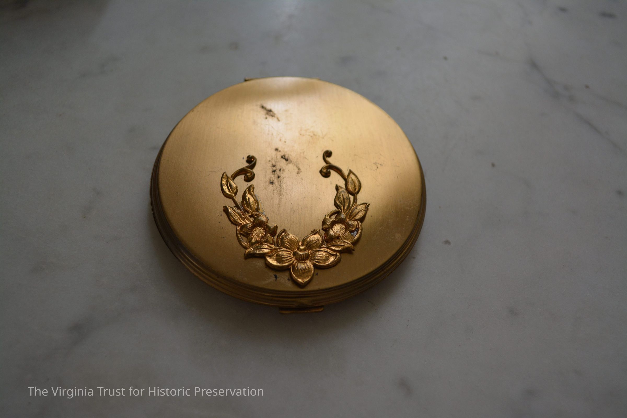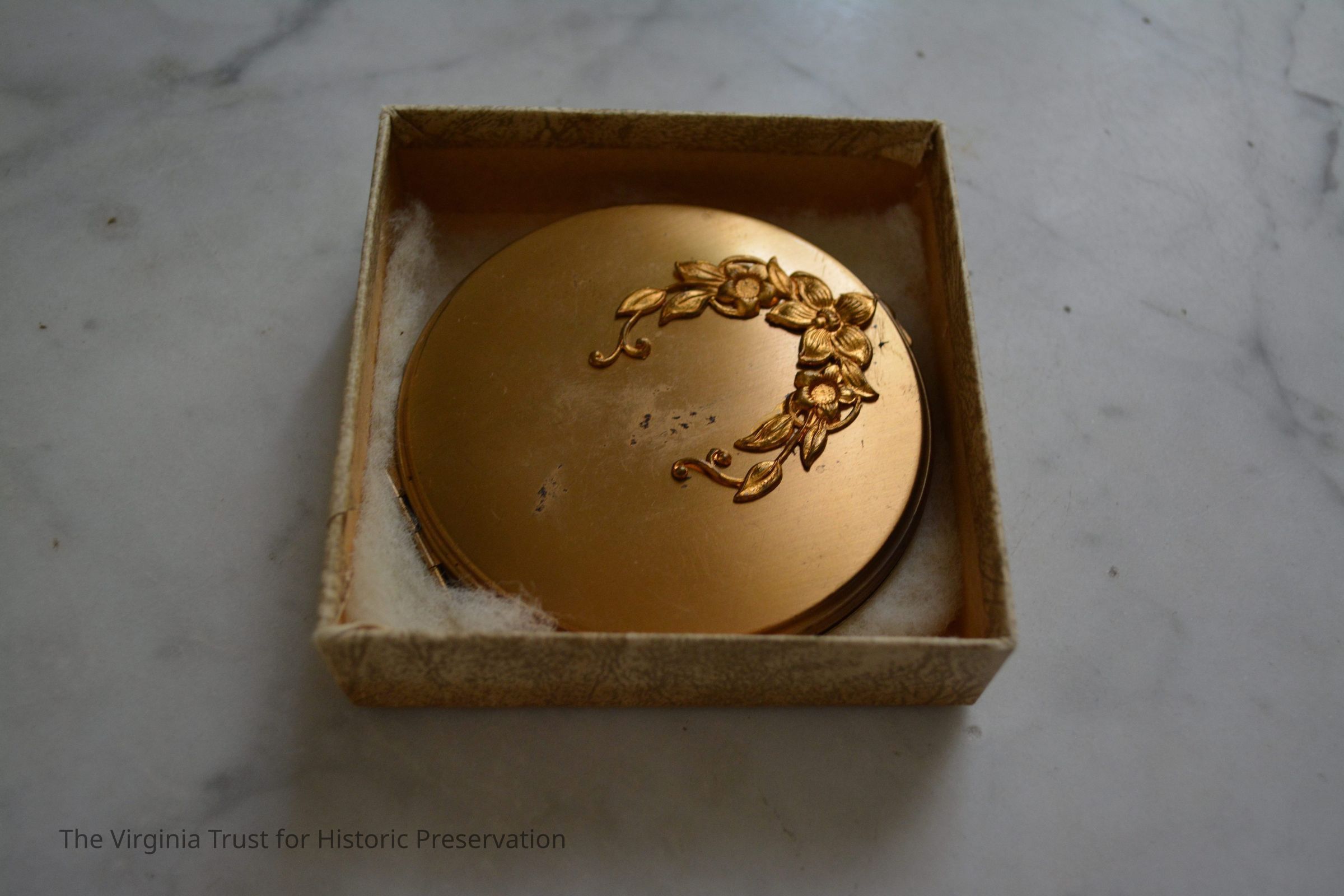 Round gold-colored compact in a square box. Top of compact is raised u-shaped floral design. Top and bottom are scratched and have a black substance adhered in spots. Inside is a round attached powder puff. Compact is marked "Made in U.S.A." Box is marked "Mary Baynes Gifts, Arlington, Washington" and has an additional inscription "McKnew gave to mother when leaving Camp Stuart when Gladys & I visited him."