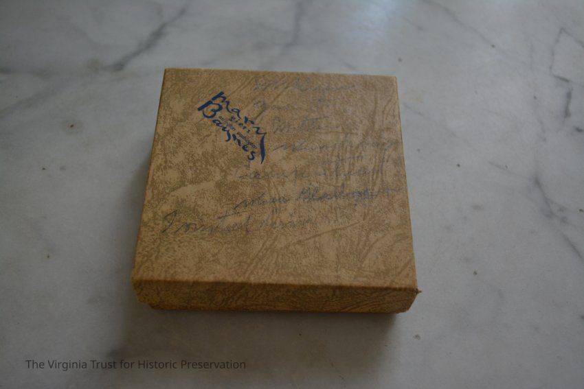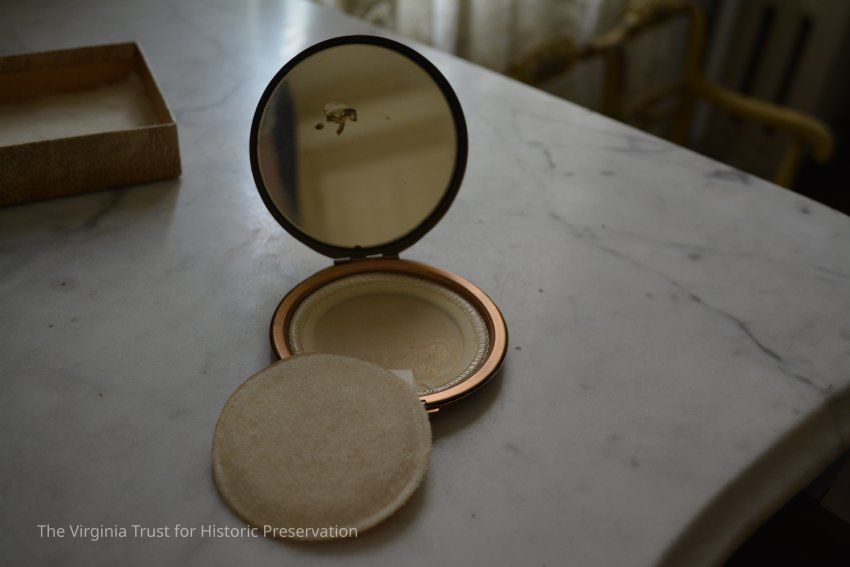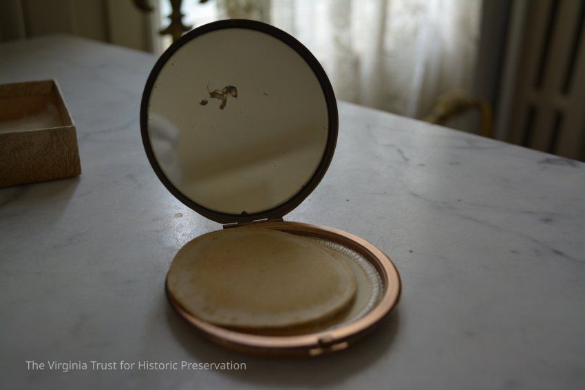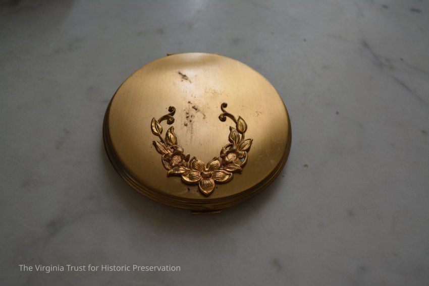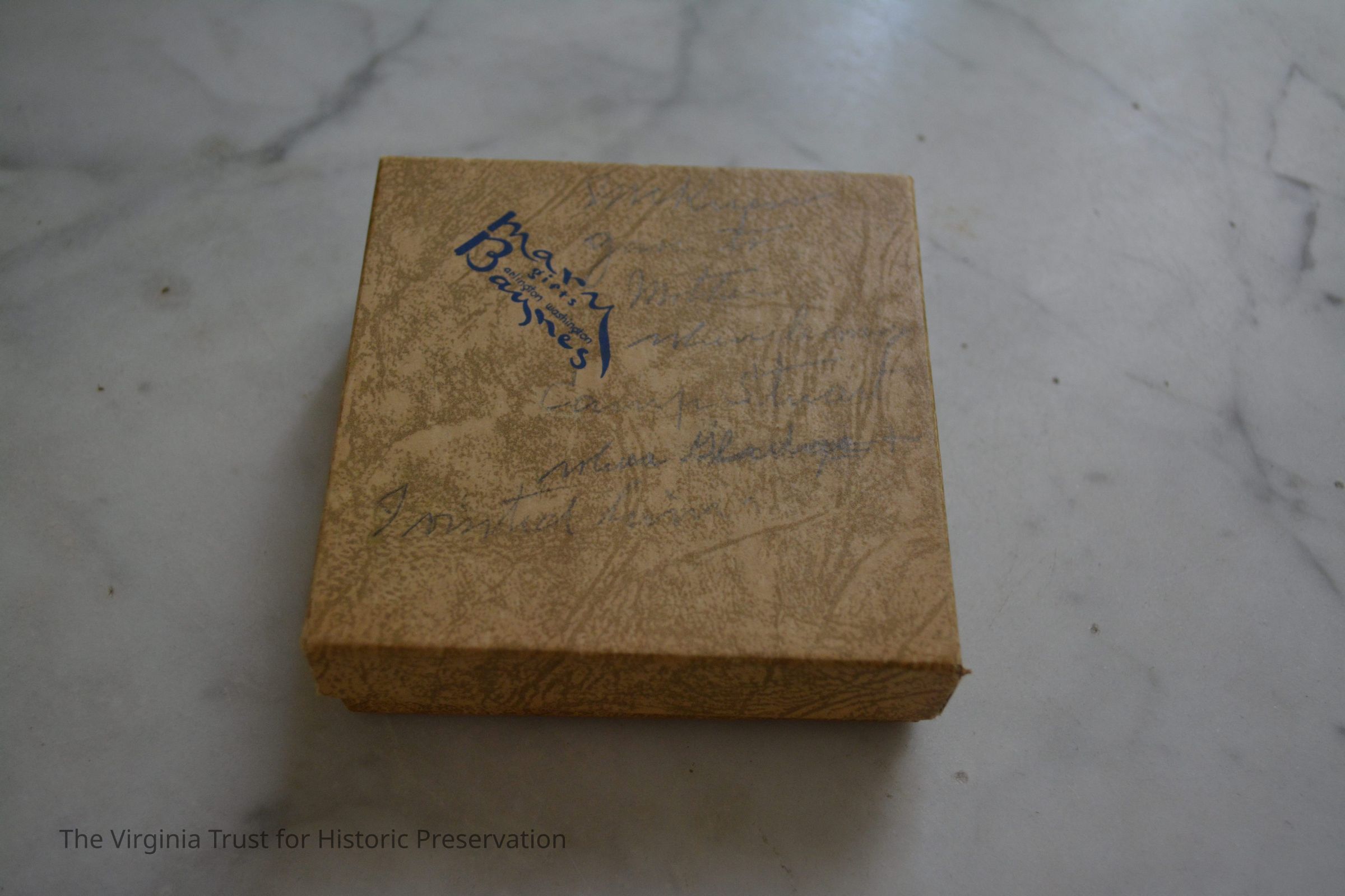 Round gold-colored compact in a square box. Top of compact is raised u-shaped floral design. Top and bottom are scratched and have a black substance adhered in spots. Inside is a round attached powder puff. Compact is marked "Made in U.S.A." Box is marked "Mary Baynes Gifts, Arlington, Washington" and has an additional inscription "McKnew gave to mother when leaving Camp Stuart when Gladys & I visited him."