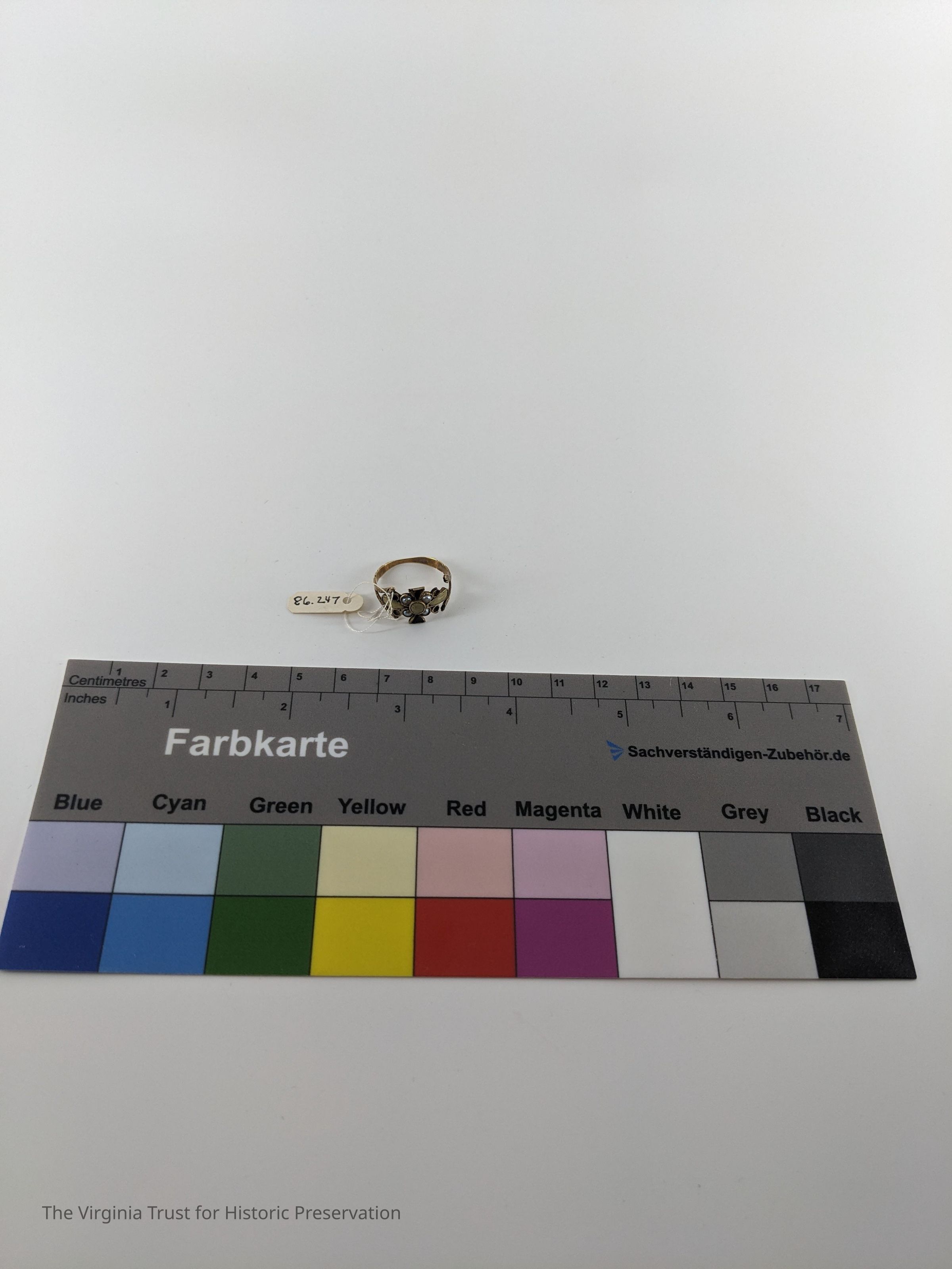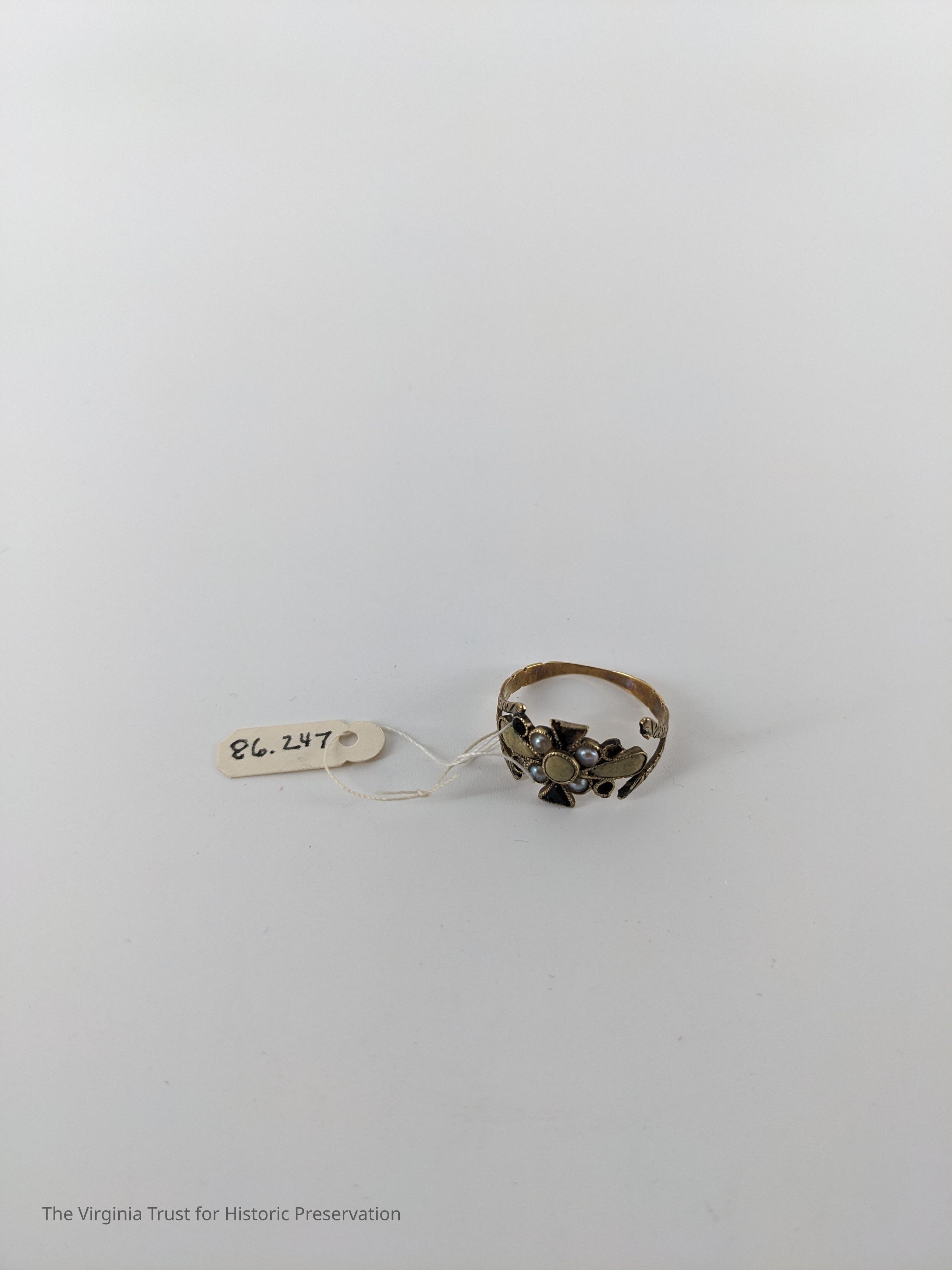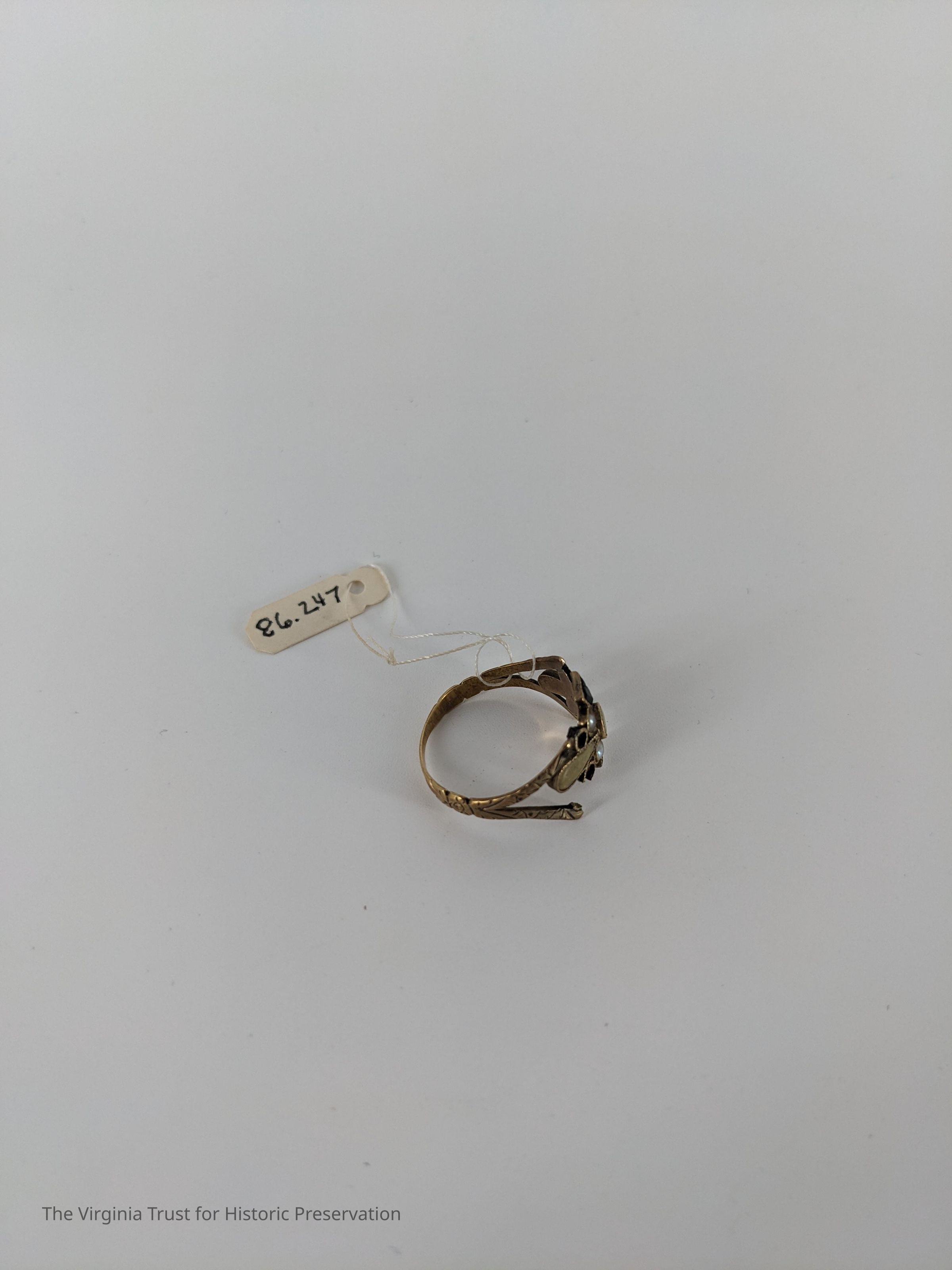 Ring engraved "J.C.M." Some stones missing. Band has separated from the main design on one side.