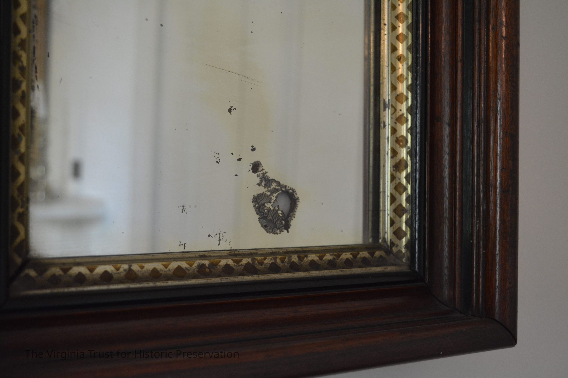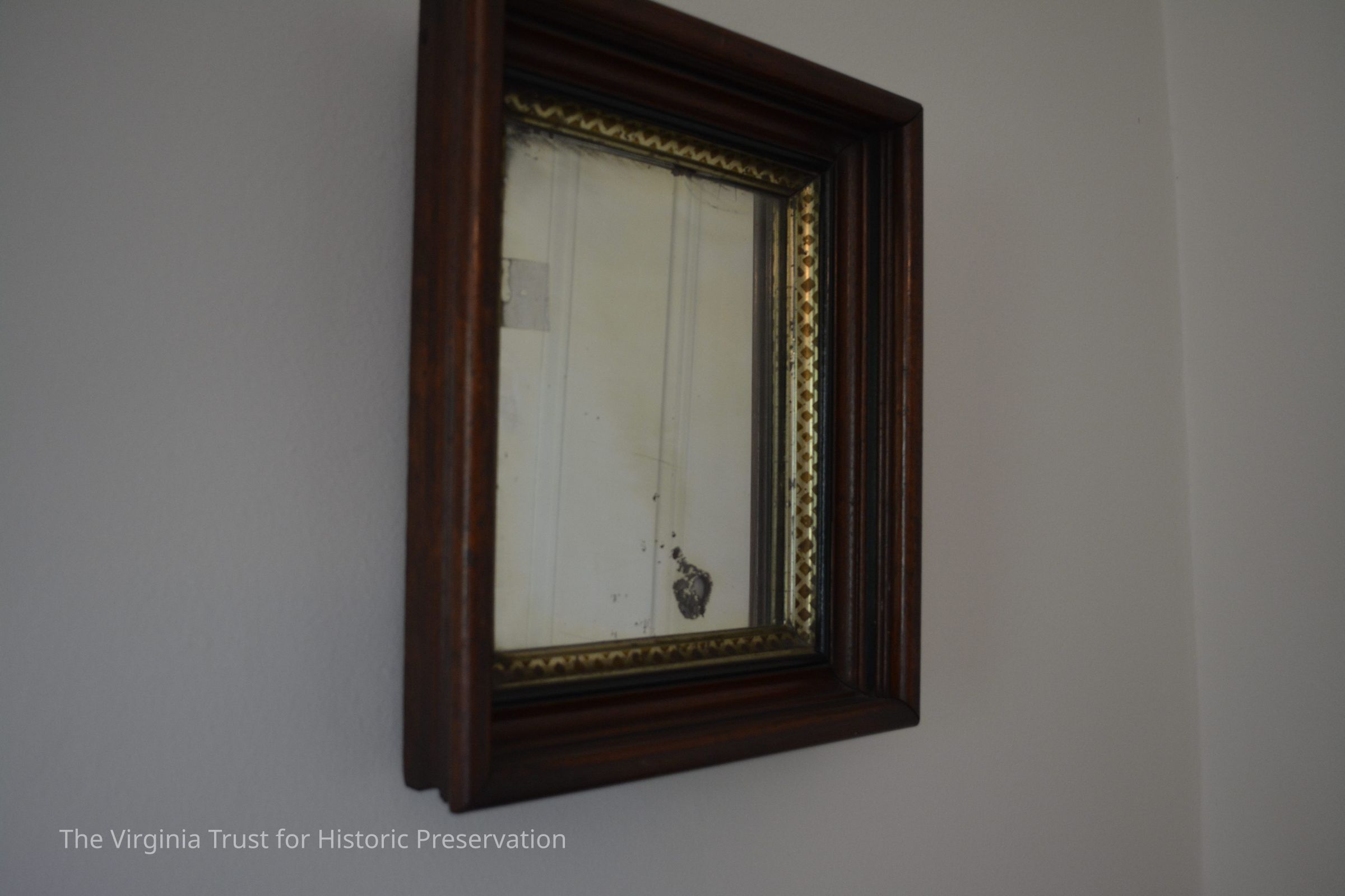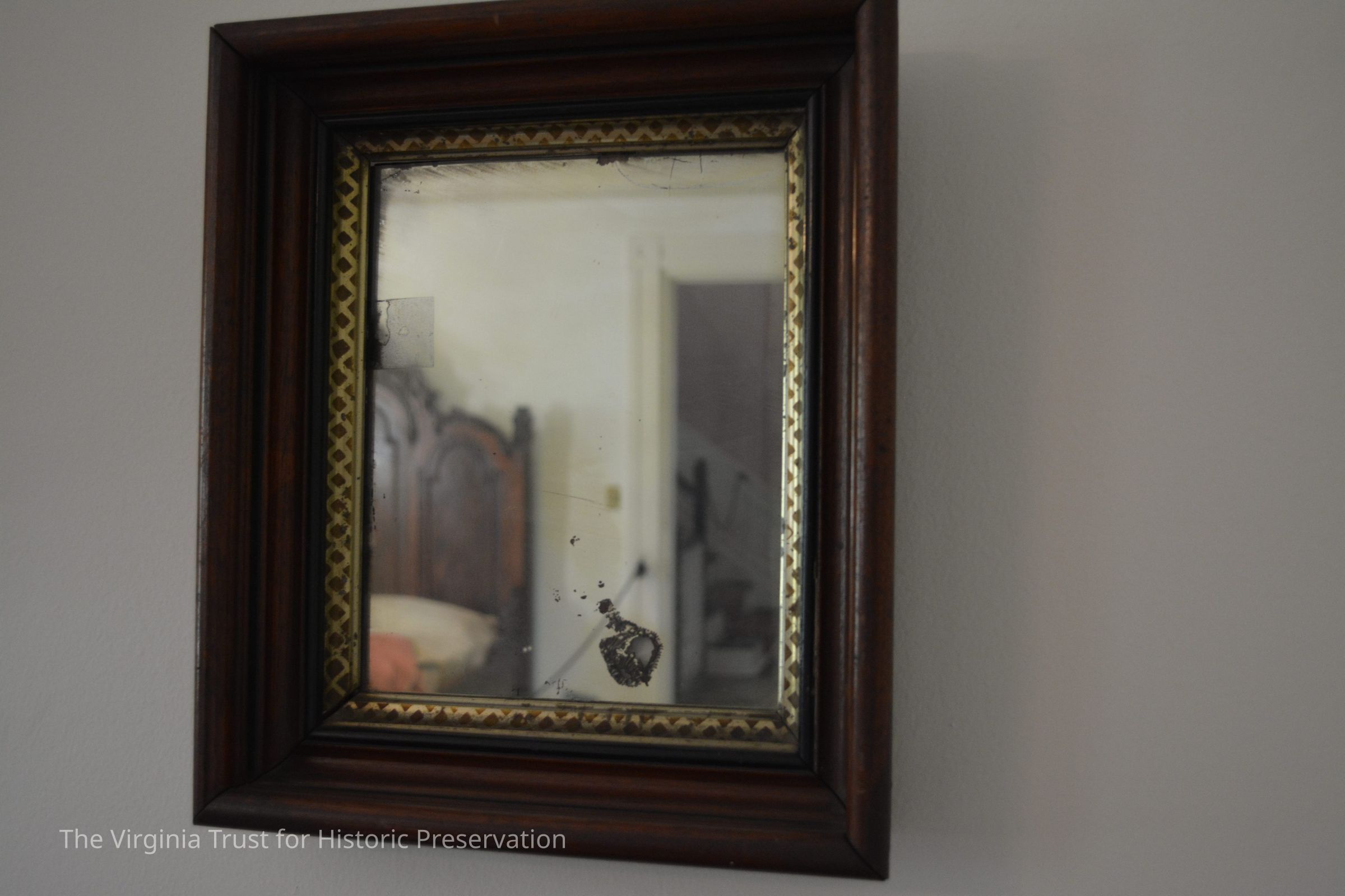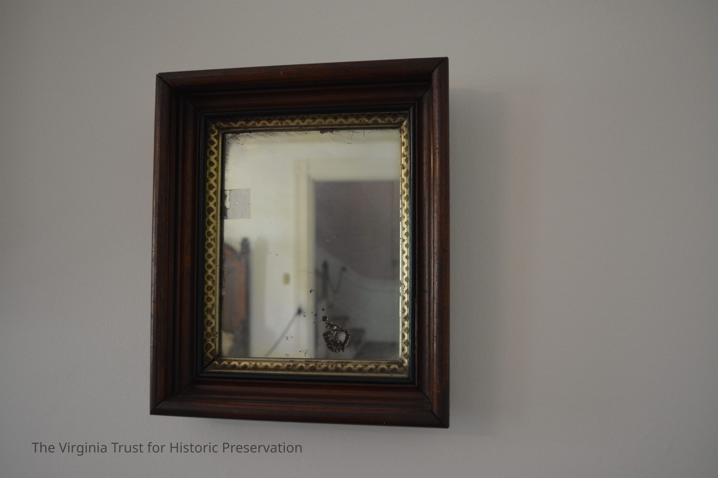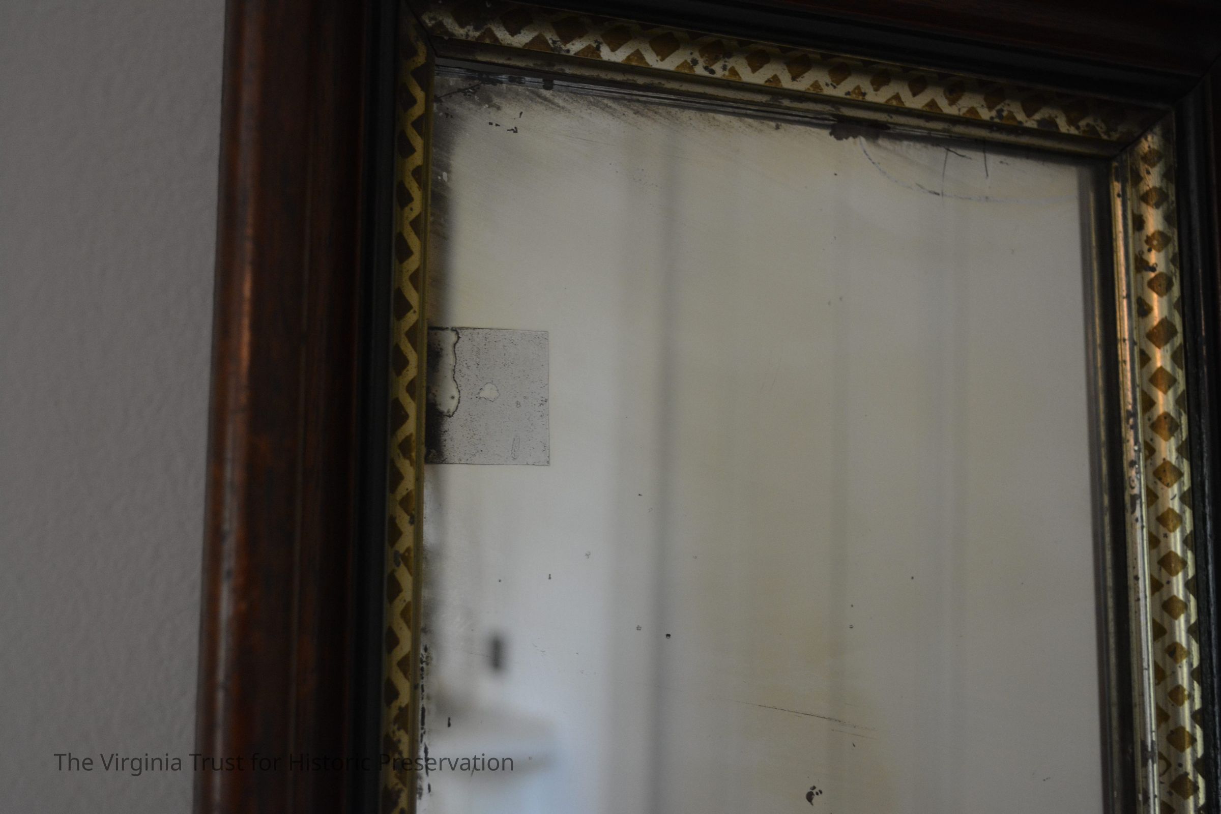 Square mirror framed in walnut with gold leaf criss-cross inset.
