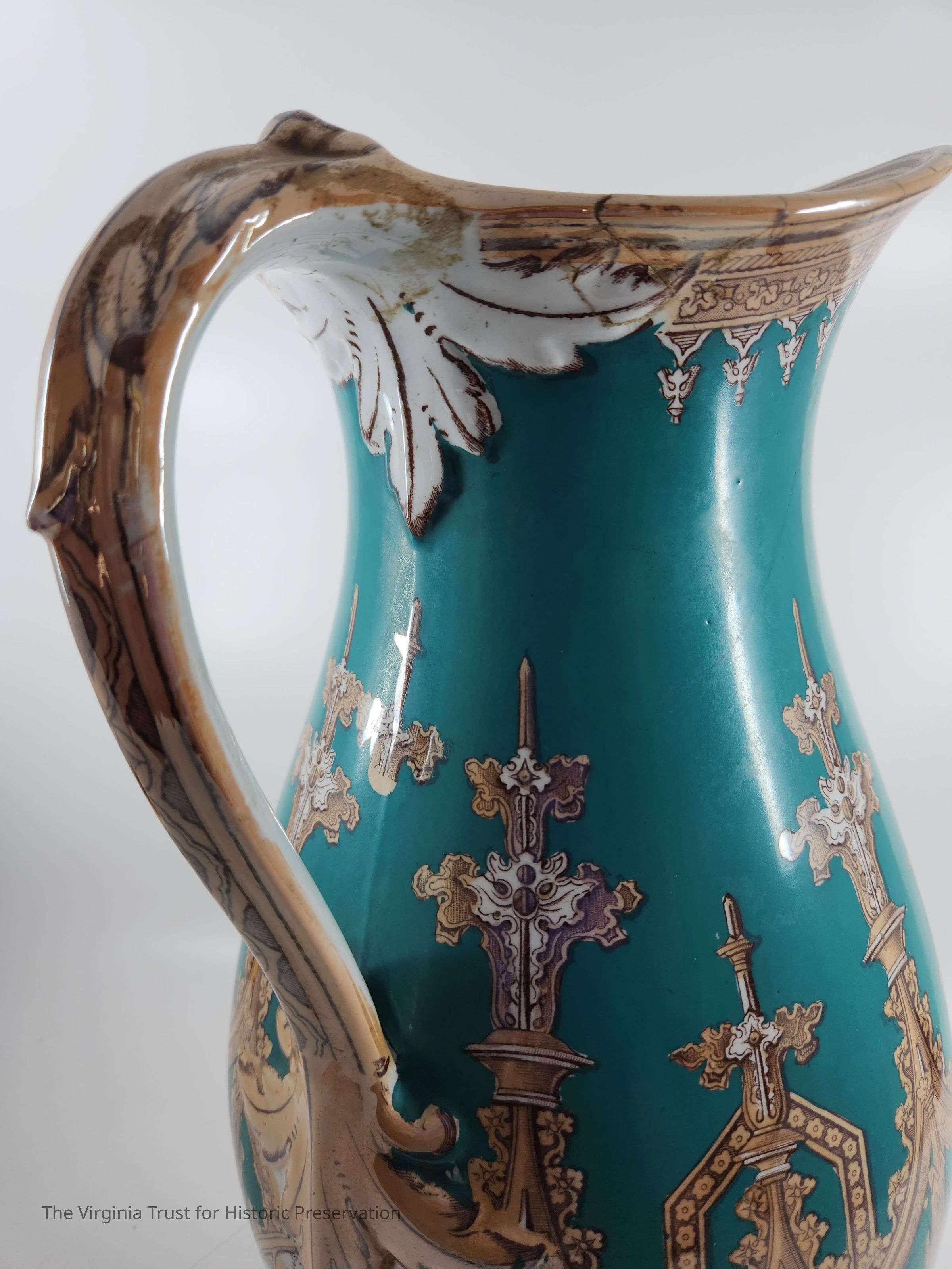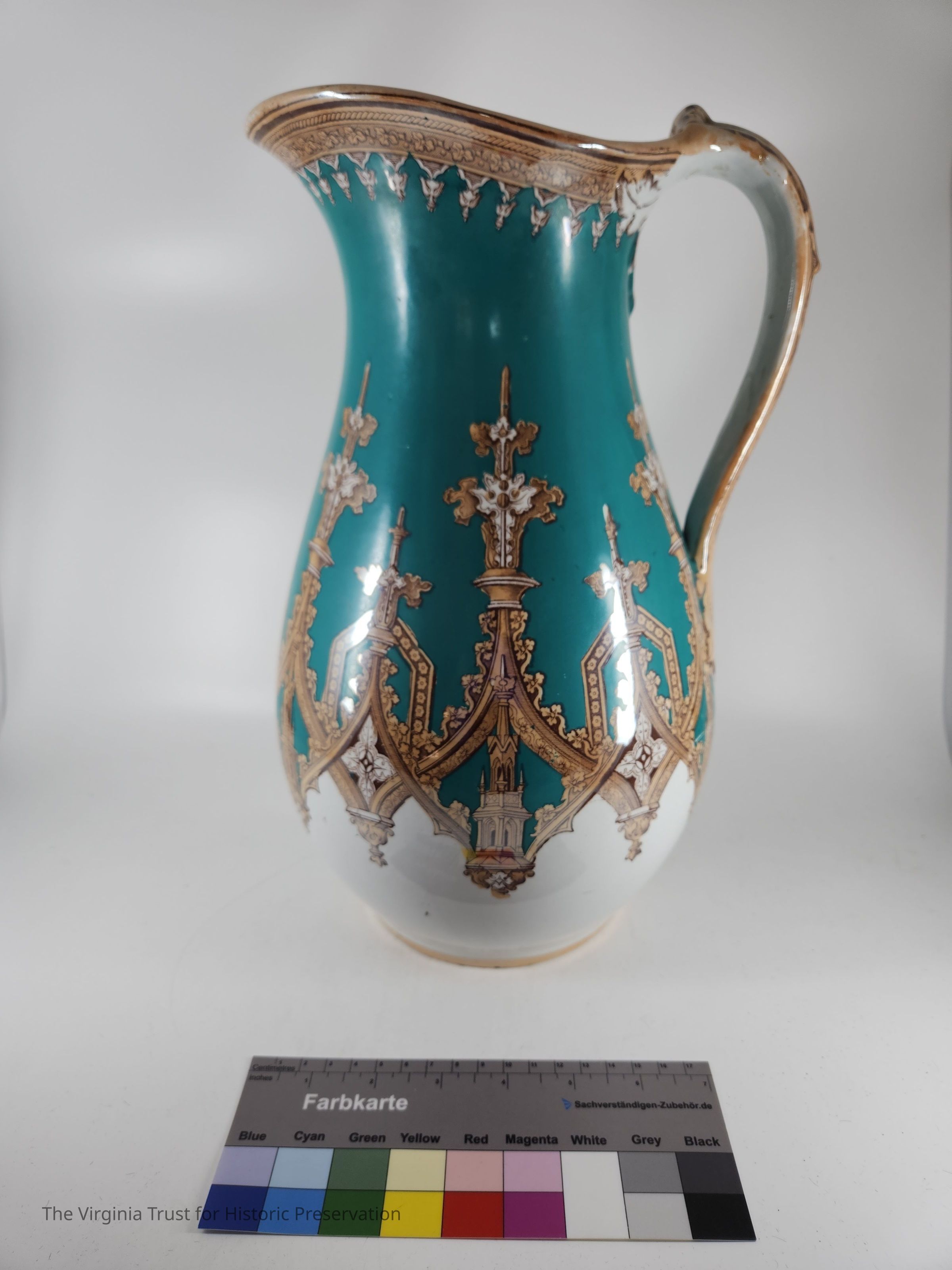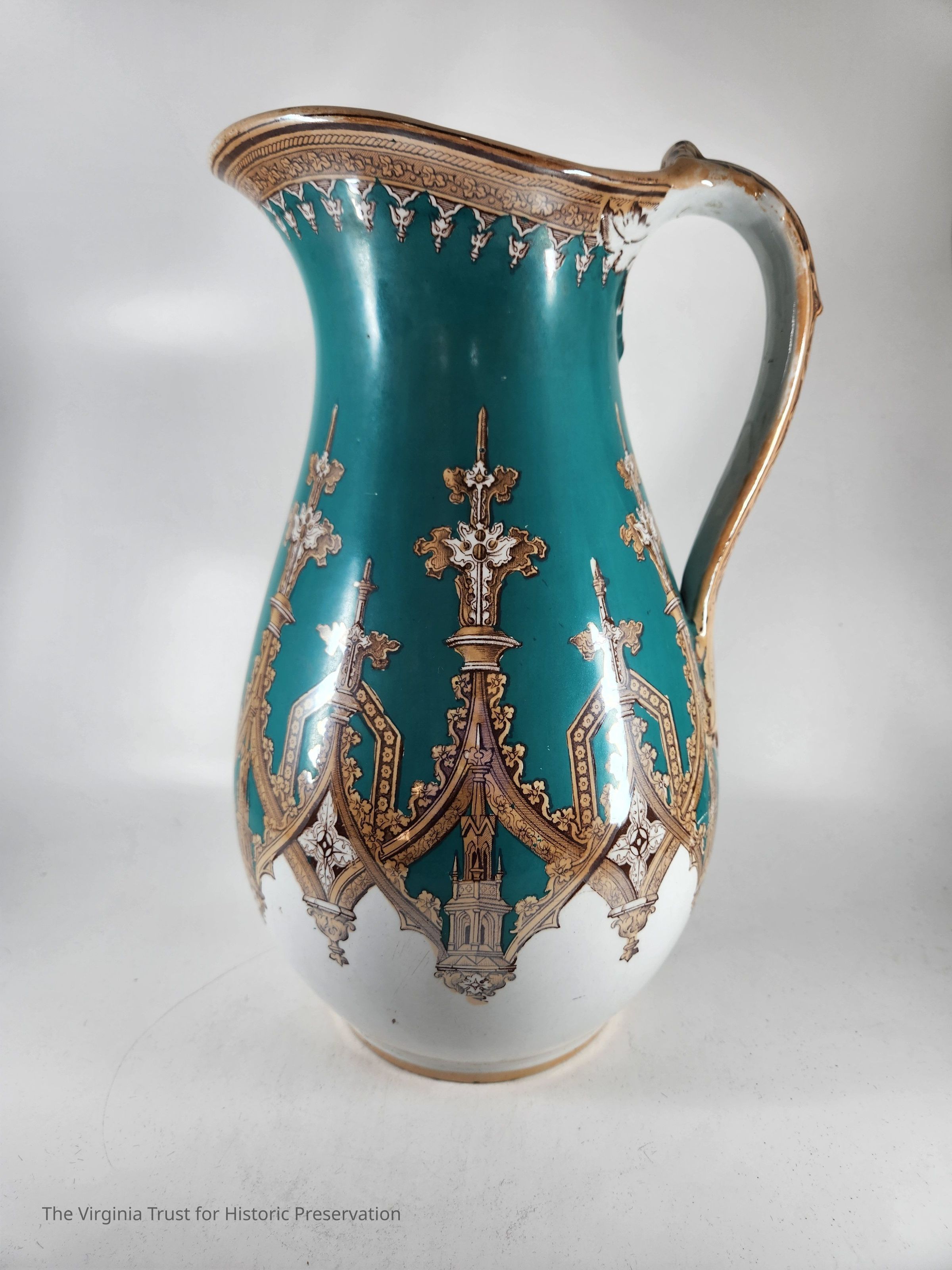 Turquoise, gold, and white pitcher with gothic design