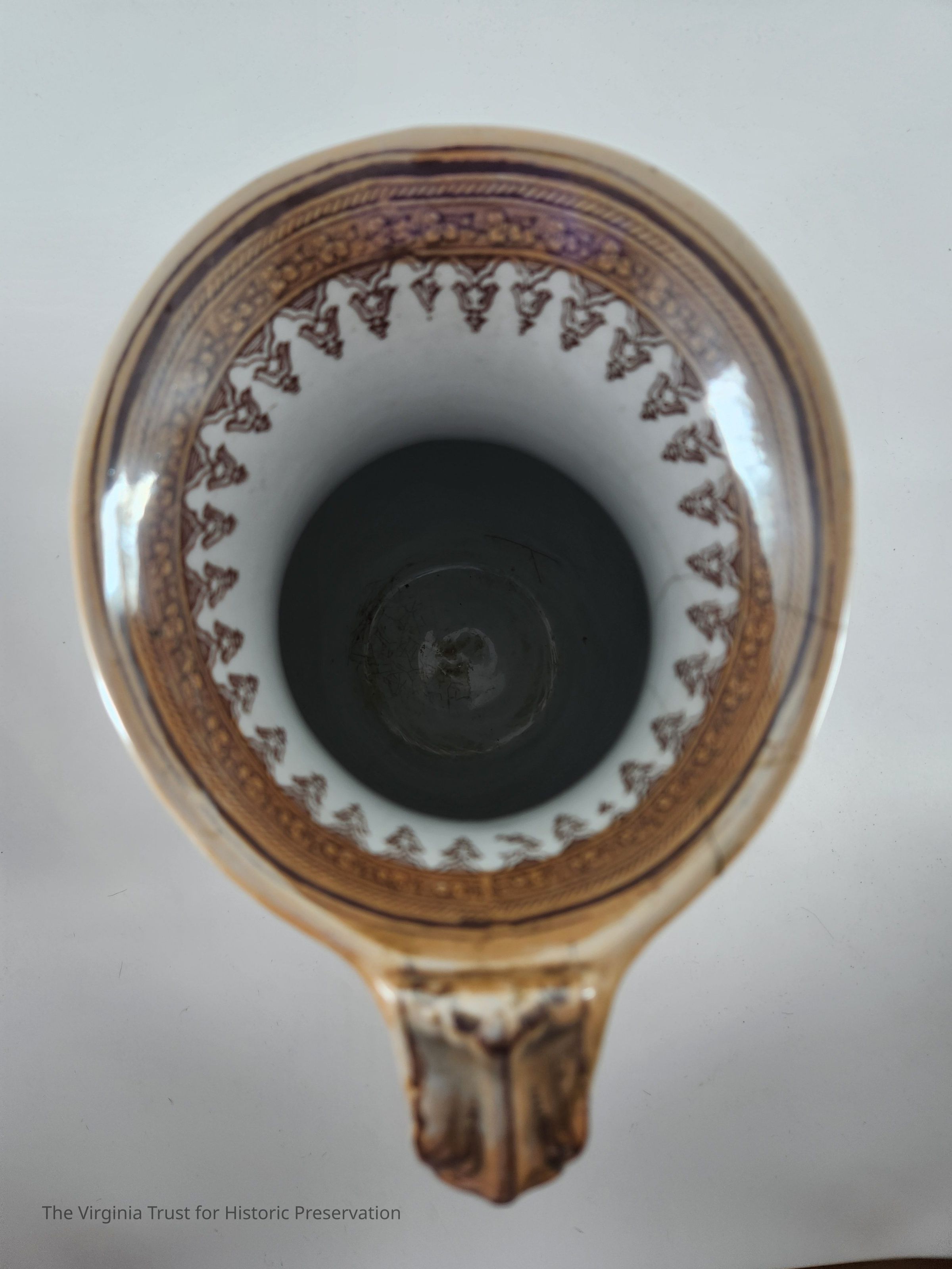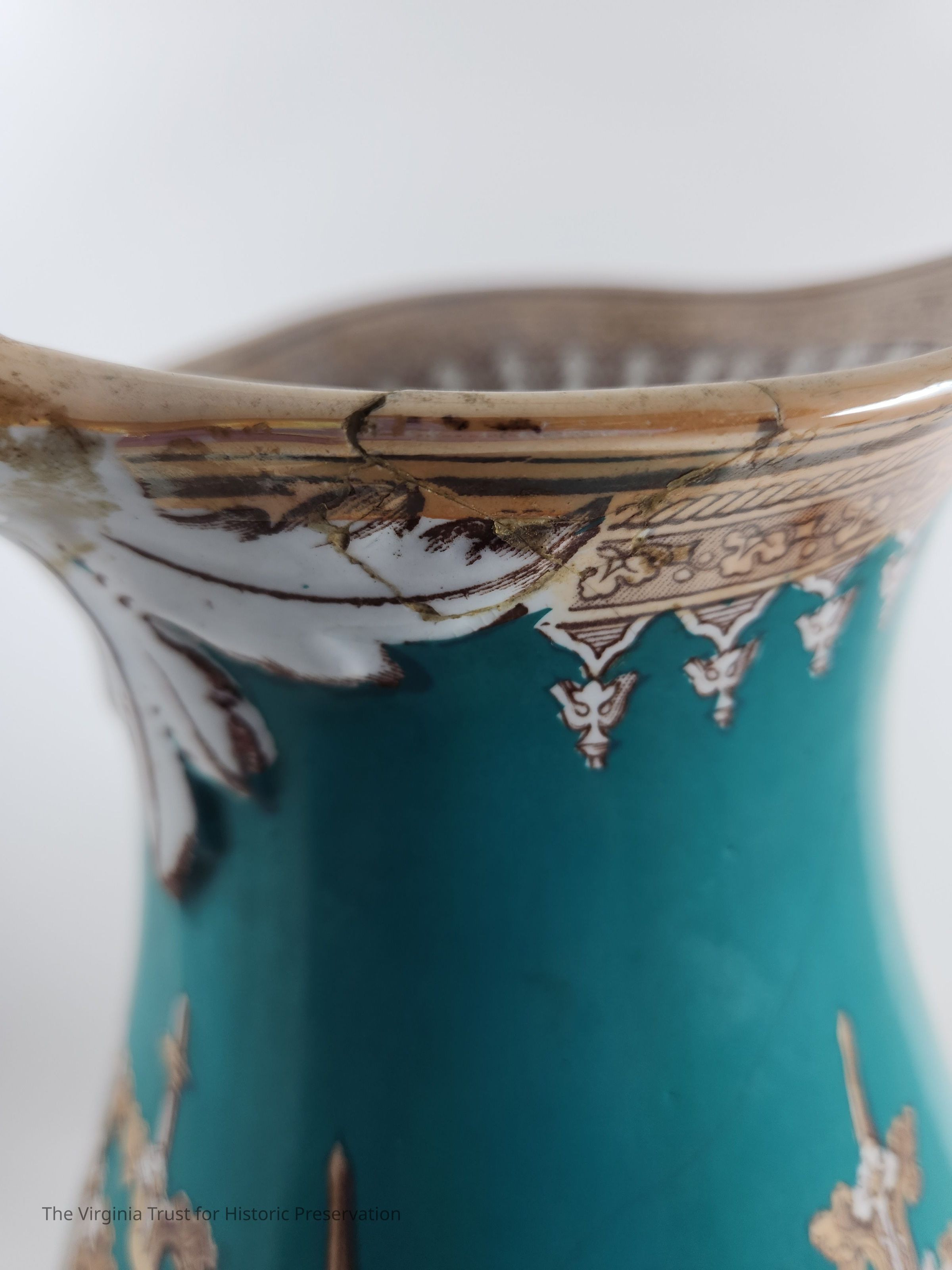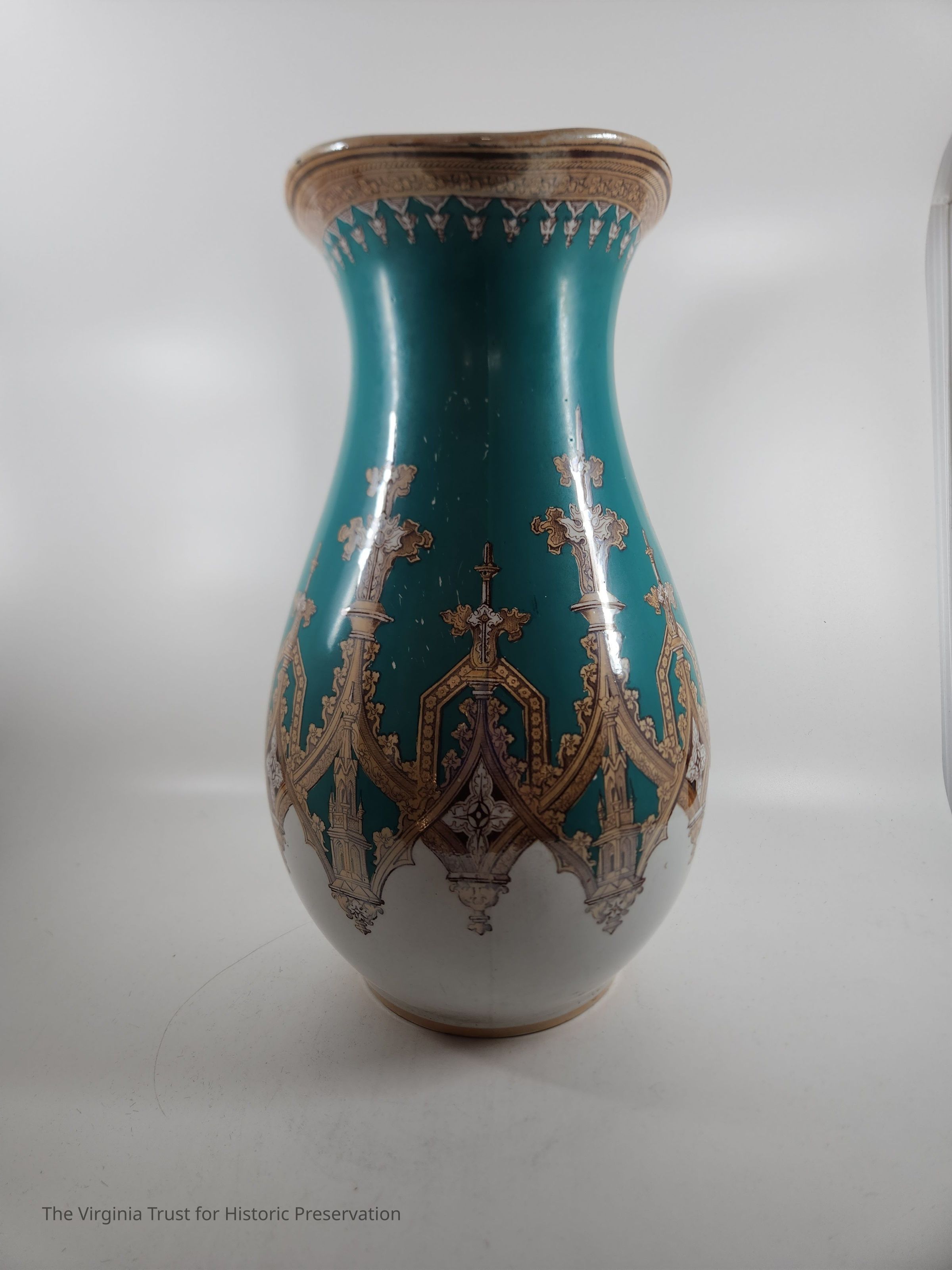 Turquoise, gold, and white pitcher with gothic design