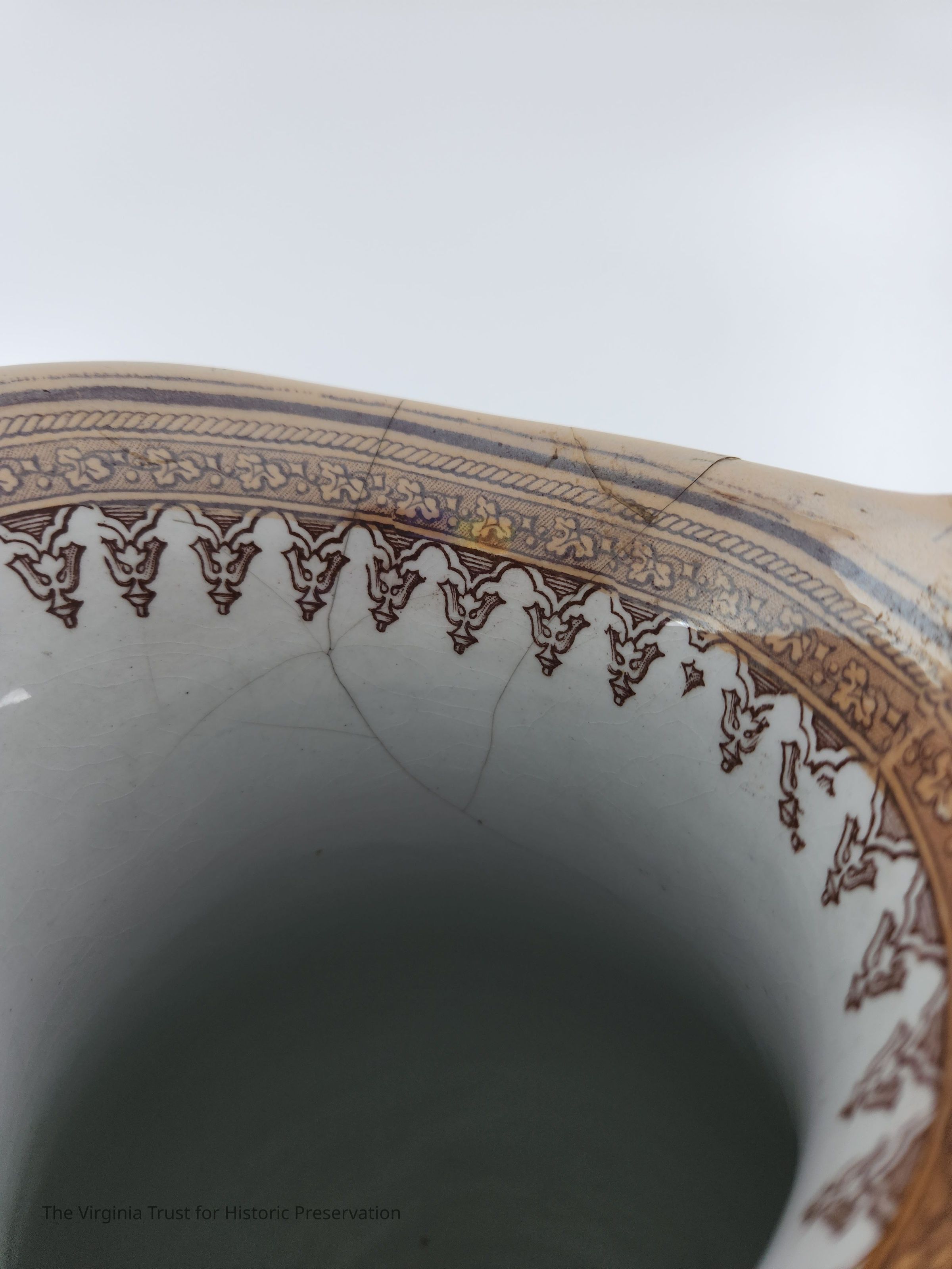 Pitcher, part of three piece Prattware washbowl set. Gothic design. White and blue-green with gold rim.