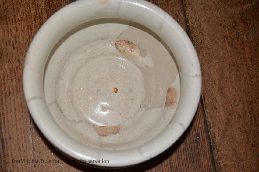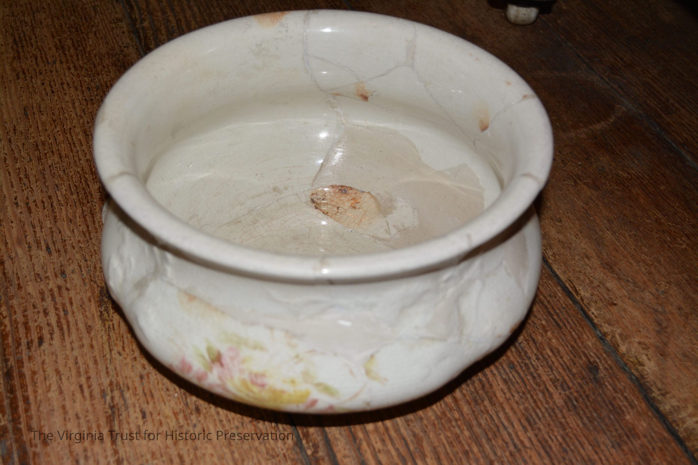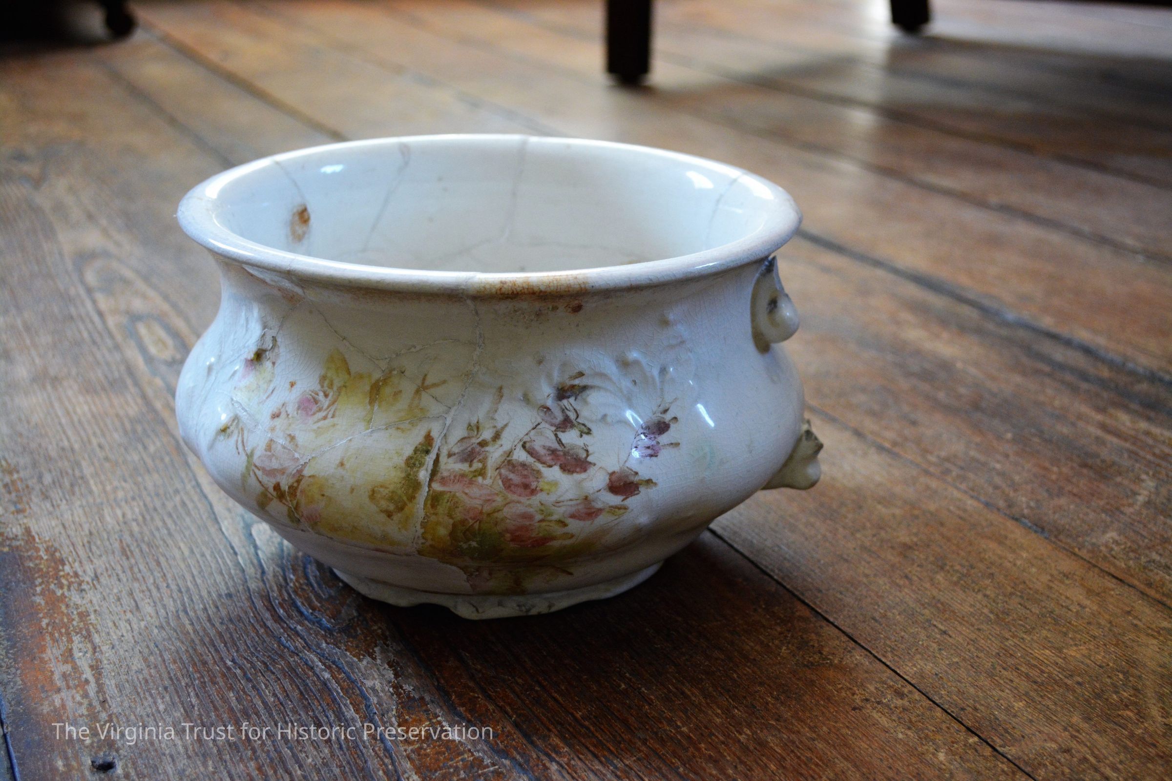 White chamber pot with floral pastel design, has been in pieces and has been cemented together. Marked "Columbian China." Excavated from privy ca. 1975. Chamber pots have been around since ancient civilizations before indoor plumbing. Most common materials were tin, ceramic, earthenware, etc. The flush toilet became more widespread in 1851, but chamber pots were still prevelant for years after.Dimensions