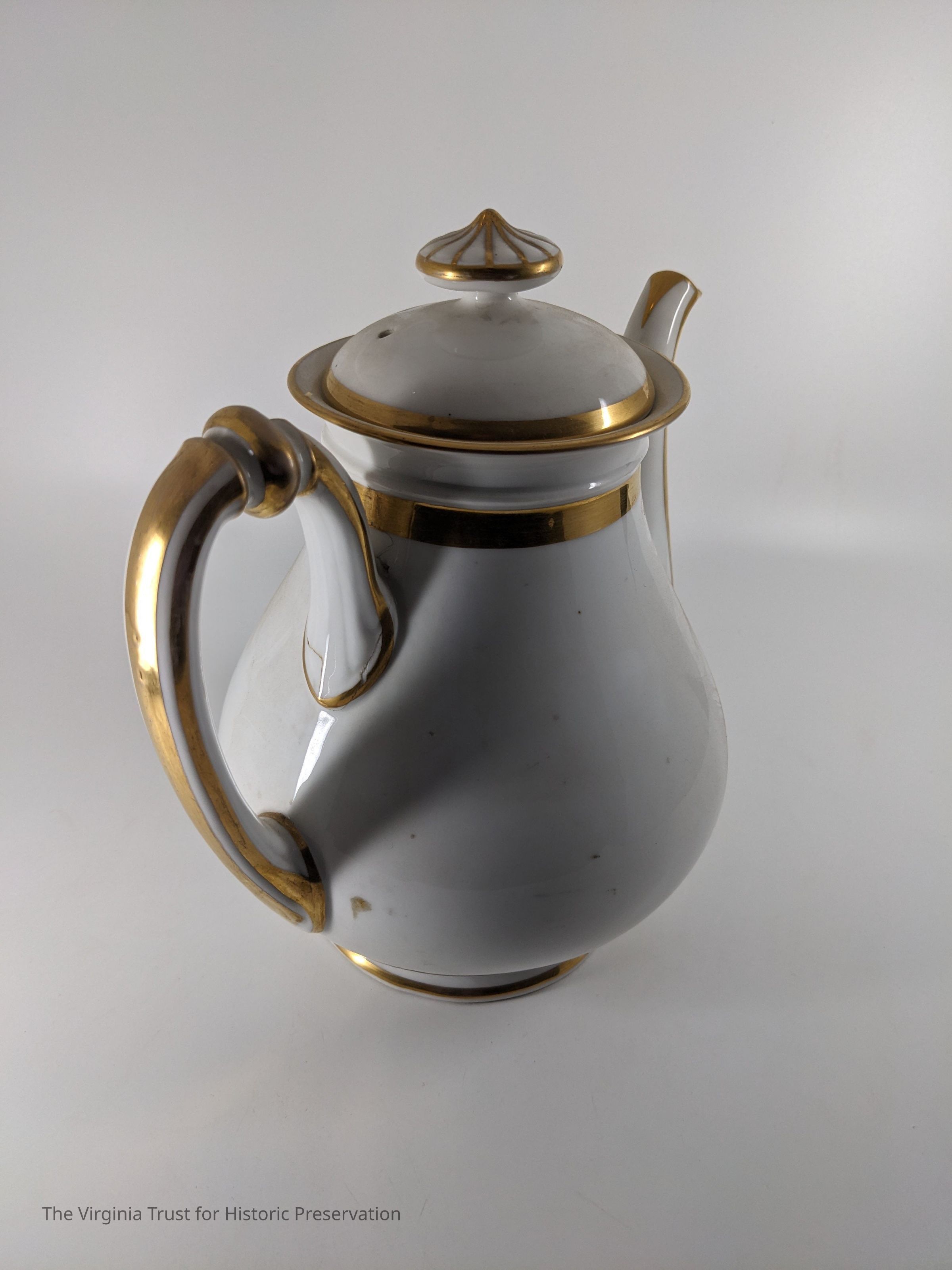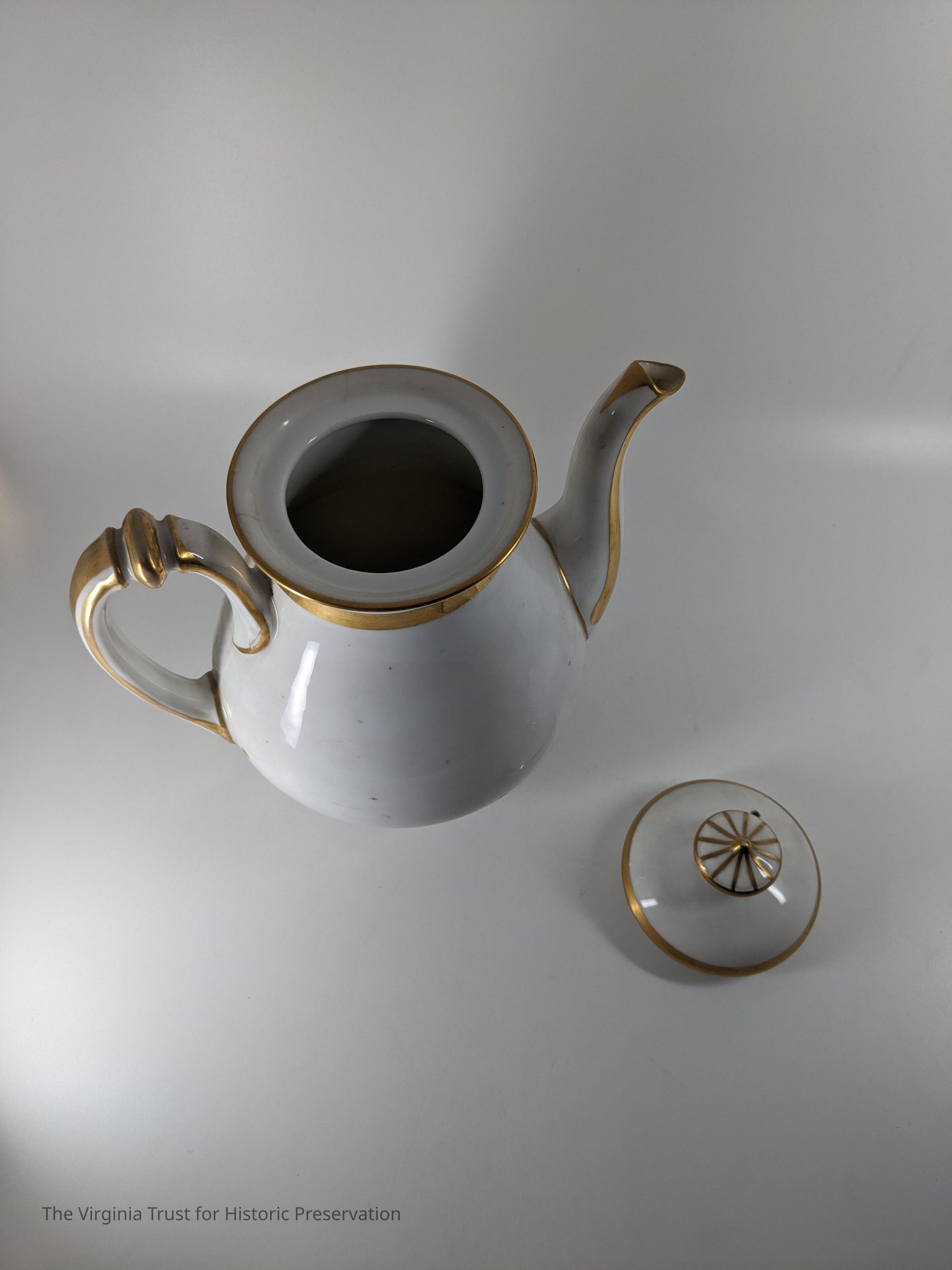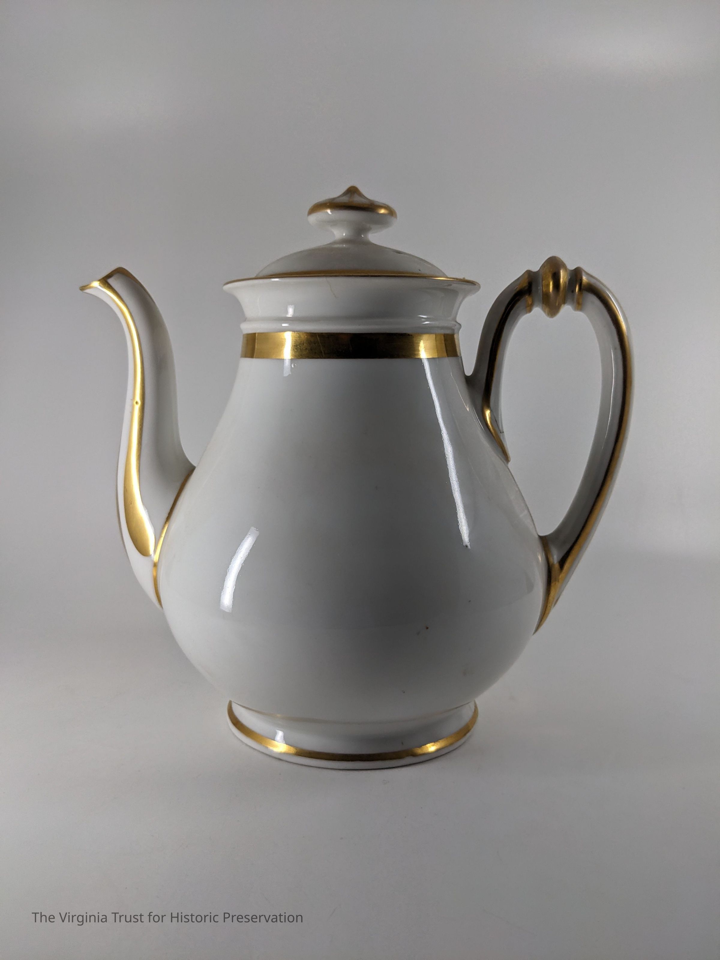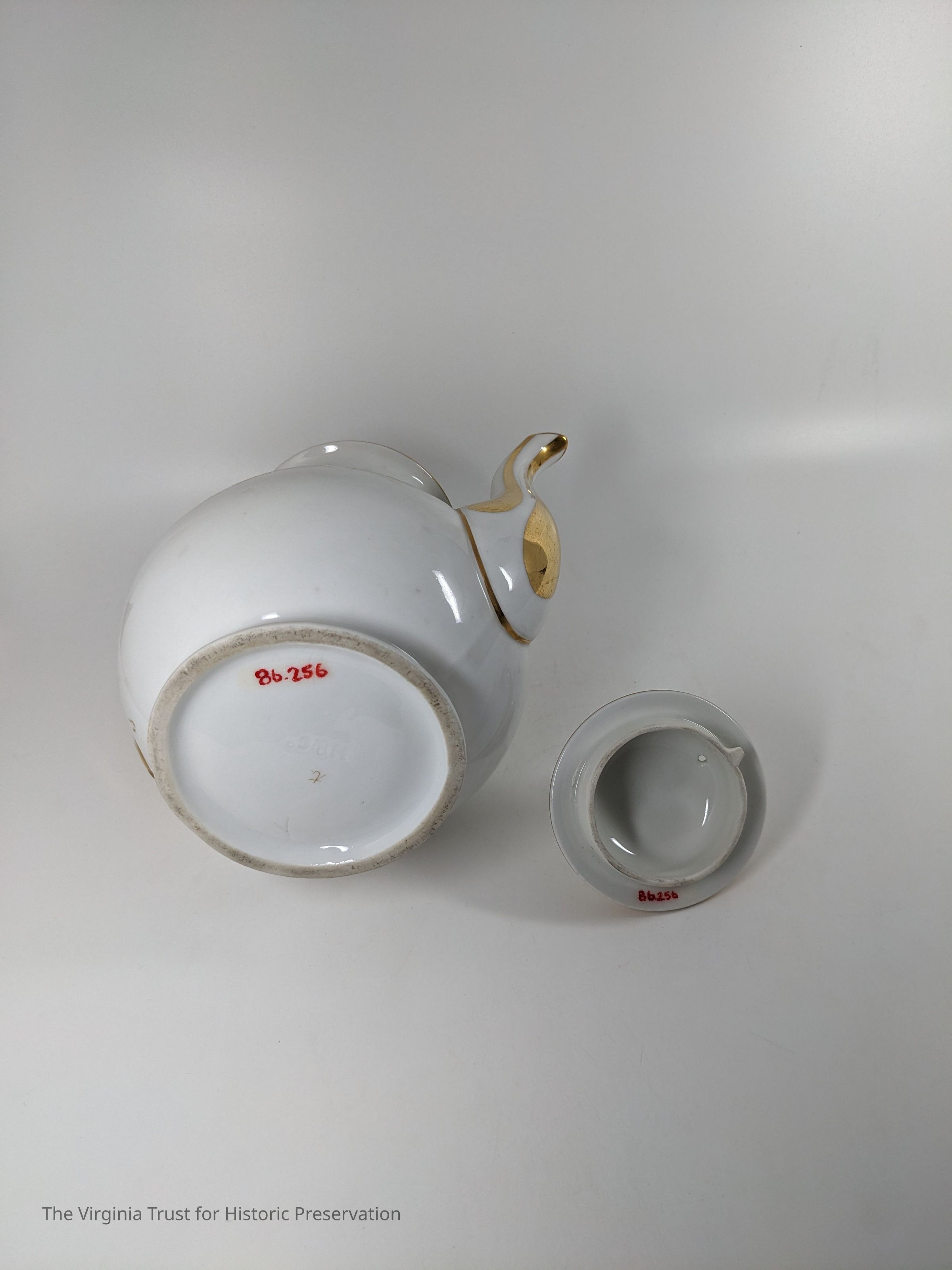 White teapot with gold trim, matching lid. Stamped on bottom: H8:Co.