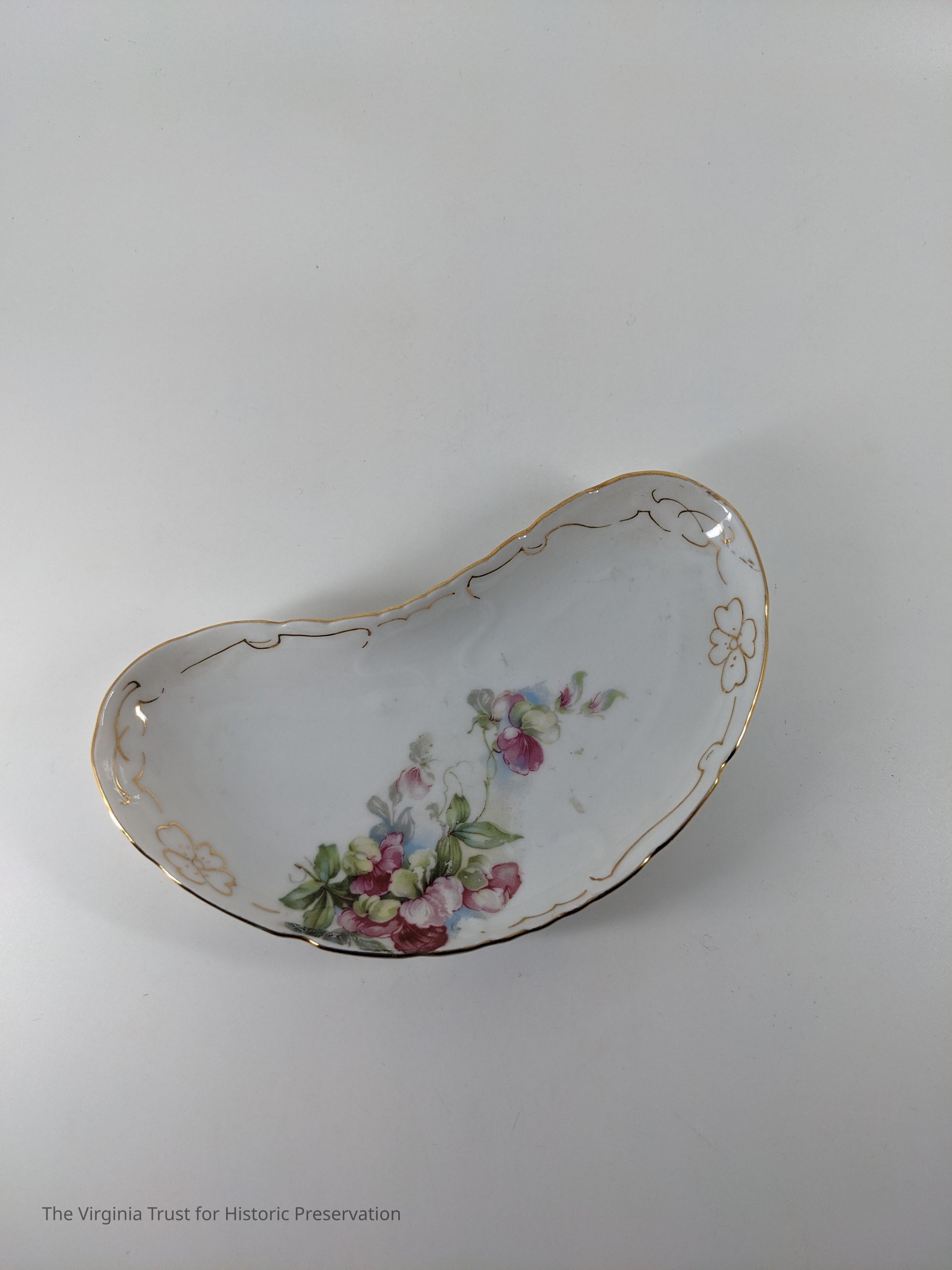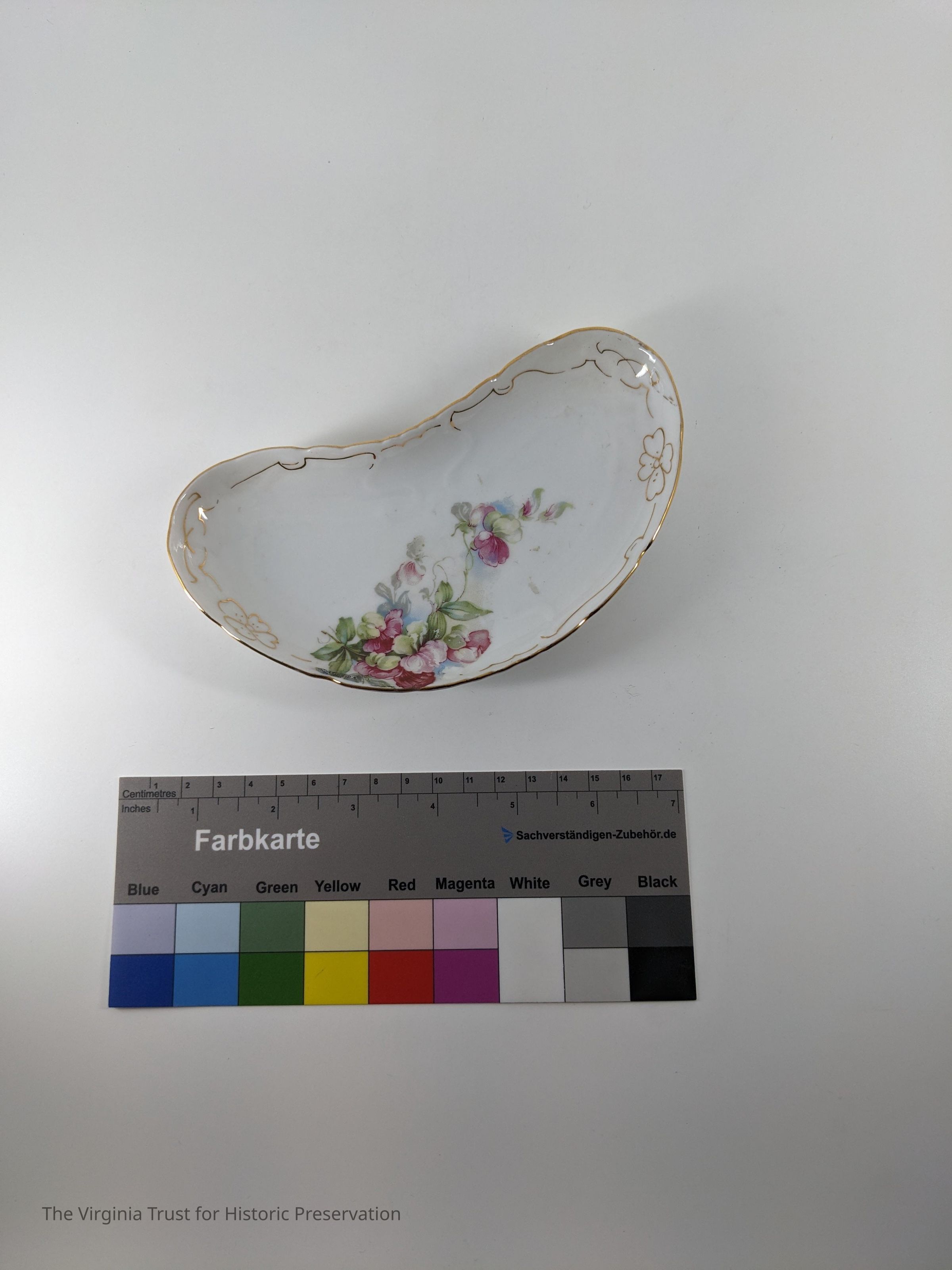 Part of a 32 piece set (2 large plates, 6 small plates, 6 cup plates, 6 deep saucers, 6 cups, 6 bone plates). Rose and blue floral design. Fine gold line rim.