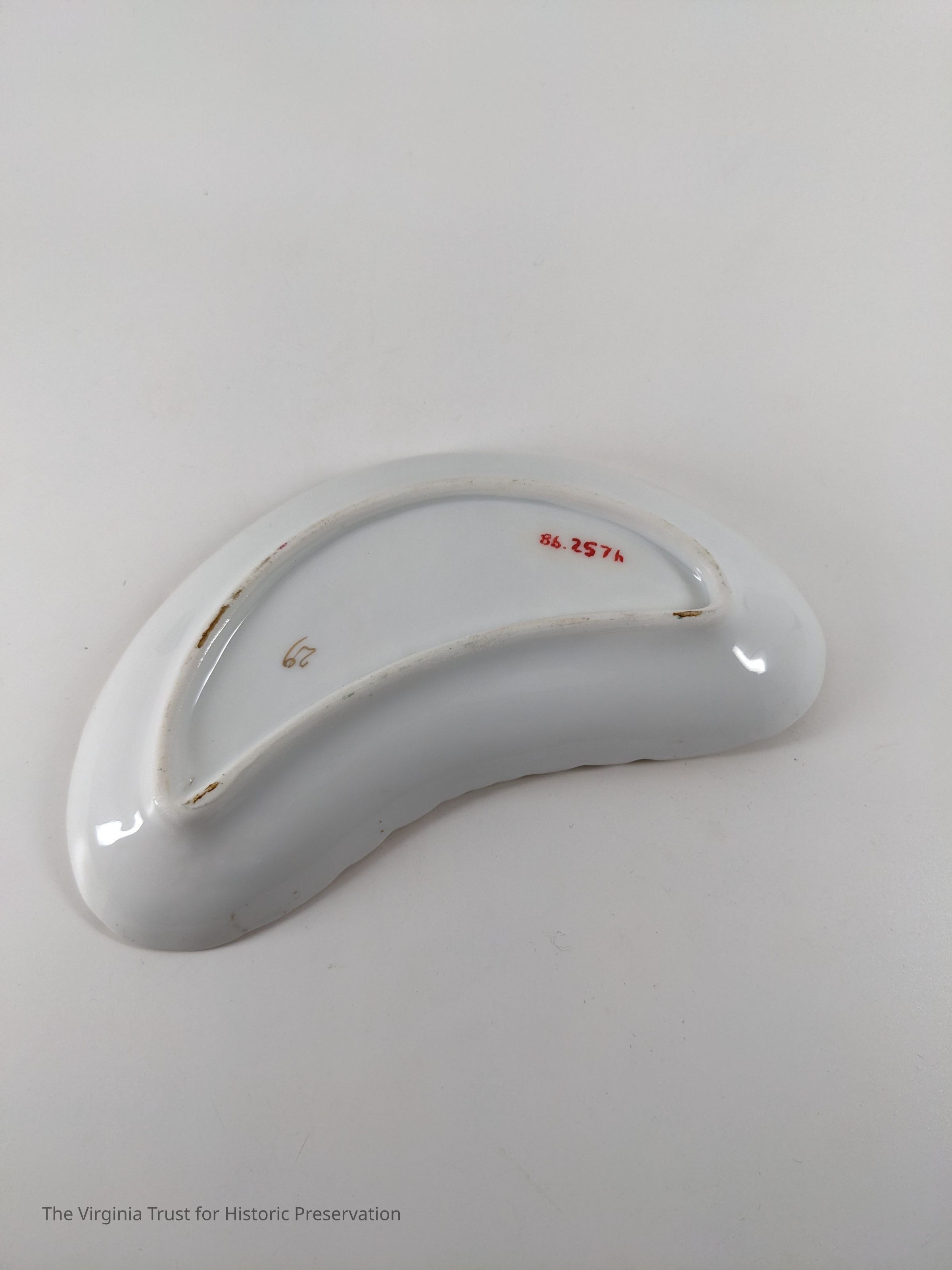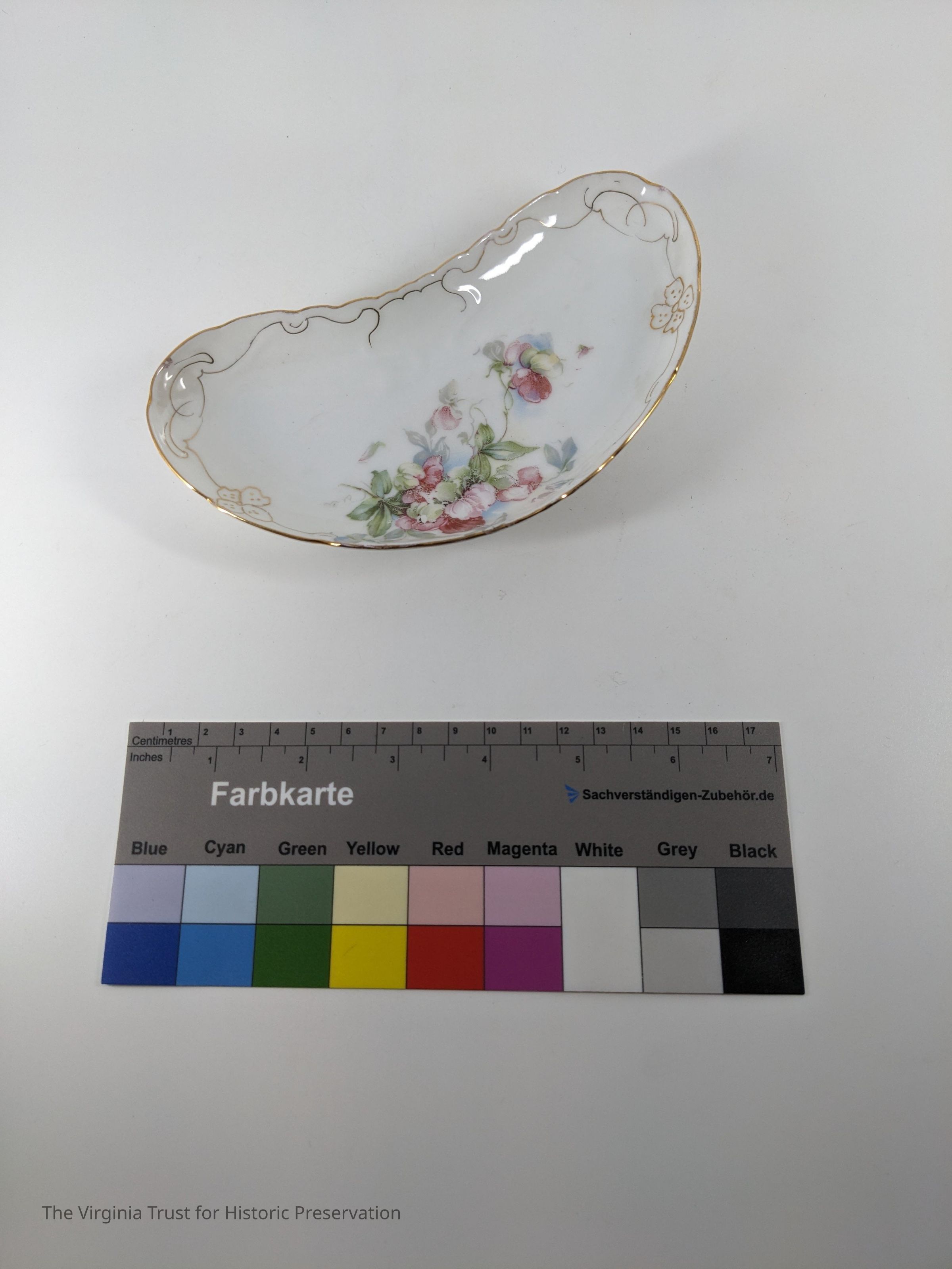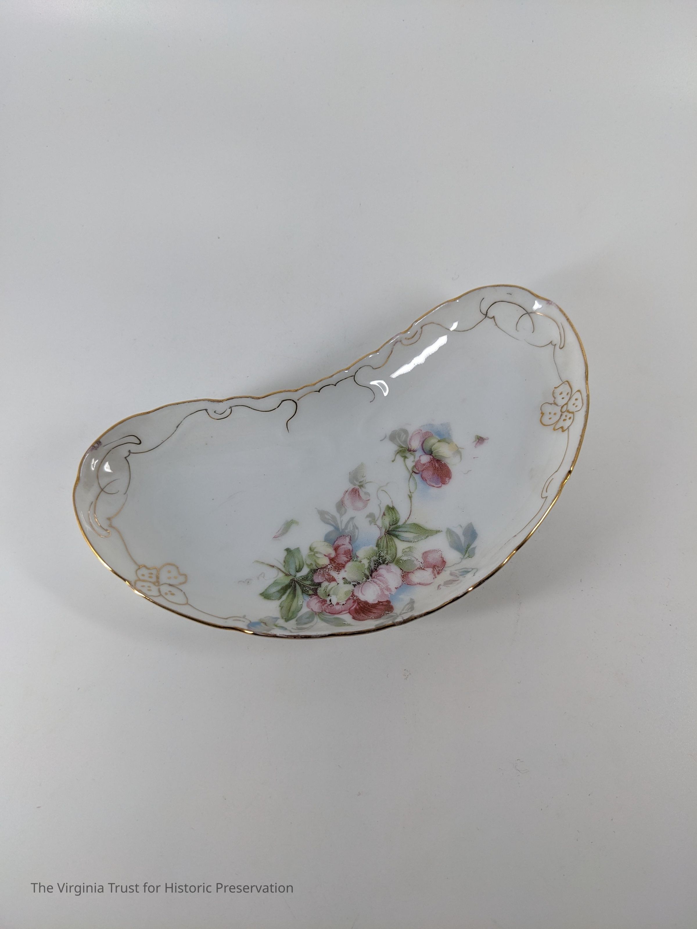 Part of a 32 piece set (2 large plates, 6 small plates, 6 cup plates, 6 deep saucers, 6 cups, 6 bone plates). Rose and blue floral design. Fine gold line rim.