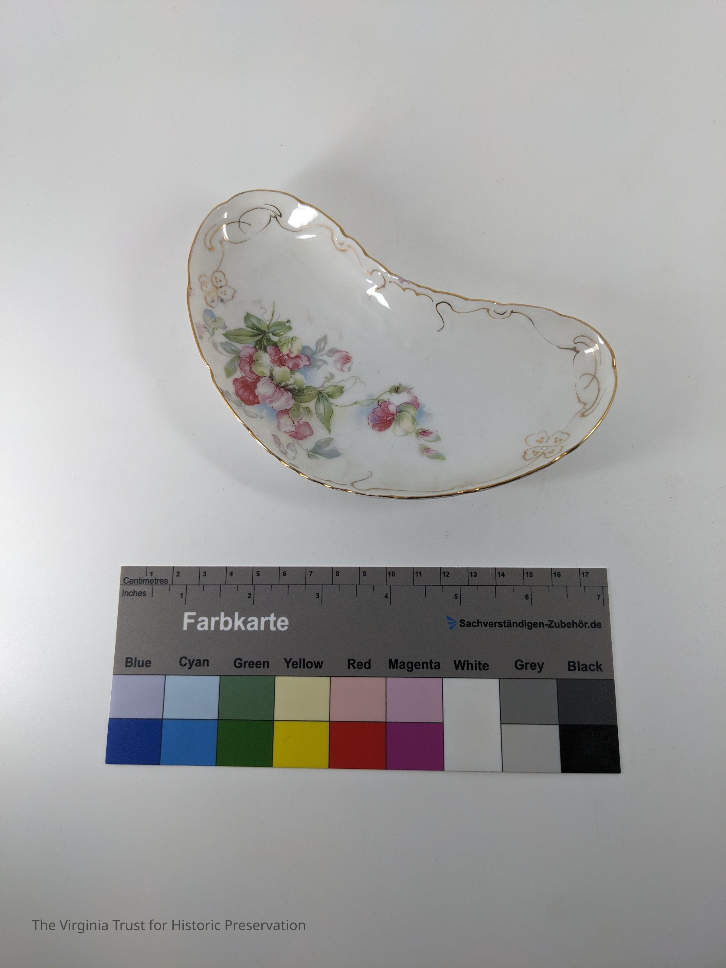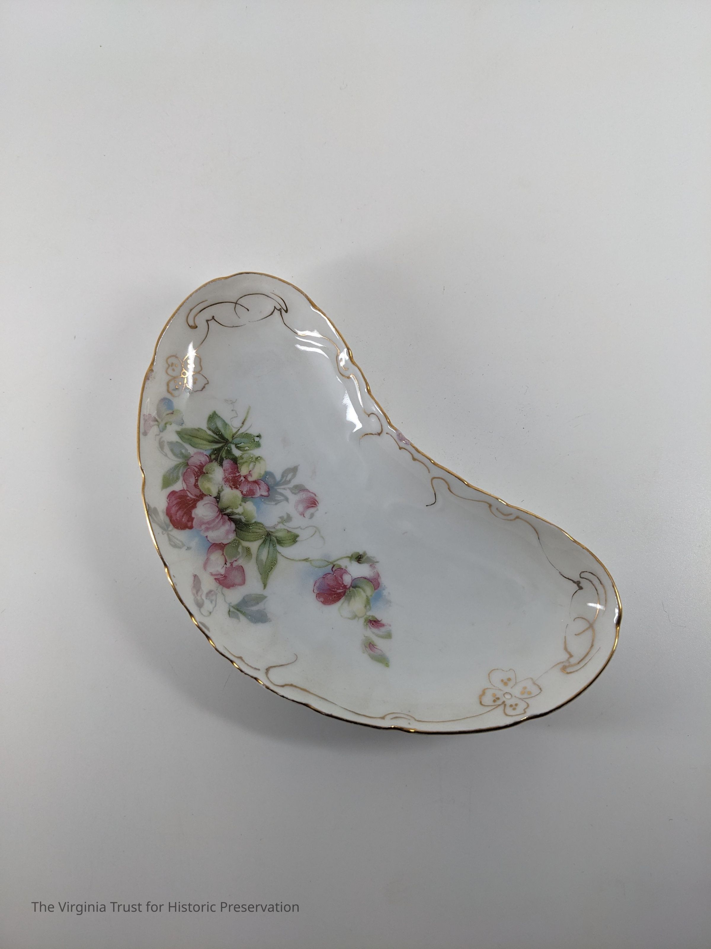 Part of a 32 piece set (2 large plates, 6 small plates, 6 cup plates, 6 deep saucers, 6 cups, 6 bone plates). Rose and blue floral design. Fine gold line rim.
