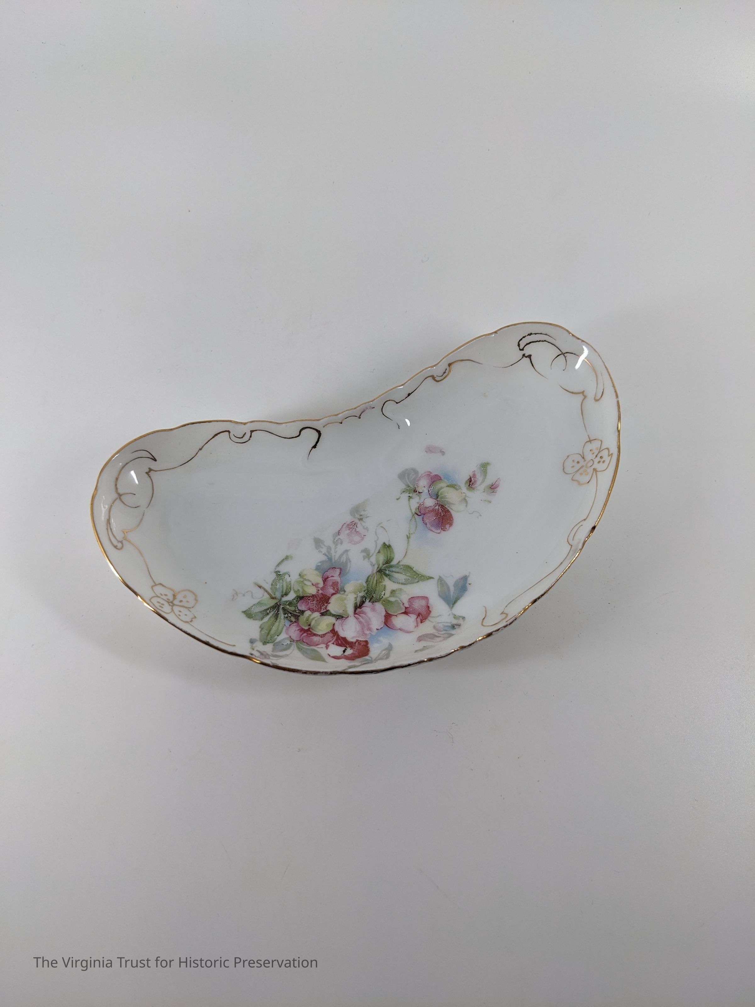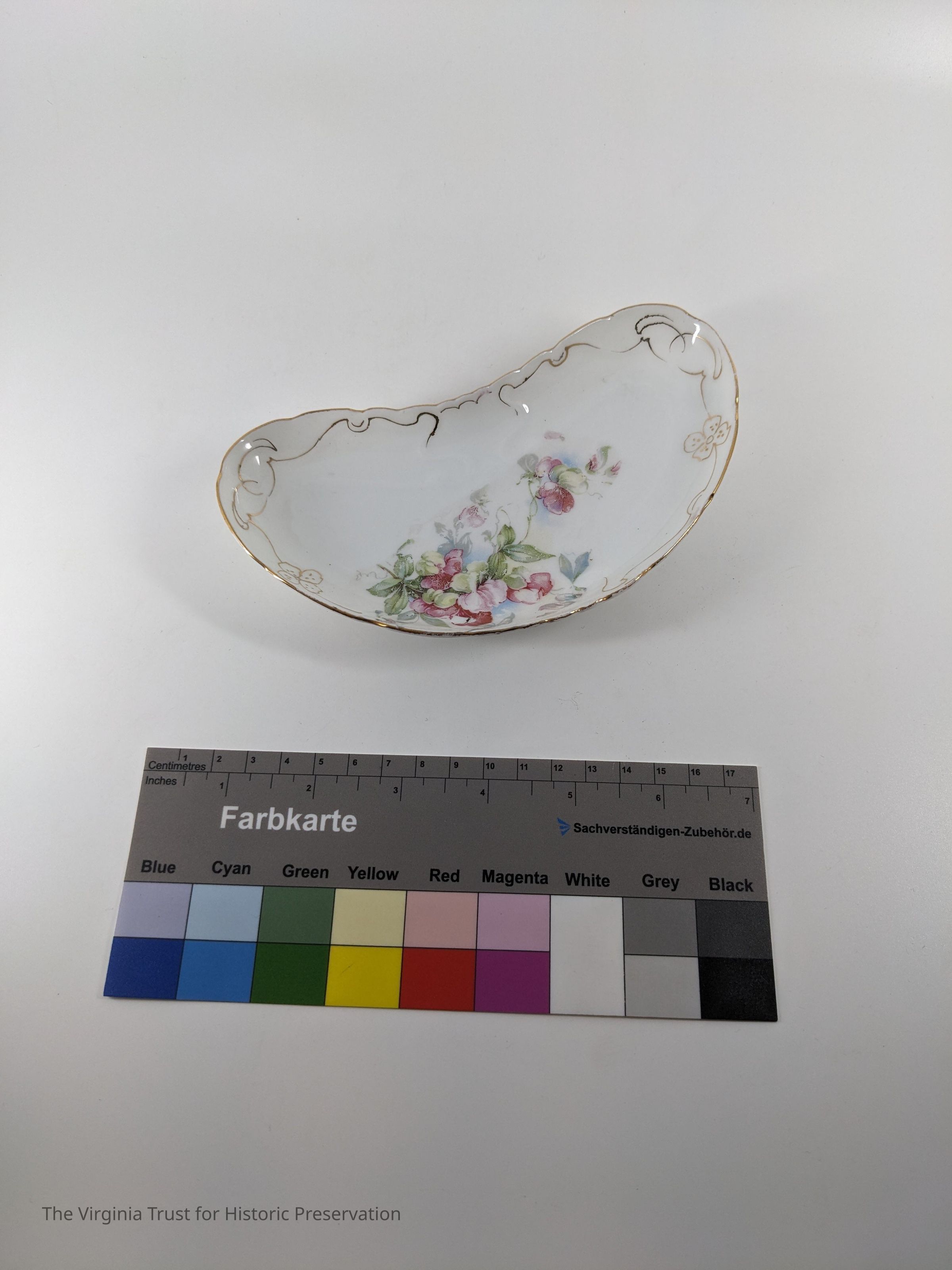 Part of a 32 piece set (2 large plates, 6 small plates, 6 cup plates, 6 deep saucers, 6 cups, 6 bone plates). Rose and blue floral design. Fine gold line rim.