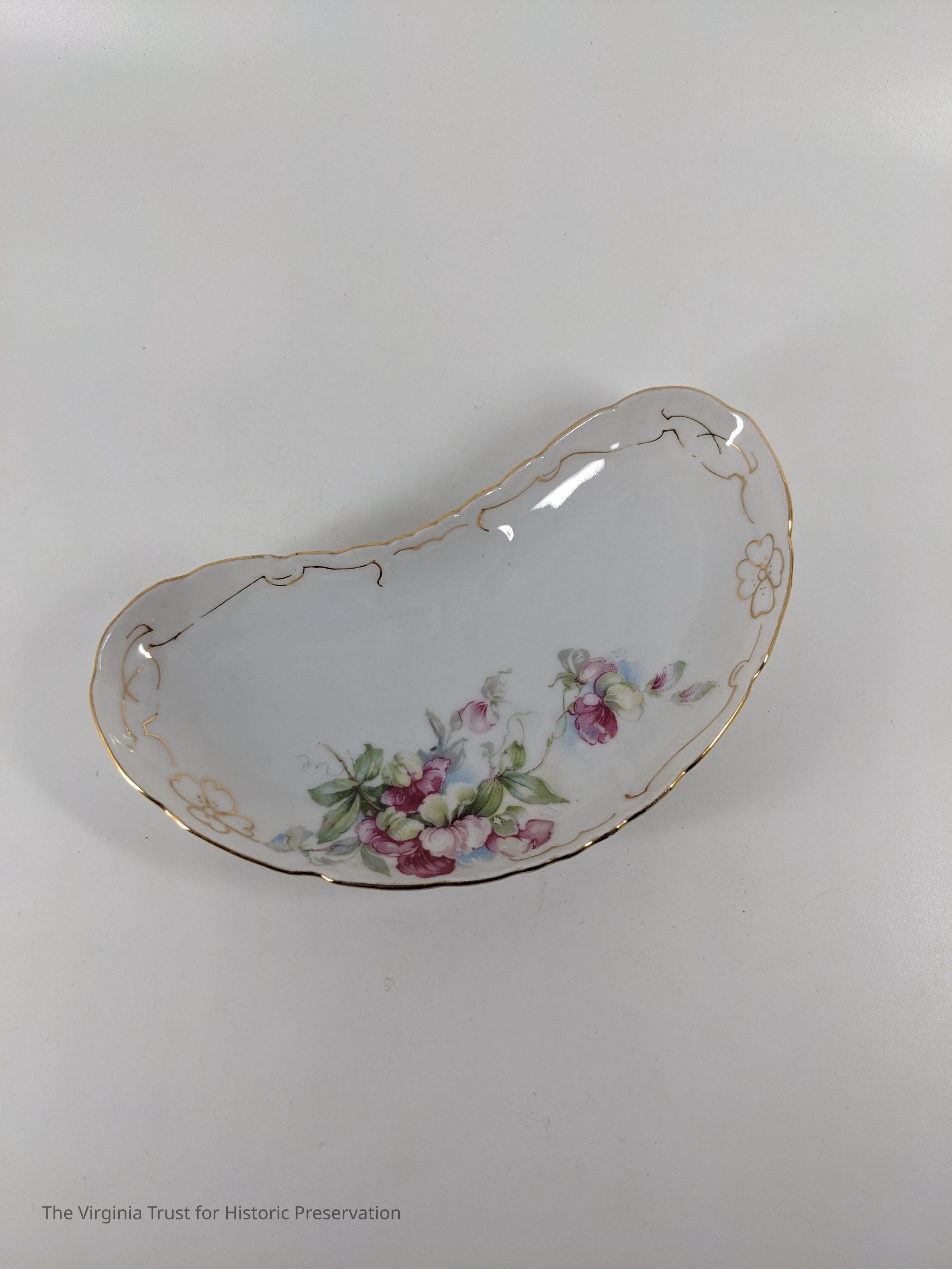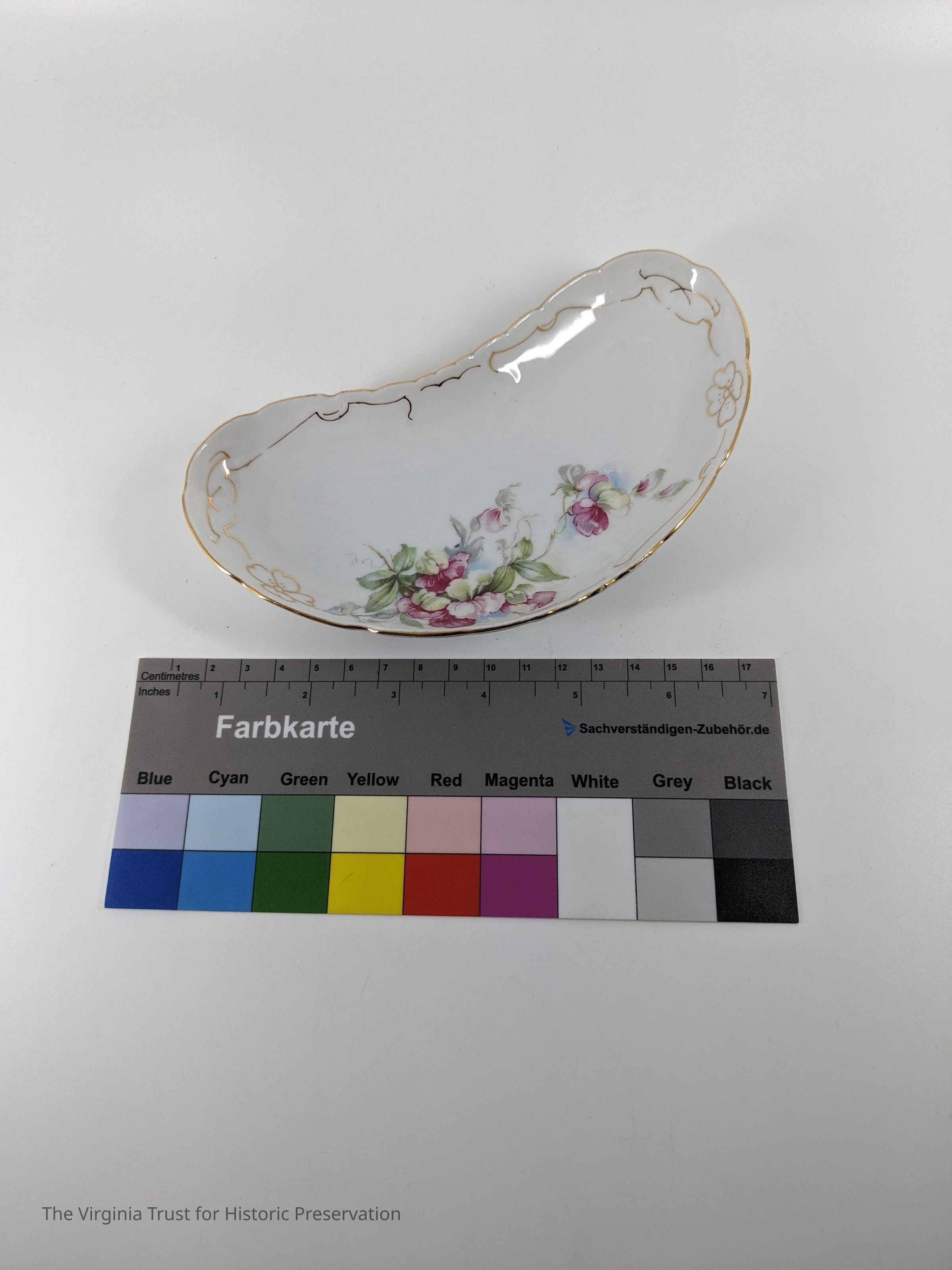 Part of a 32 piece set (2 large plates, 6 small plates, 6 cup plates, 6 deep saucers, 6 cups, 6 bone plates). Rose and blue floral design. Fine gold line rim.
