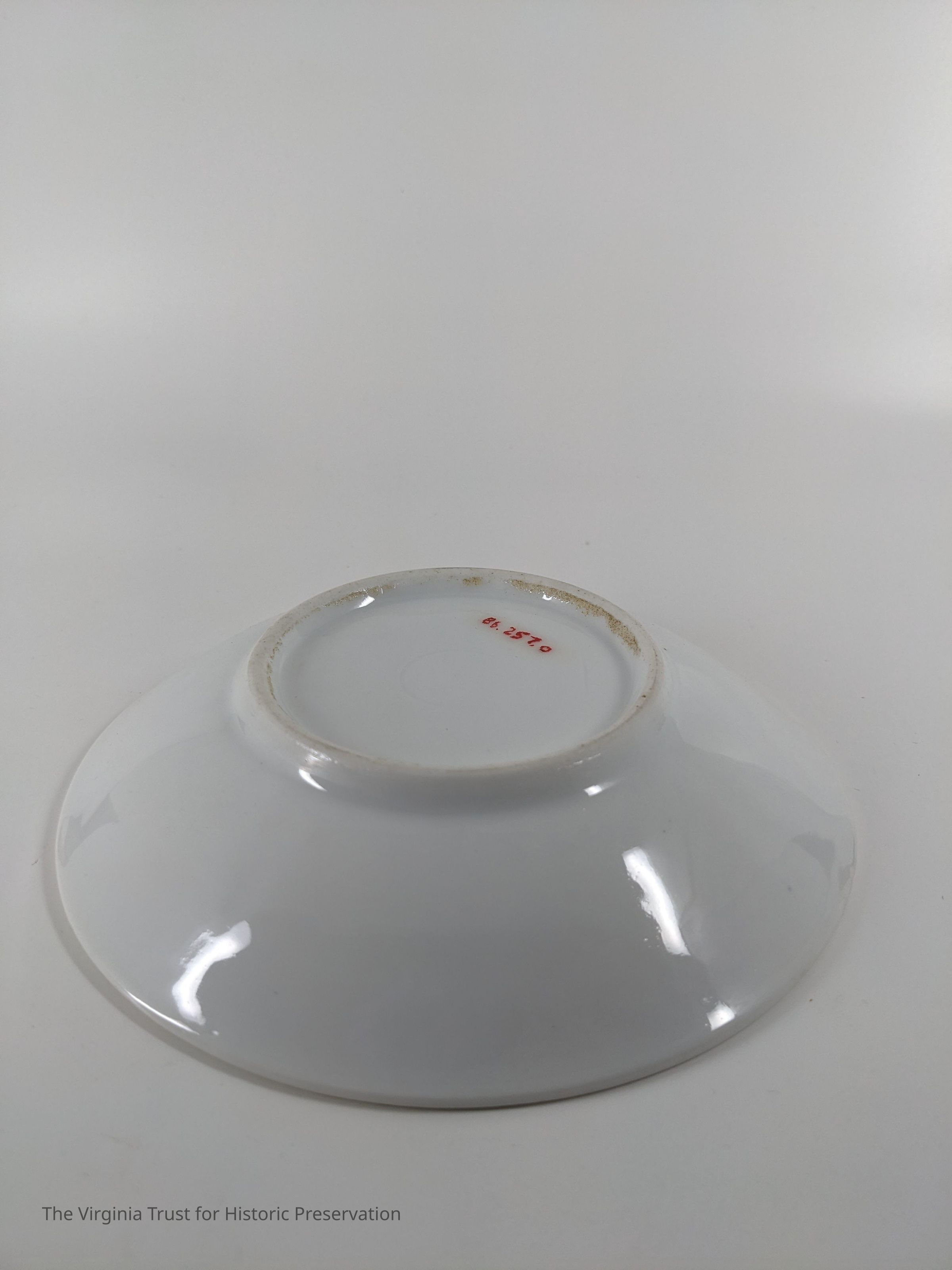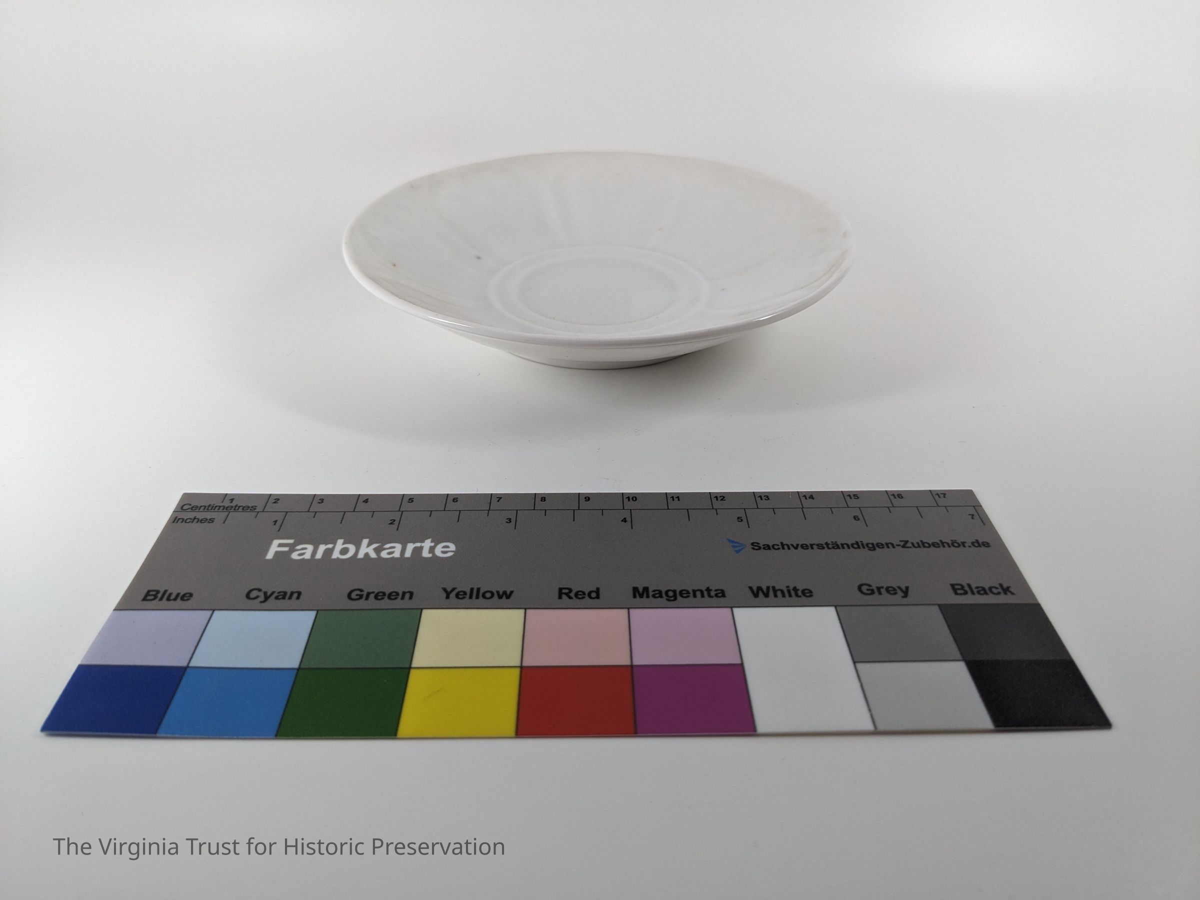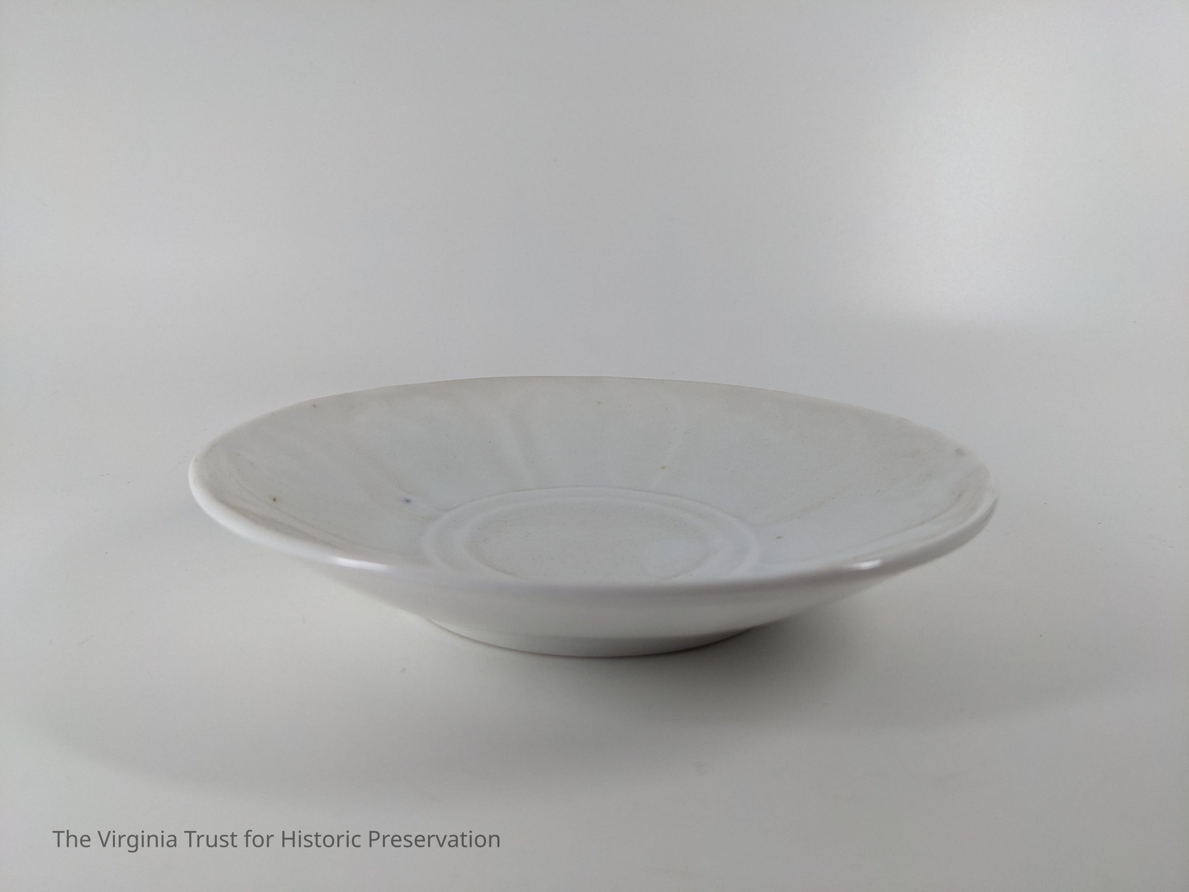 Part of a 32 piece set (2 large plates, 6 small plates, 6 cup plates, 6 deep saucers, 6 cups, 6 bone plates). Plain white with raised edging and flower design.