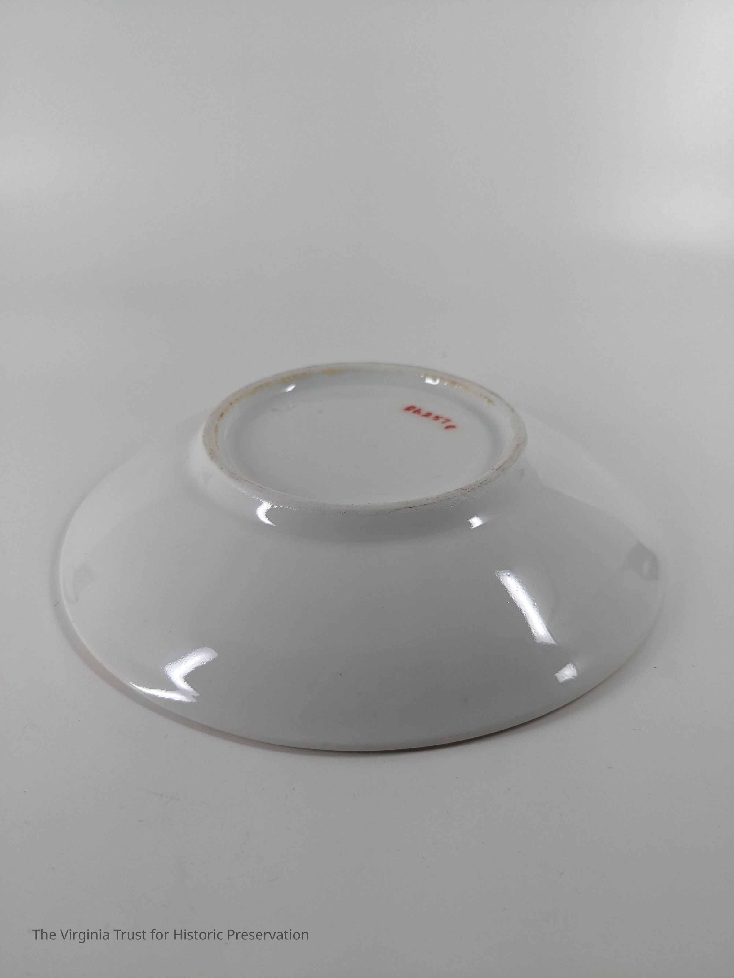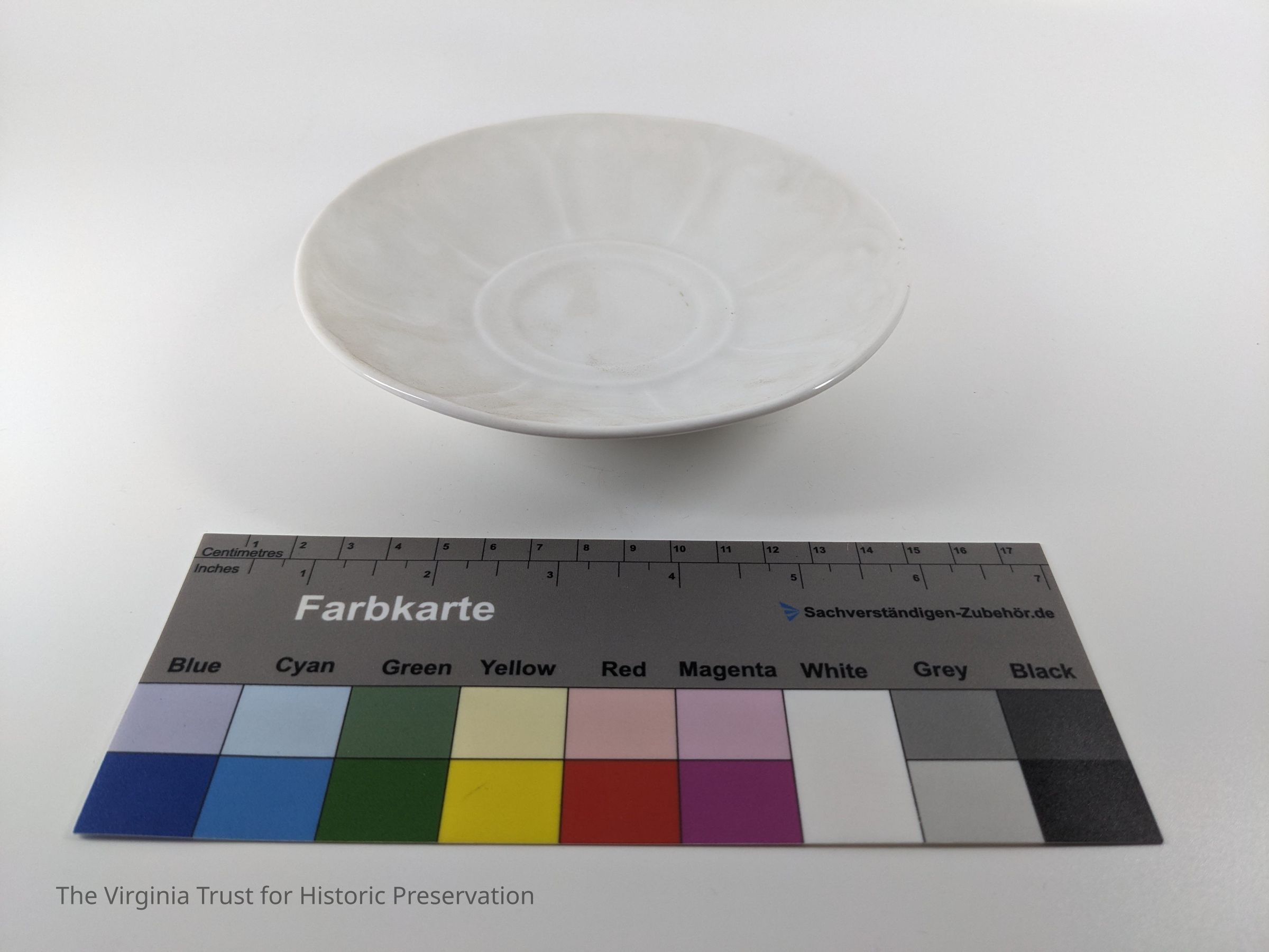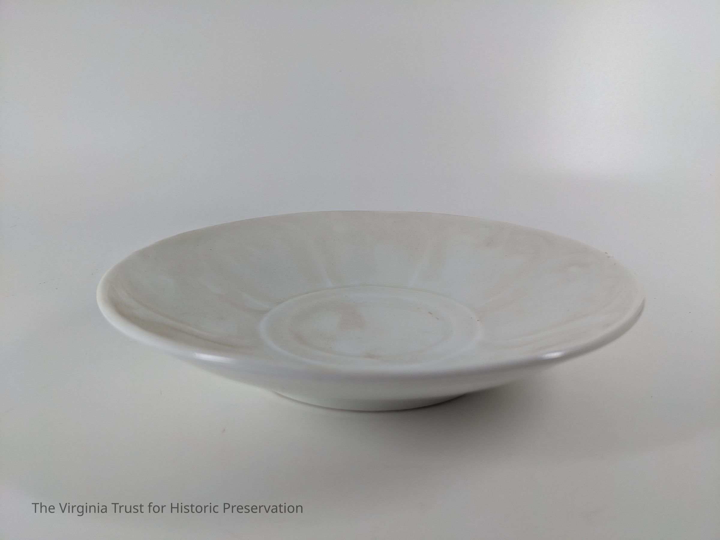 Part of a 32 piece set (2 large plates, 6 small plates, 6 cup plates, 6 deep saucers, 6 cups, 6 bone plates). Plain white with raised edging and flower design.