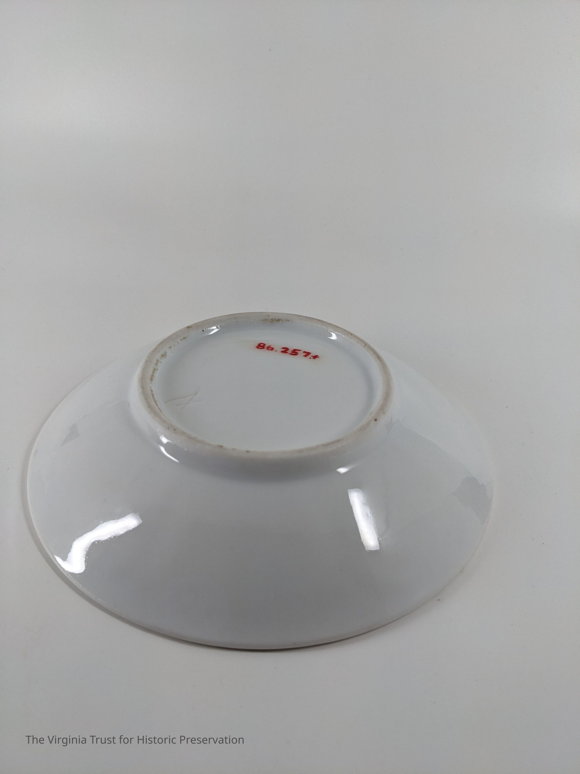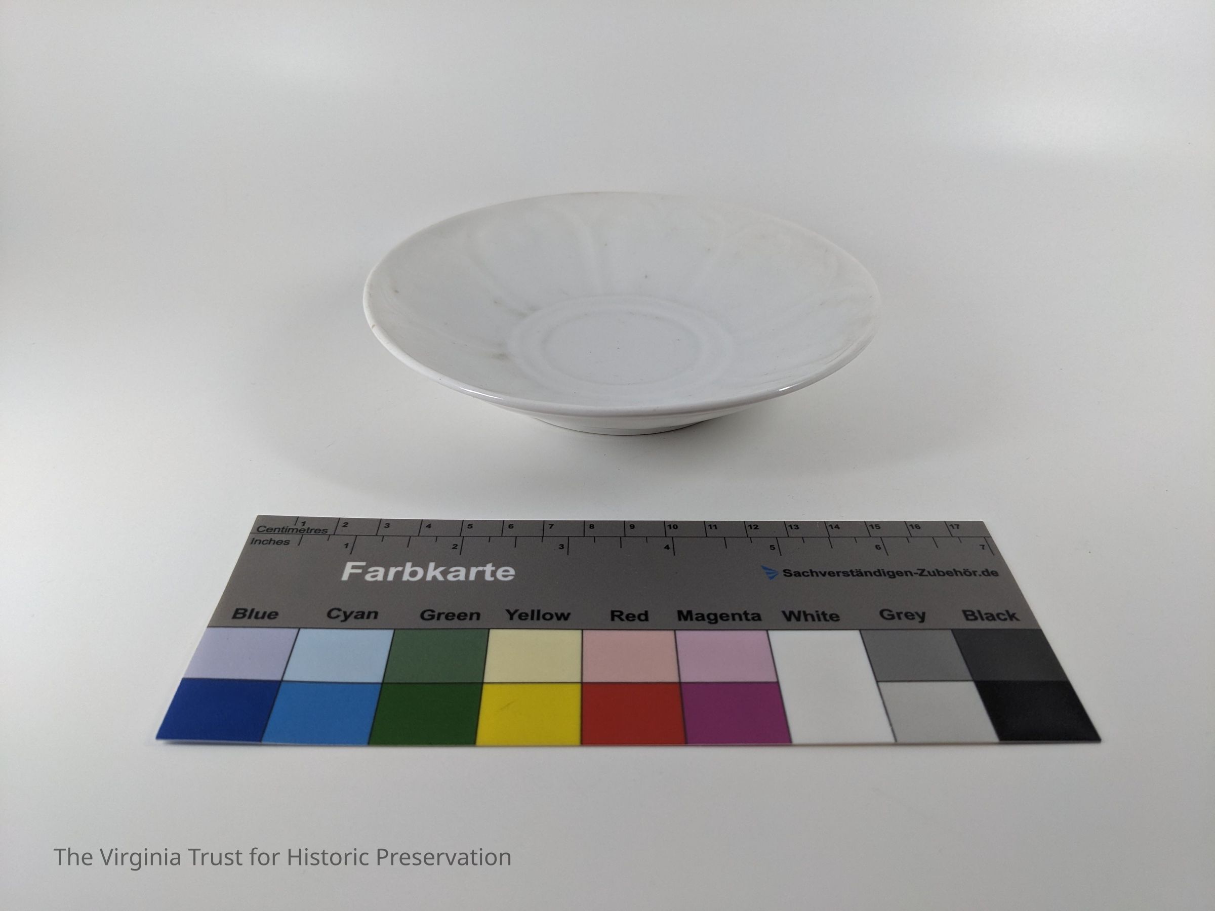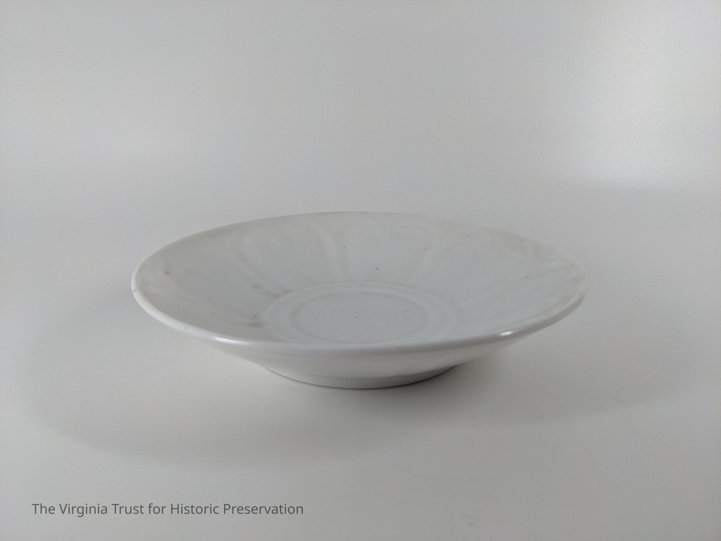 Part of a 32 piece set (2 large plates, 6 small plates, 6 cup plates, 6 deep saucers, 6 cups, 6 bone plates). Plain white with raised edging and flower design.