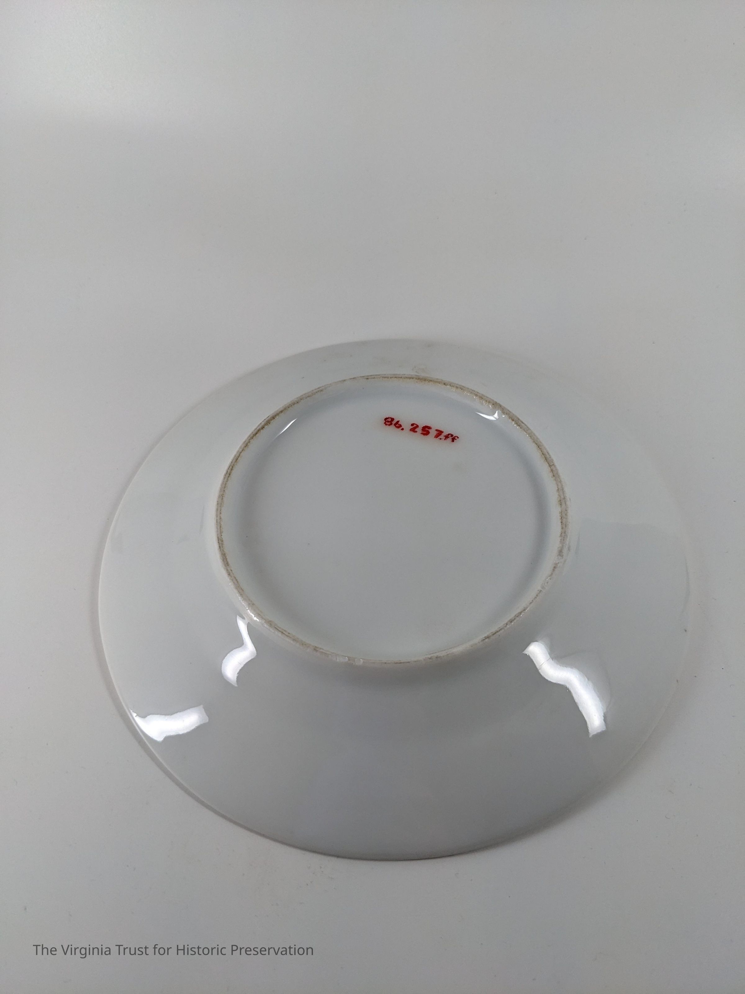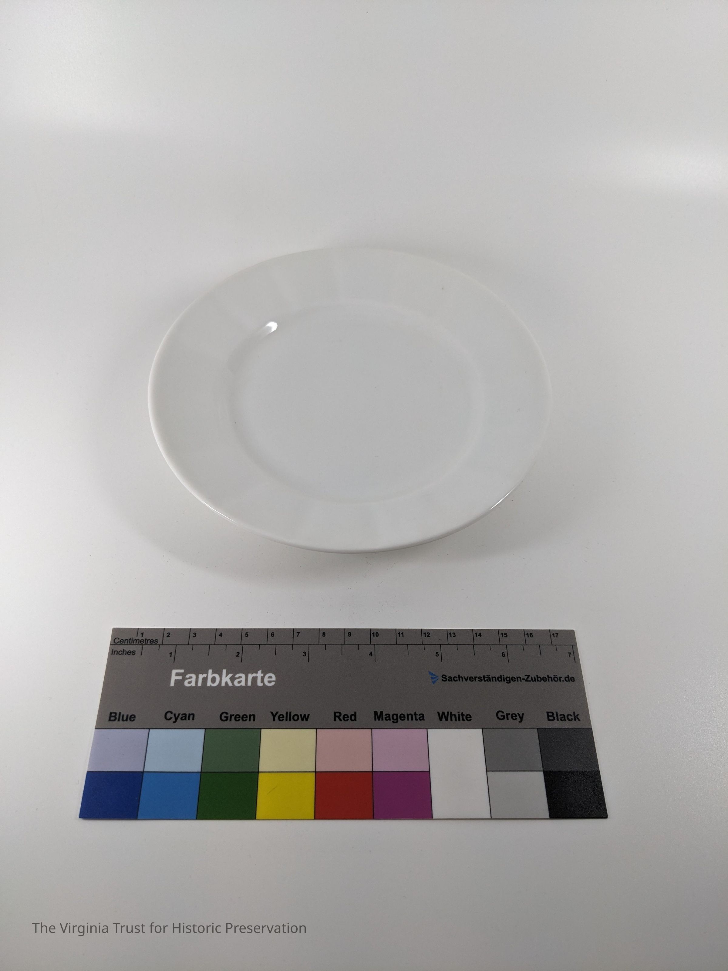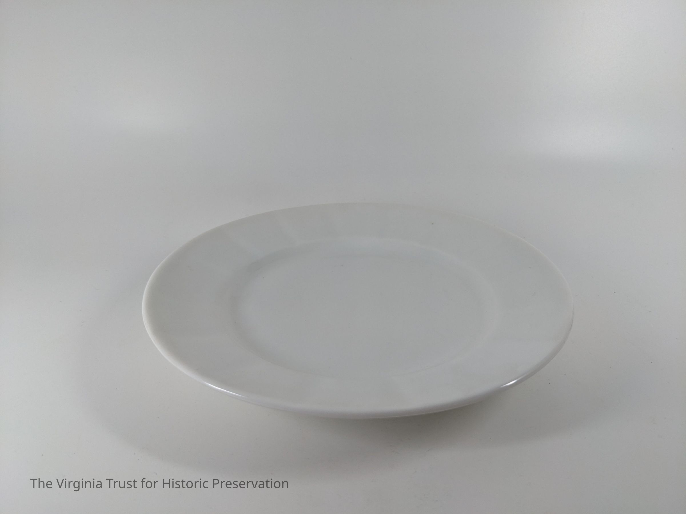 Part of a 32 piece set (2 large plates, 6 small plates, 6 cup plates, 6 deep saucers, 6 cups, 6 bone plates). Plain white with raised edging and flower design.