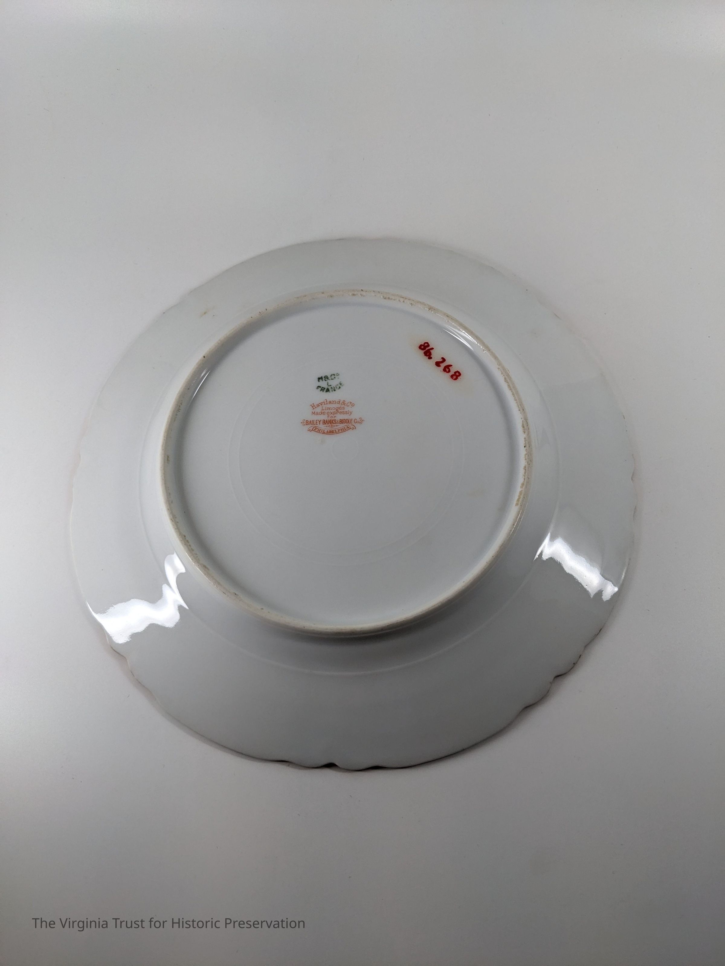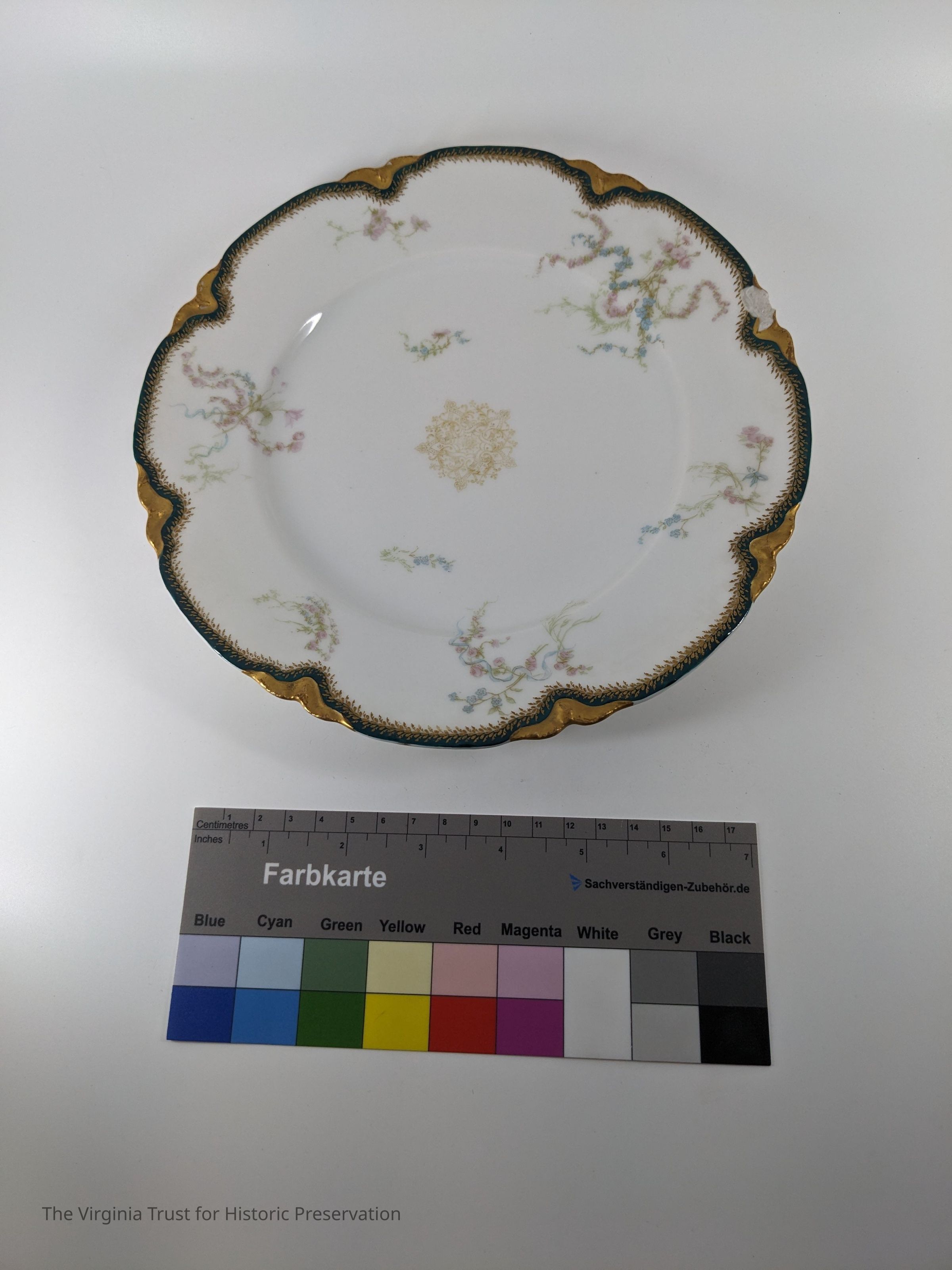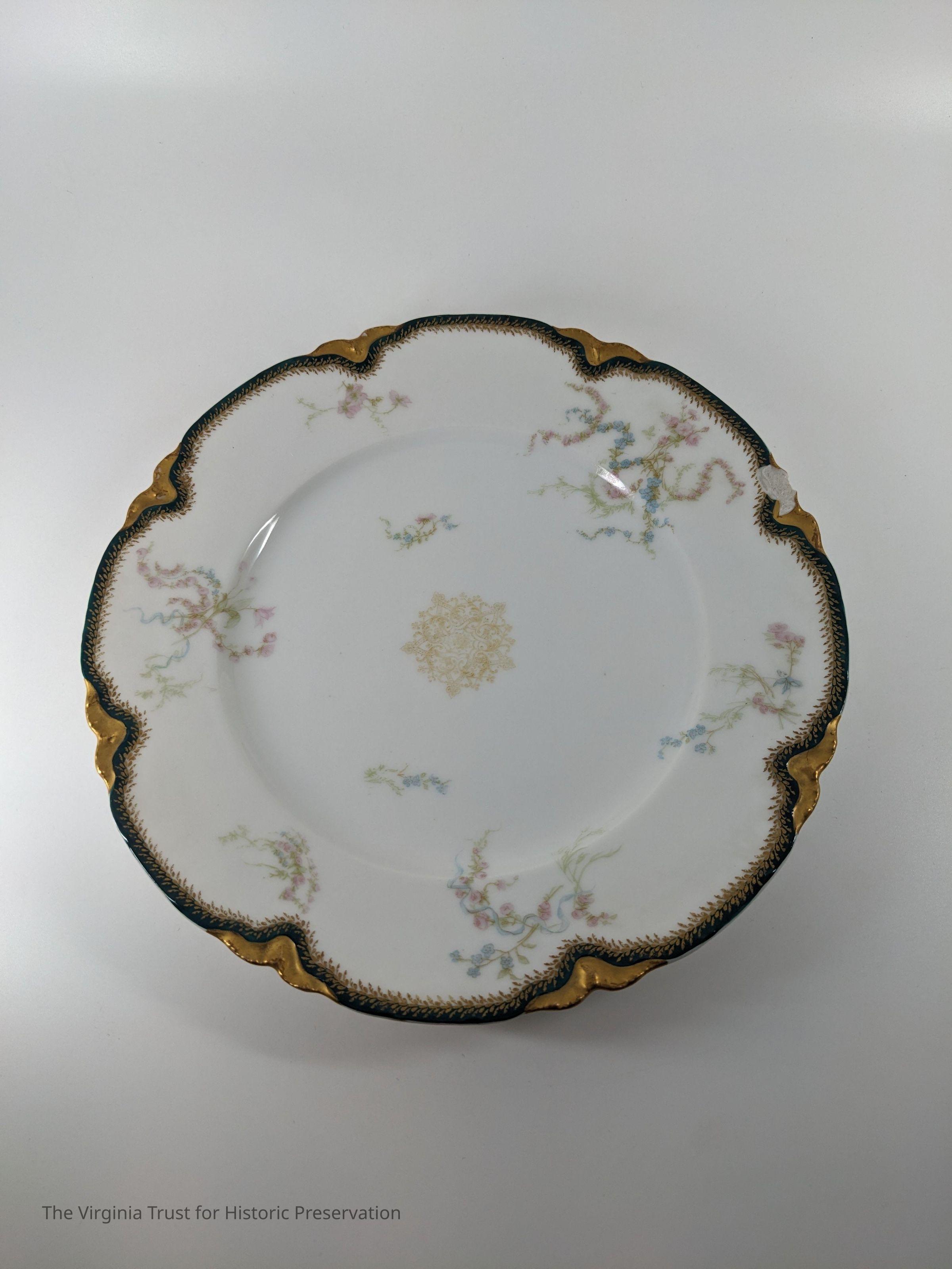 One of 11 dessert plates with pale pattern of blue/green floral designs and gold center. Marked "Haviland & Co. Limoges, Made for Bailey, Banks, and Biddle, Phil. H 7 Co. France."